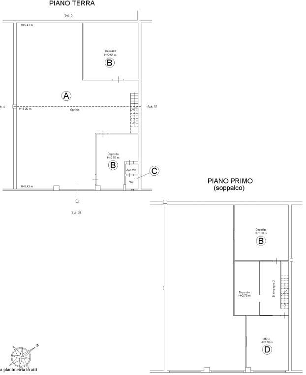 Il capannone strutturato su due livelli di cui il piano terra con deposito bagno e antibagno ed il primo piano con accesso tramite scala interna con area deposito ed ufficio.
