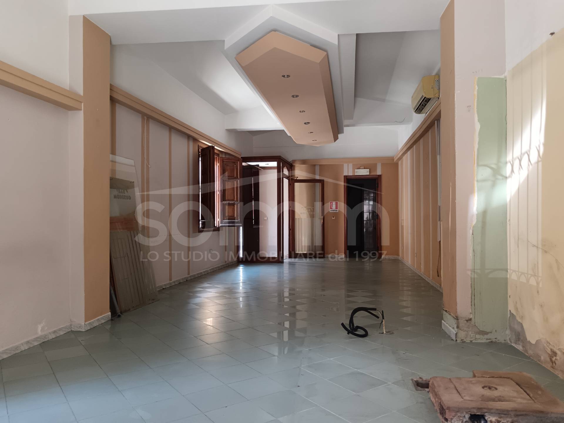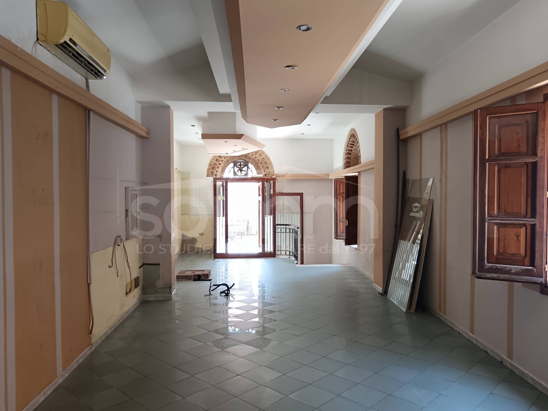 Il locale si sviluppa principalmente al piano terra, con ingresso sia dalla via Roma che dalla via Petrarca, ed costituito da un ambiente unico di circa 55 mq, 3 bagni e spogliatoio.