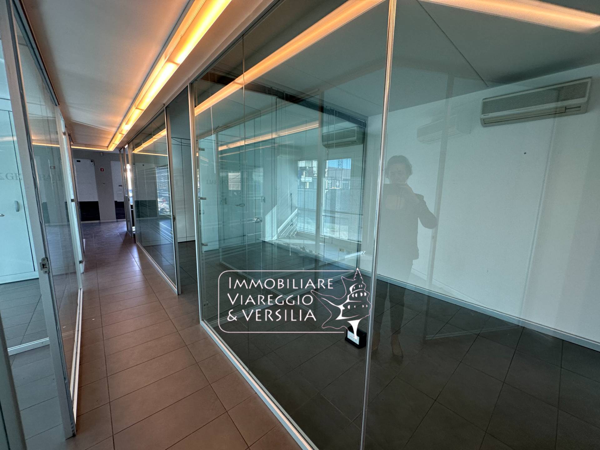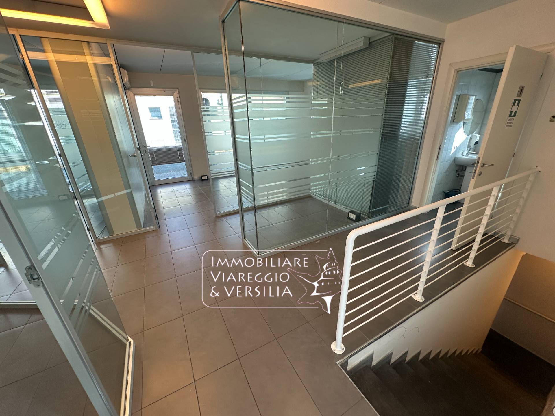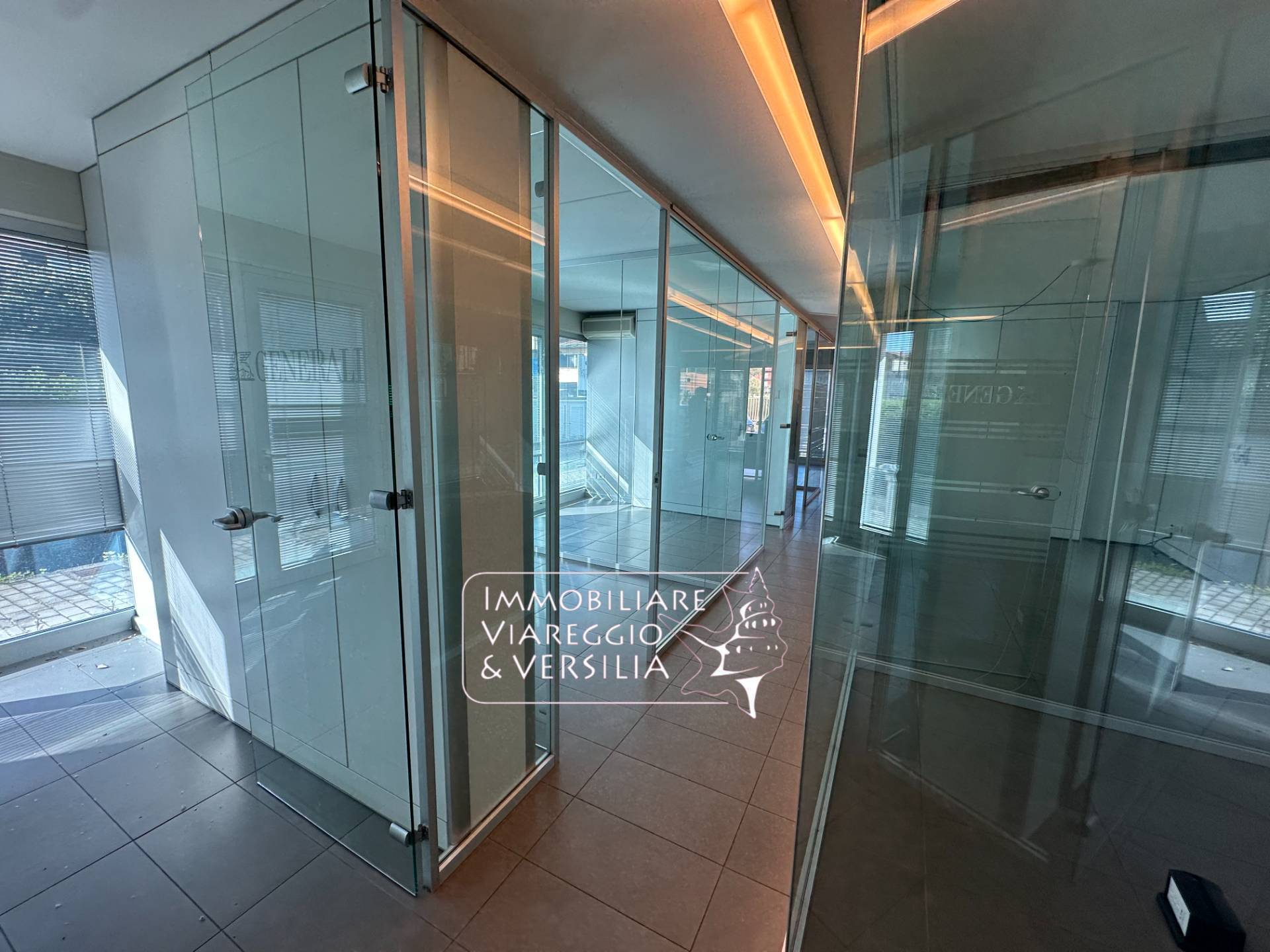 Viareggio - prima periferia in palazzina moderna e di design edin posizione altamente visibile SI VENDE elegante ufficio/fondo commerciale di mq 500 posto su 2 livelli Al piano terreno, l'ufficio stato diviso in 13 uffici con pareti a vetri oltre 2 vani ripostiglio, un vano fotocopie e bagno.