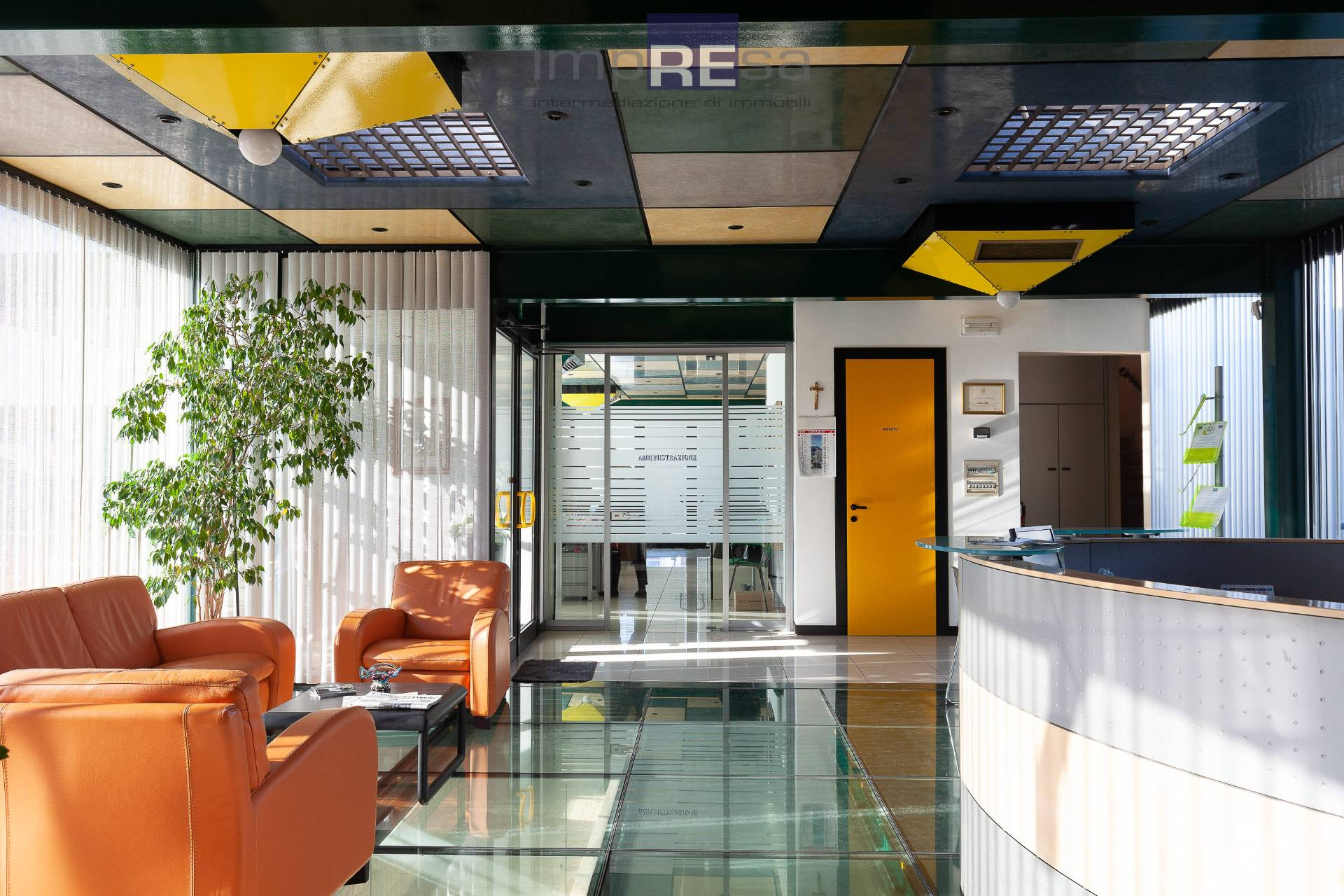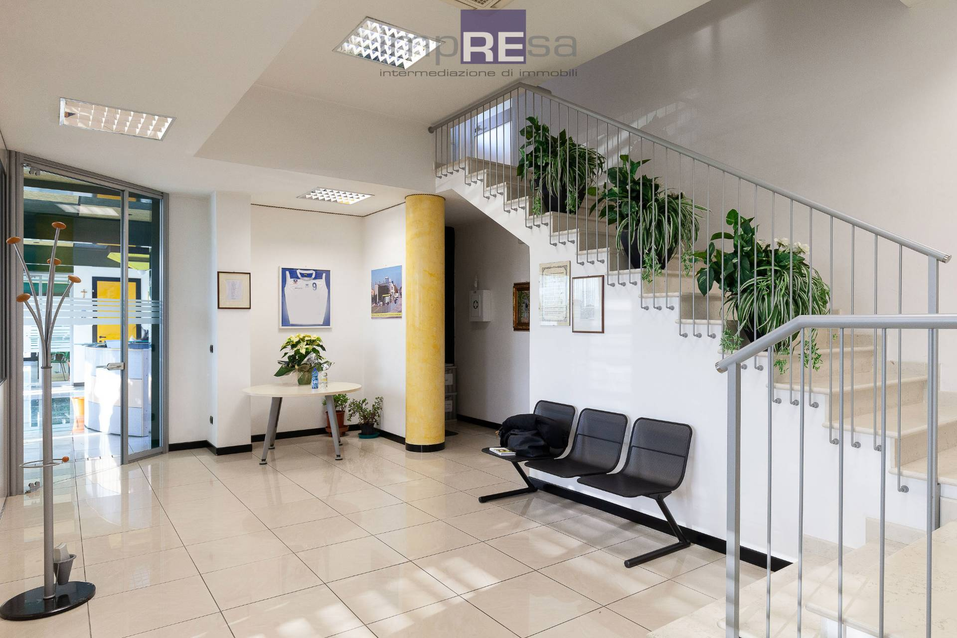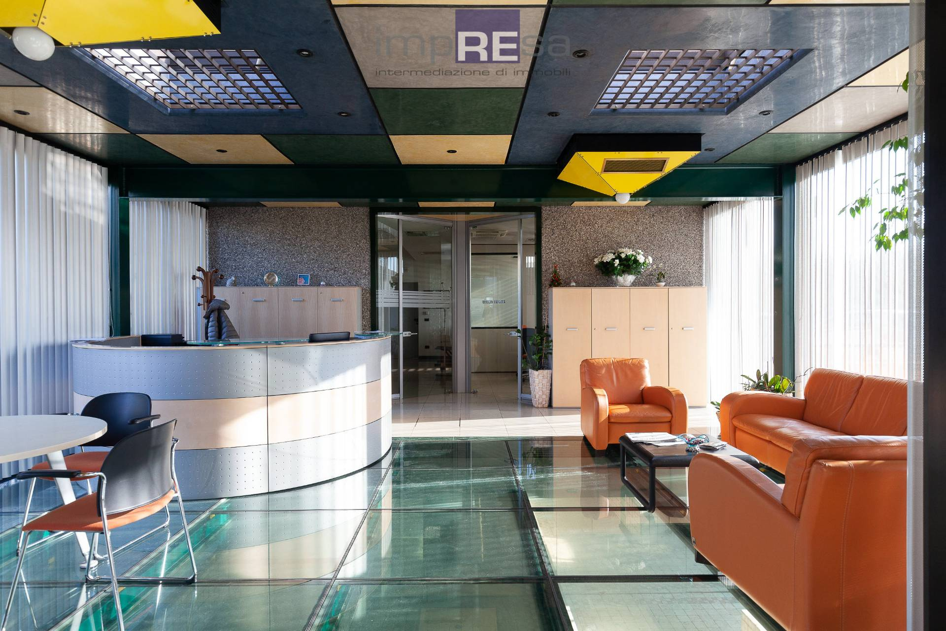 La zona uffici si sviluppa su due piani fuori terra ed cos composta: ingresso su reception, ampio ufficio, bagno con antibagno, disimpegno e due sale contratti; al piano primo disimpegno, ampio bagno e due grandi uffici; raggiungibile da una seconda scala c' un ampio disimpegno, una sala riunioni e un locale espositivo.