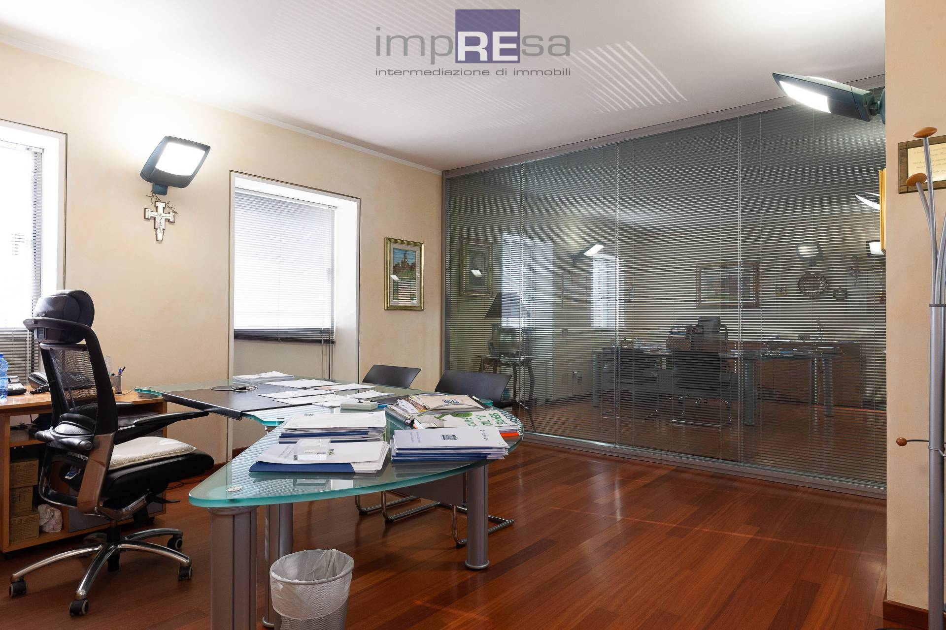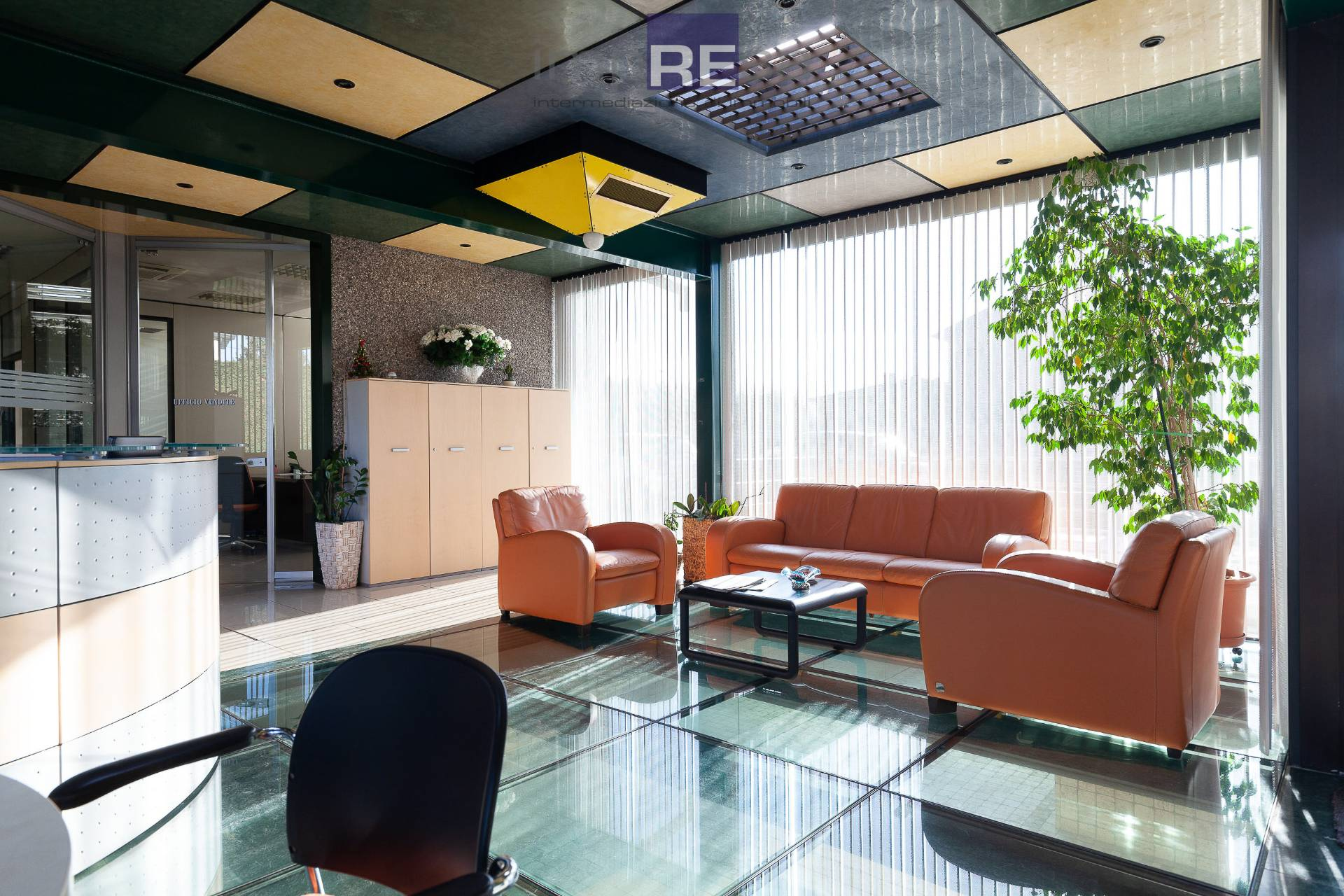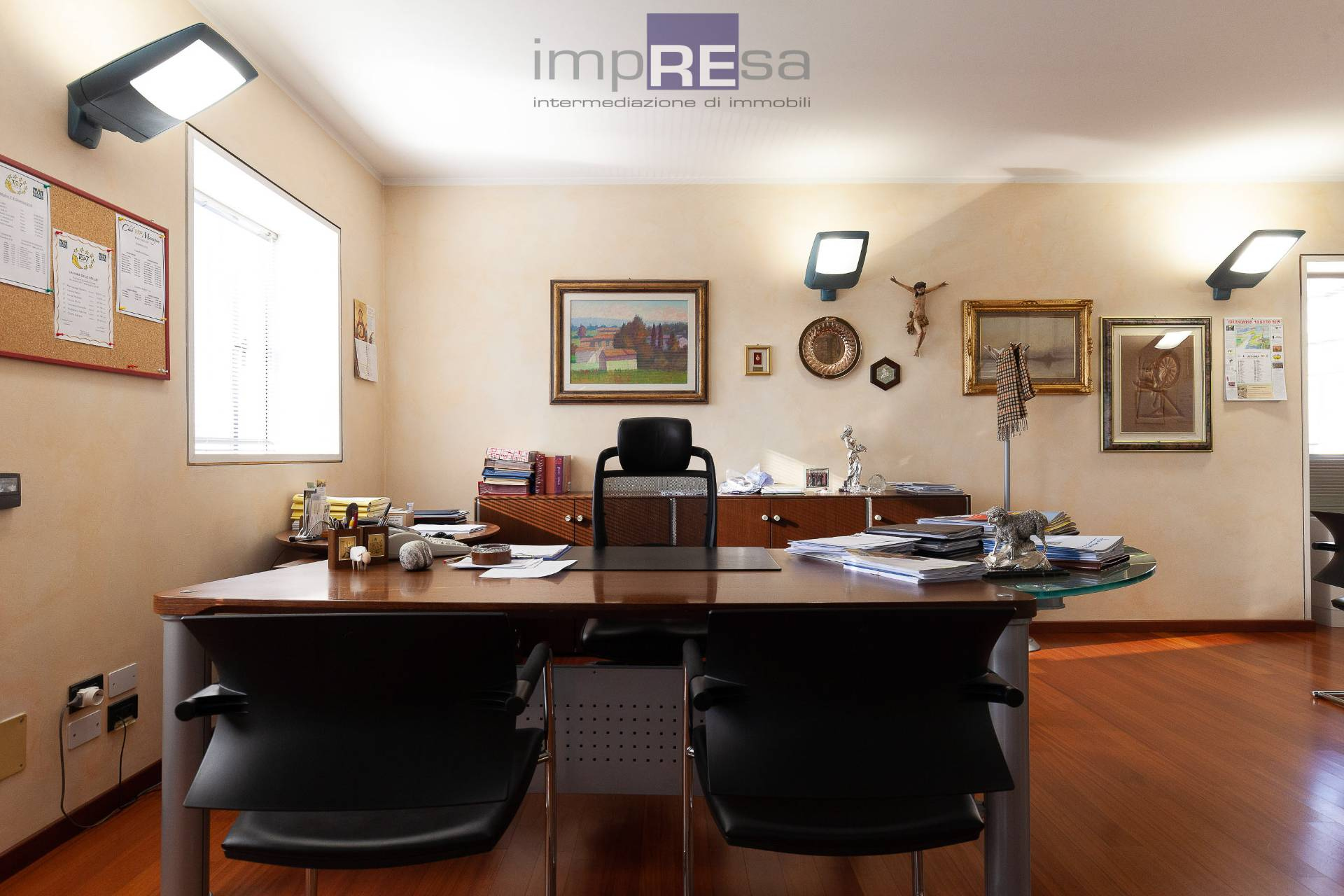La zona uffici si sviluppa su due piani fuori terra ed cos composta: ingresso su reception, ampio ufficio, bagno con antibagno, disimpegno e due sale contratti; al piano primo disimpegno, ampio bagno e due grandi uffici; raggiungibile da una seconda scala c' un ampio disimpegno, una sala riunioni e un locale espositivo.