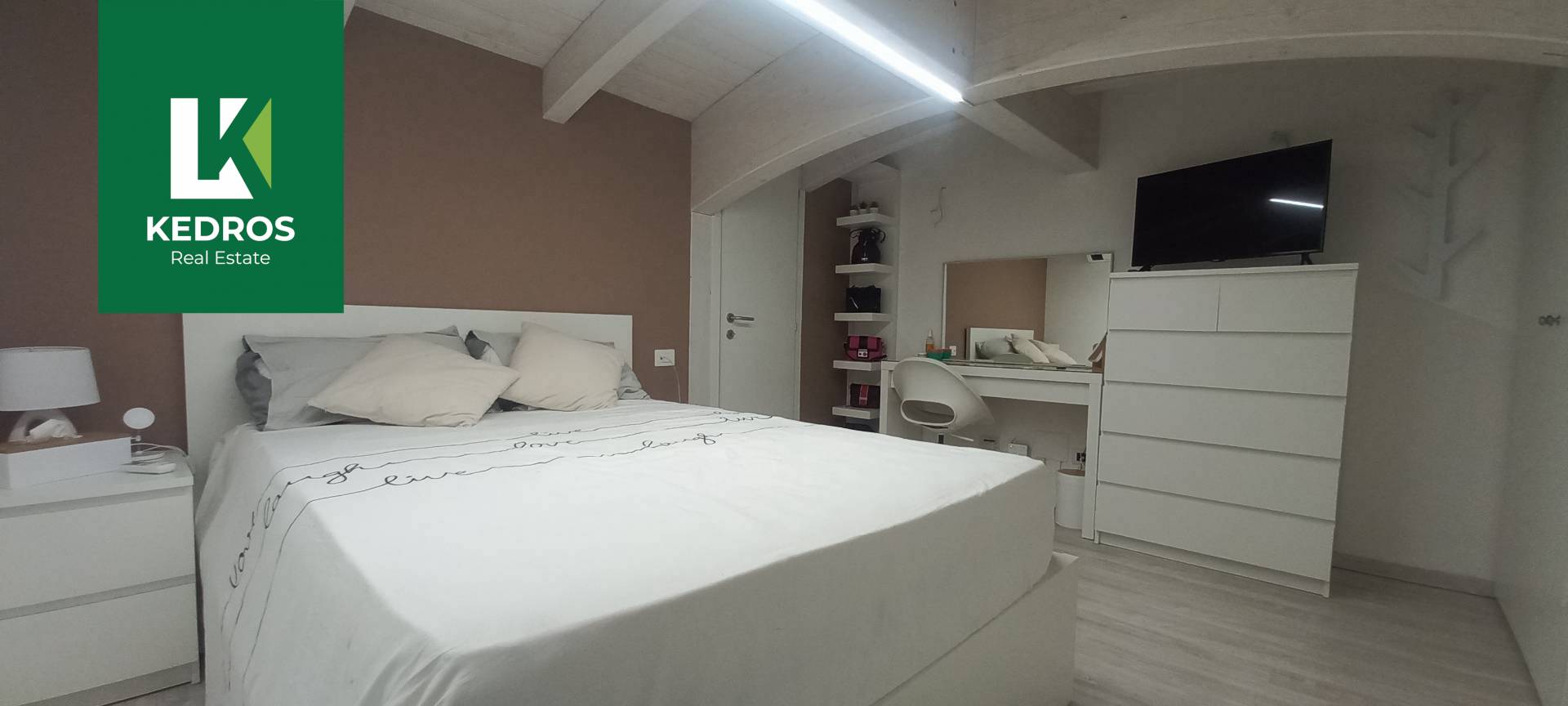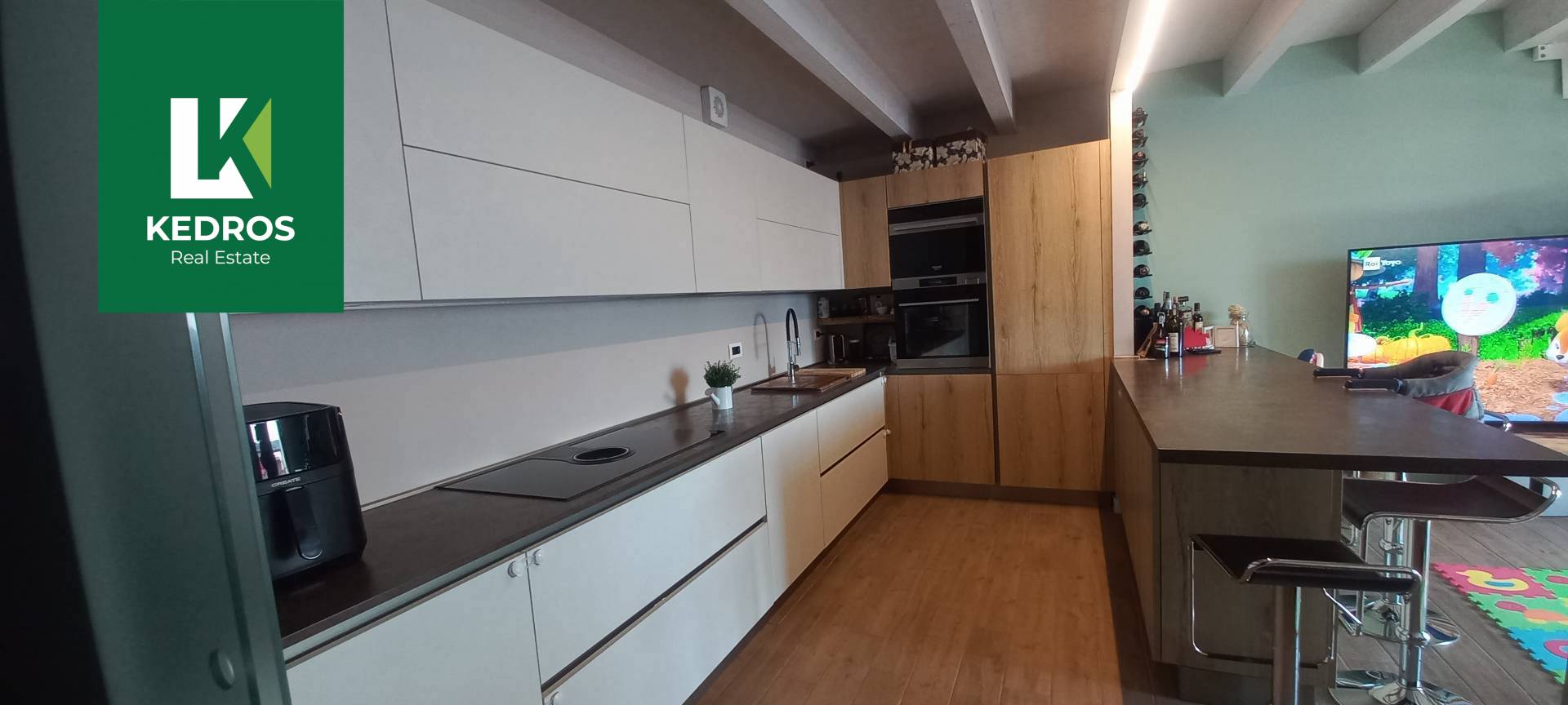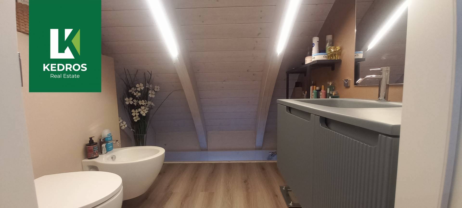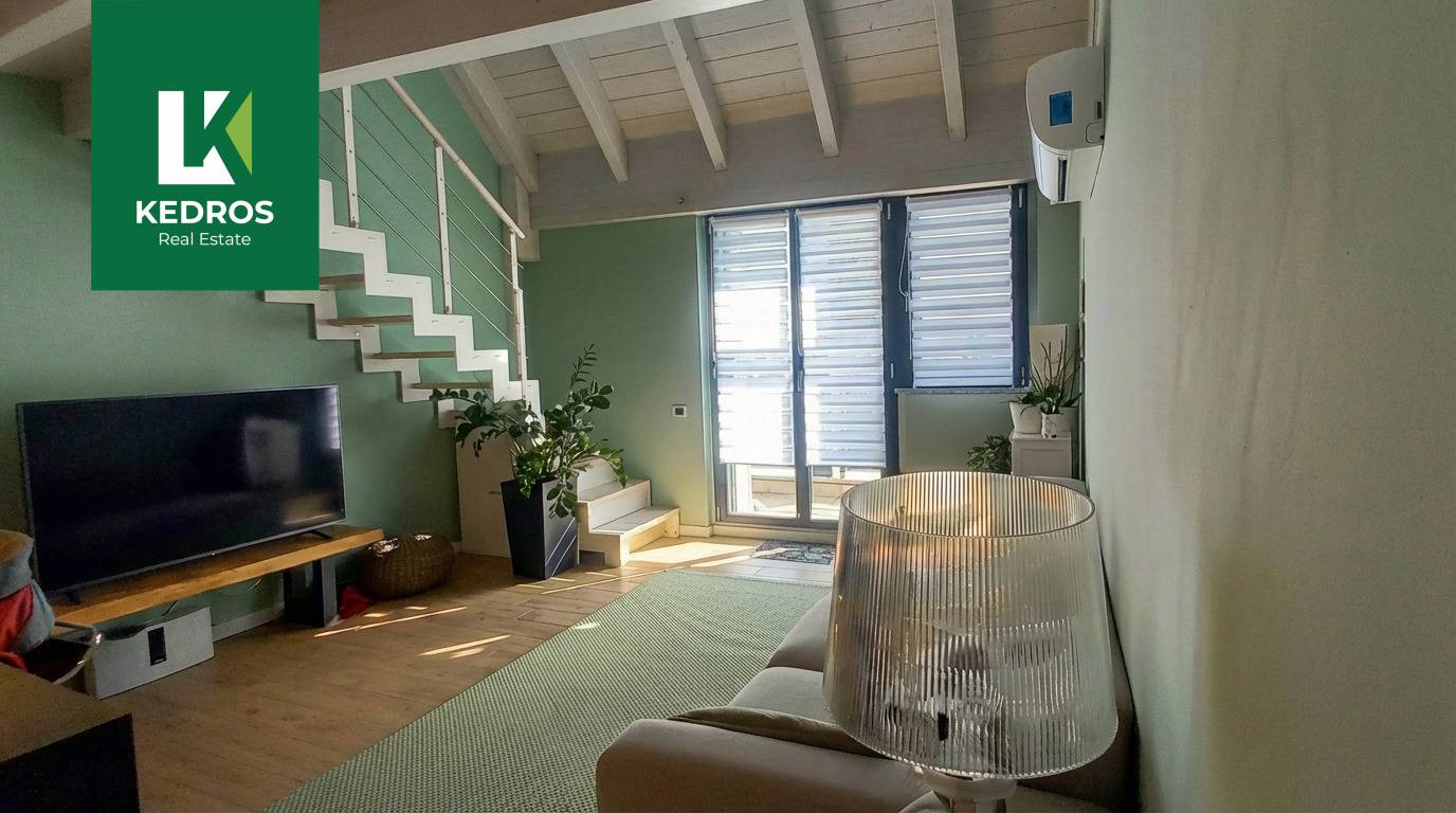 Una elegante scala in legno conduce al secondo livello, dove un ampio soppalco affacciato sul soggiorno, un secondo bagno e un locale separato offrono versatilit e spazi aggiuntivi per studio, seconda camera o zona relax.