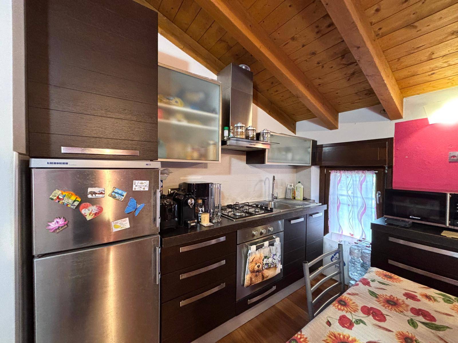 Lingresso si apre direttamente sulla zona giorno, dove la cucina a vista crea un ambiente pratico e funzionale.