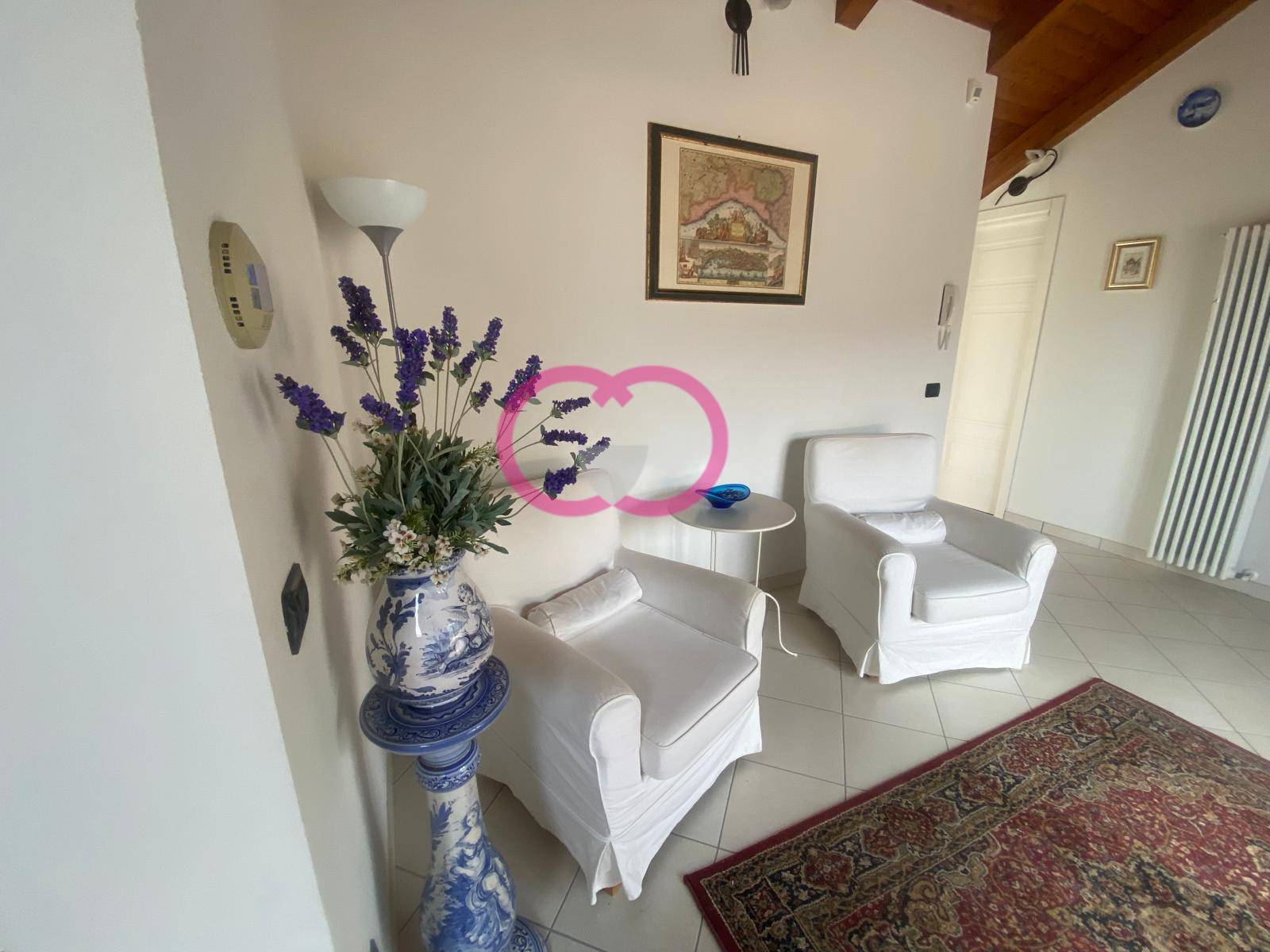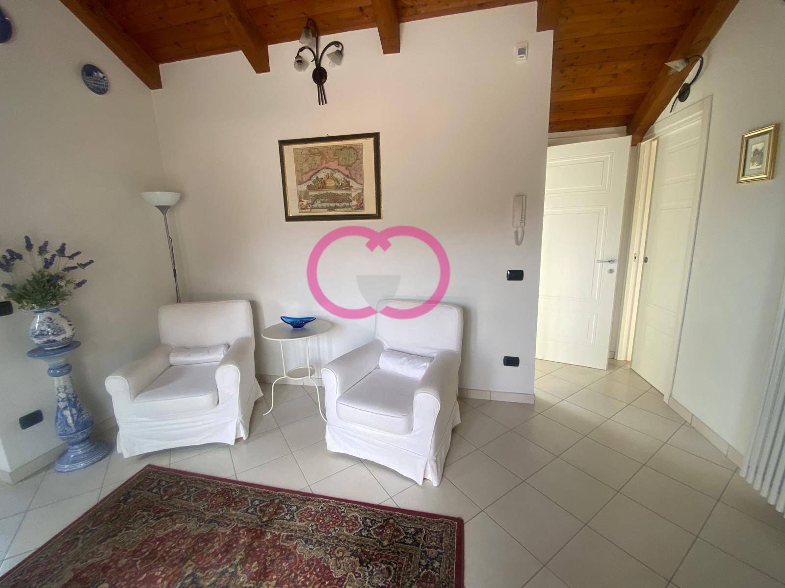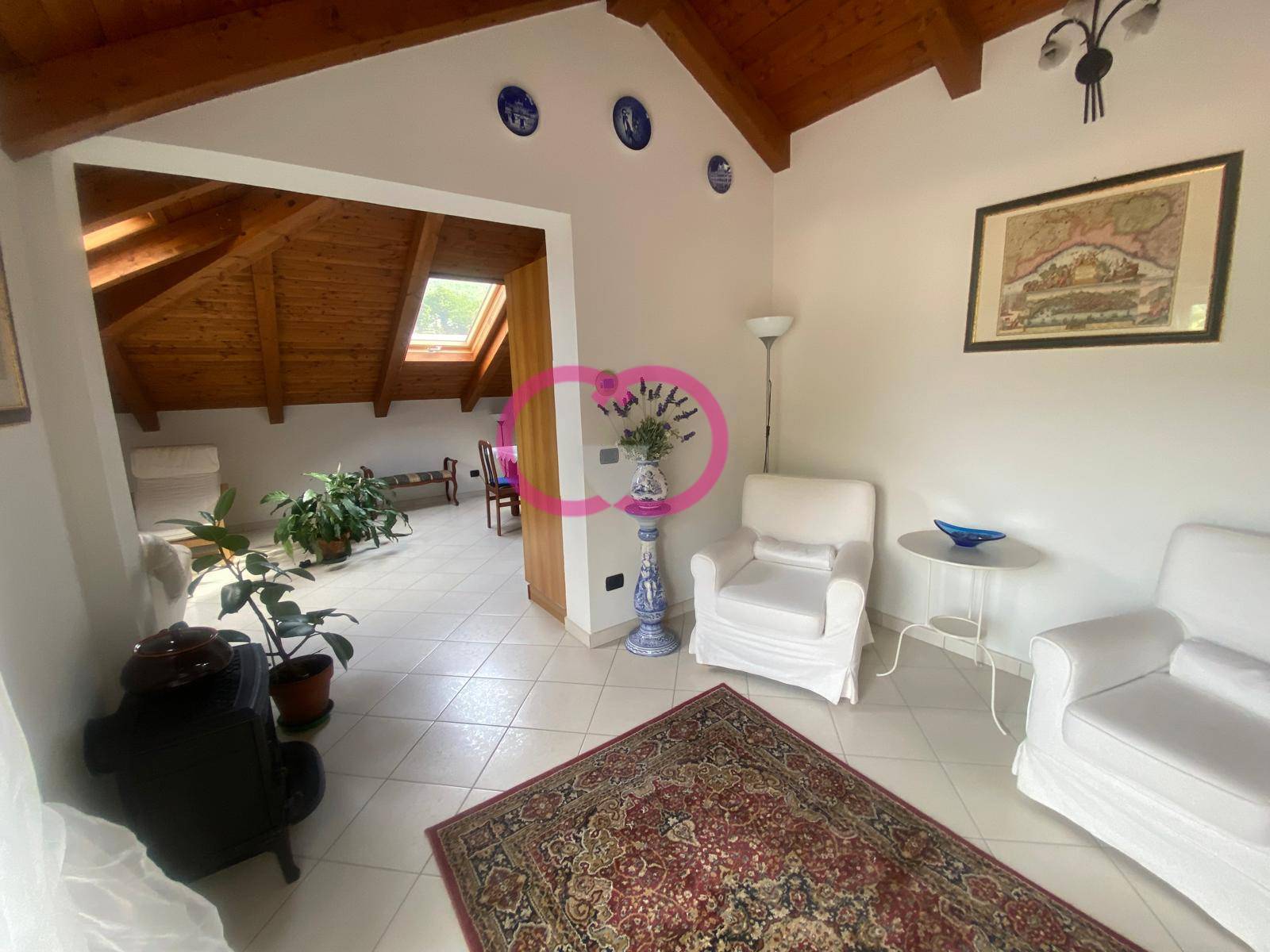 Attraverso lingresso indipendente, saliamo al secondo piano di una villa bifamiliare dove si apre questo affascinante appartamento mansardato, curato in ogni dettaglio.