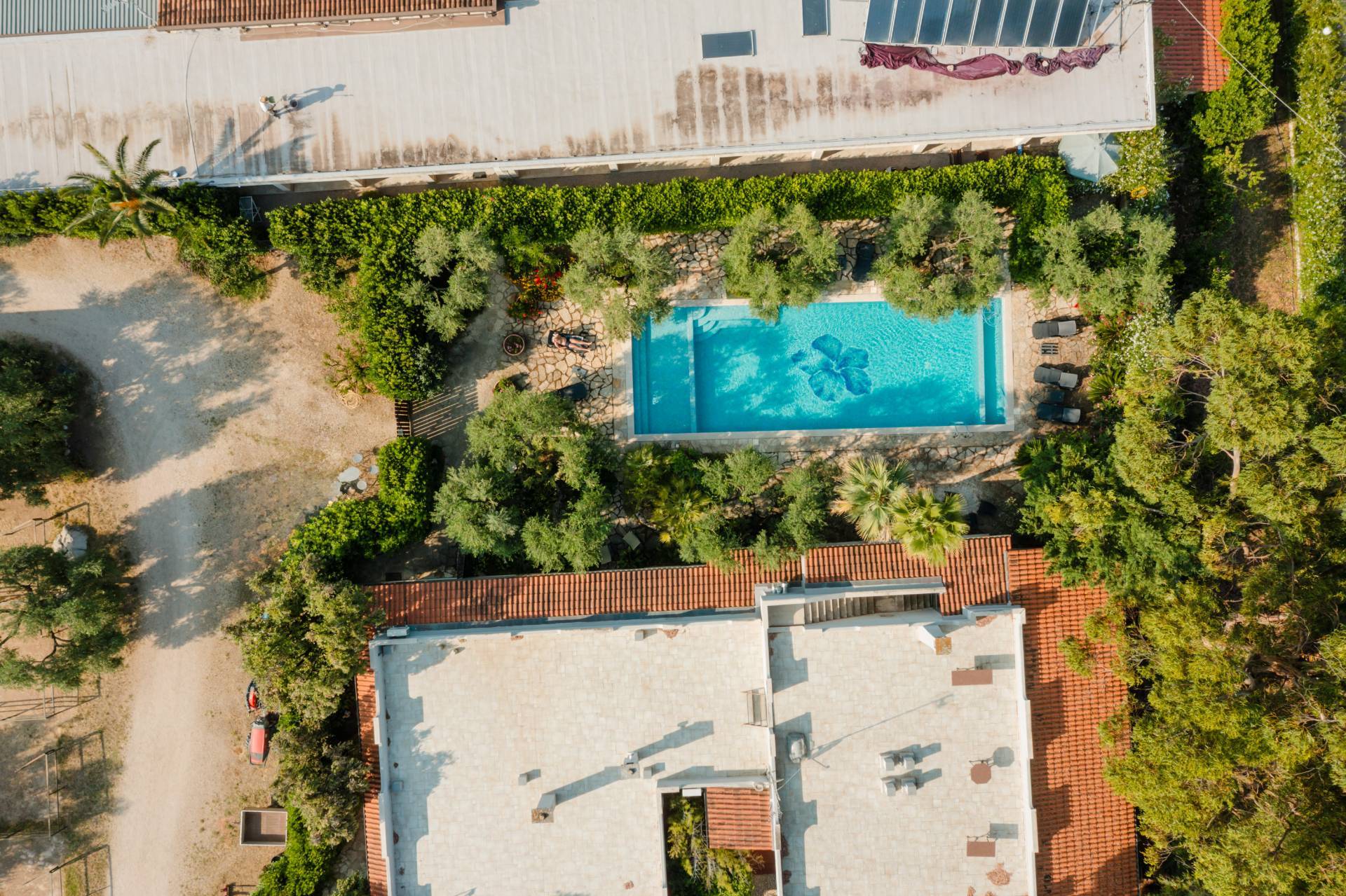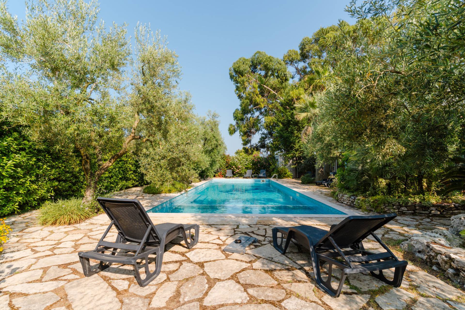 Il porticato introduce alla piscina panoramica di 6x16 metri rifinita in mosaico Bisazza e dotata di impianto a sale marino, con area idromassaggio, cascata verticale e zona giochi per bambini, creando unesperienza di soggiorno raffinata e rilassante.