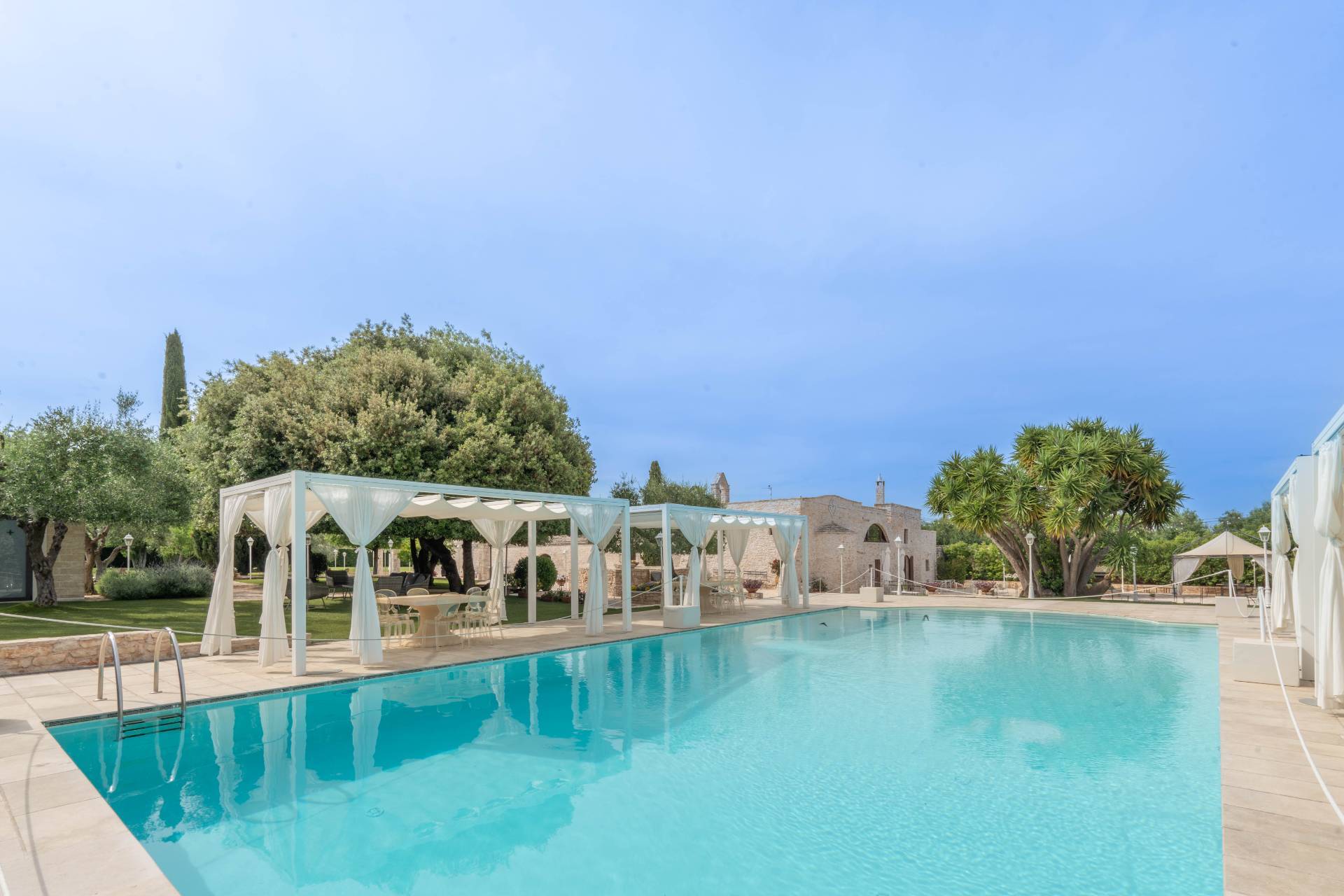 Menzione particolare merita la chiesetta sconsacrata, edificata in epoca precedente alla realizzazione della masseria, risalente verosimilmente all'anno 1000 . La dimora immersa in un meraviglioso ed immenso parco dalla connotazione naturalmente mediterranea circondato da alberi ed ulivi secolari tra i quali si incastona, come un gioiello, la sua splendida piscina.