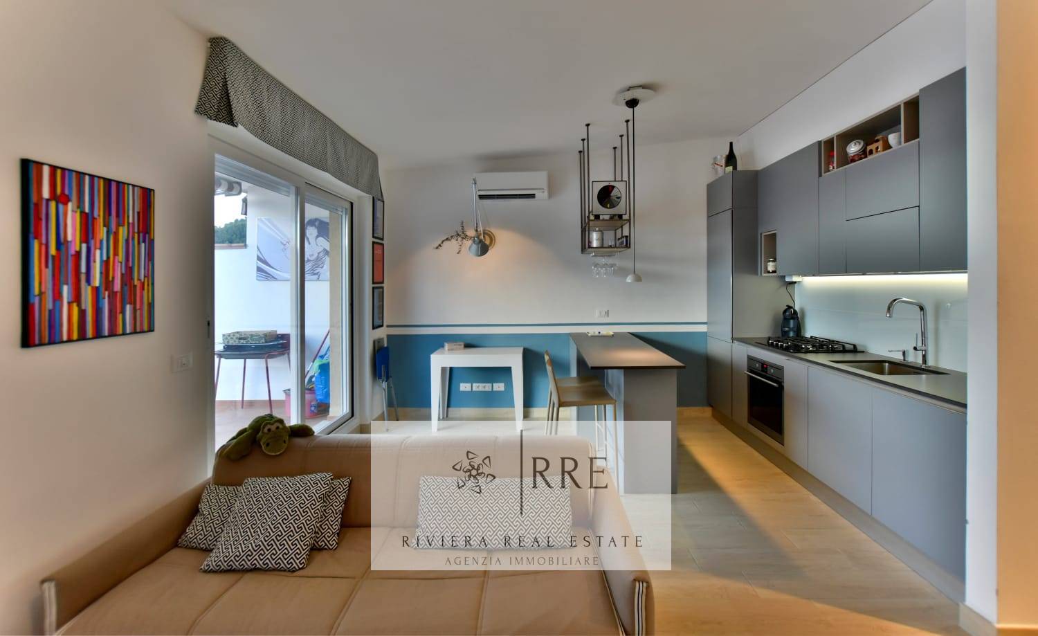 La zona giorno comprende un living aperto sulla cucina moderna a vista, con piastra ad induzione, un bagno con doccia finestrato ed un grande terrazzo con vista mare di 27 mq, corredato da tapparelle elettriche.