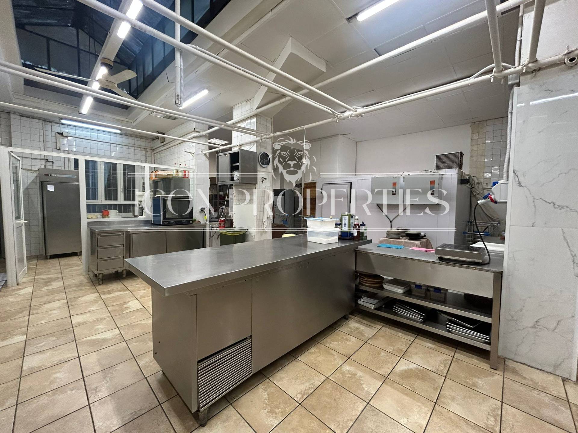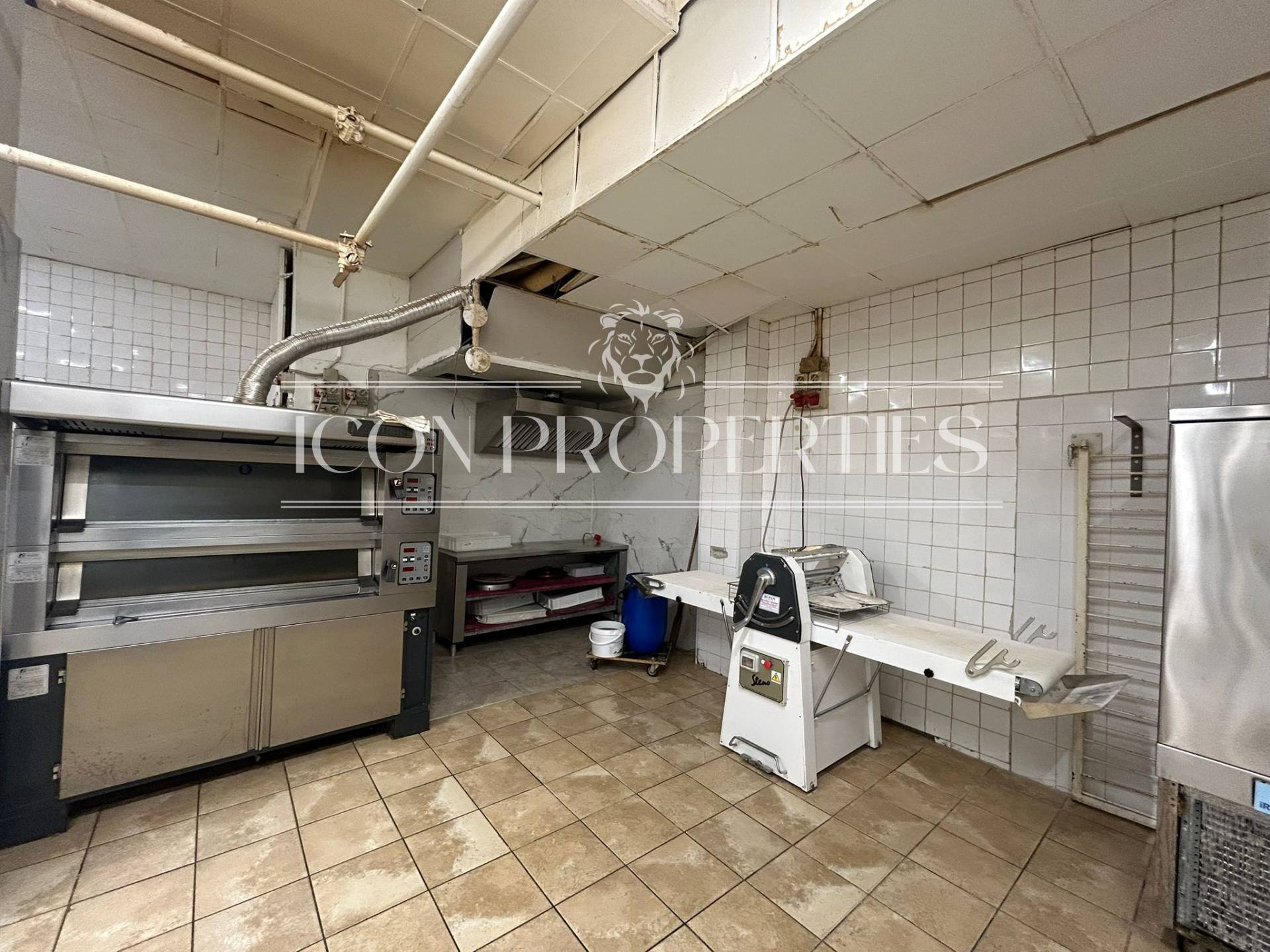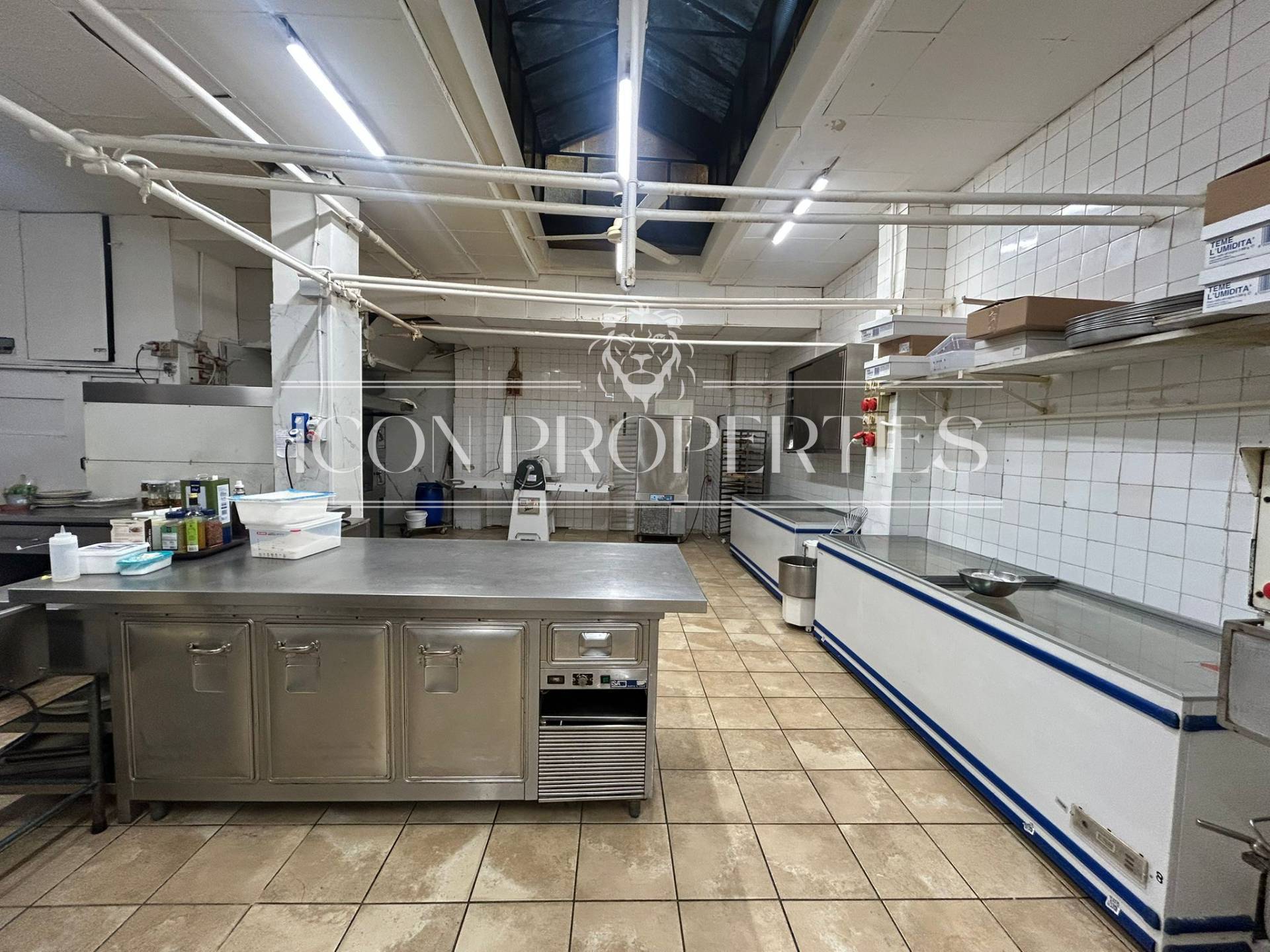 L'immobile tutto disposto al piano terra, appena si entra si trova tutta la parte adibita a negozio , vendita e somministrazione oltre ai doppi servizi interni (160 mq), nel retro del negozio invece di trovano 210 mq. di laboratorio, cucina, troviamo anche le celle frigoriere e la canna fumaria.