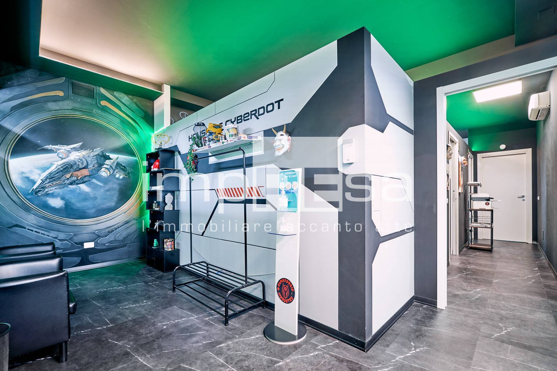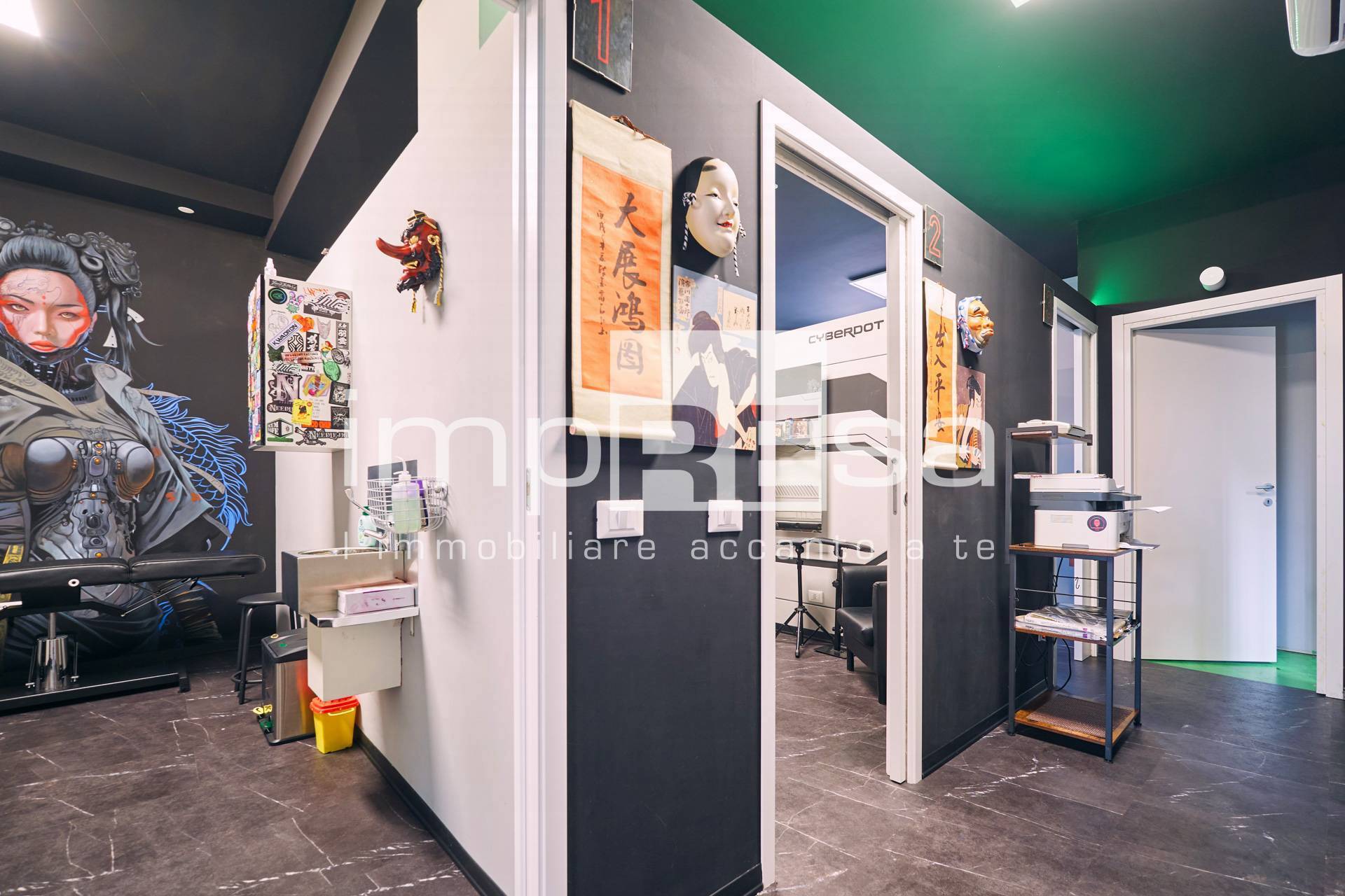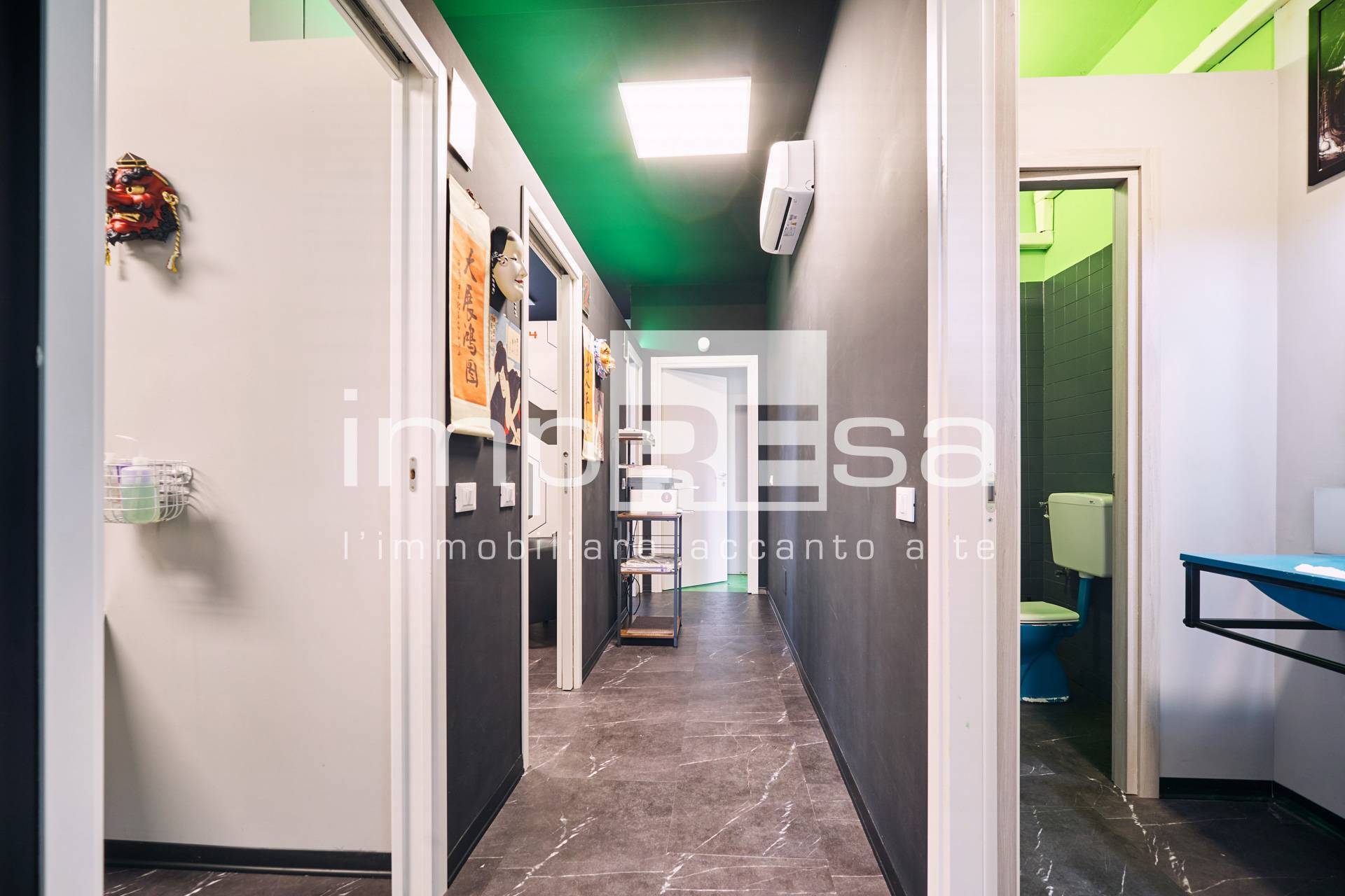 Il negozio si sviluppa nel seguente modo: l' ingresso d su una comoda reception per l' accoglienza degli ospiti, tre sale operative ricavate con pareti in cartongesso, un bagno con anticamera e una saletta ad uso magazzino per il personale.