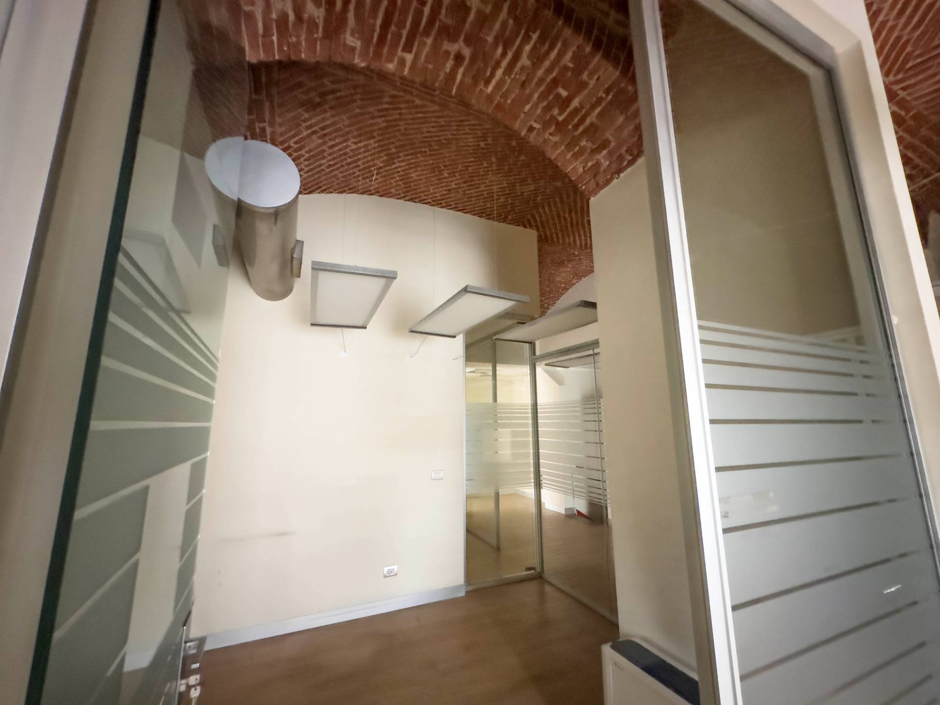 Al piano terreno circa 100 mq con 5 vetrine con stanze divise da pareti vetrate e un bagno.