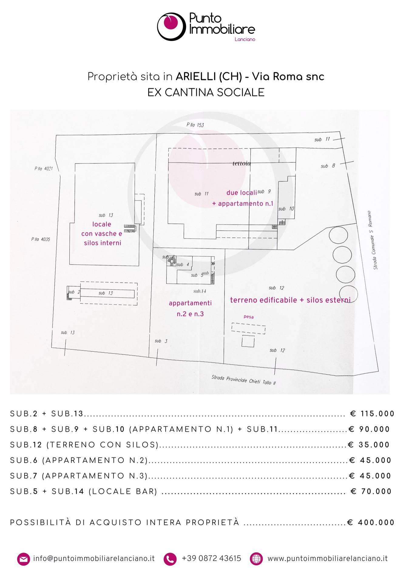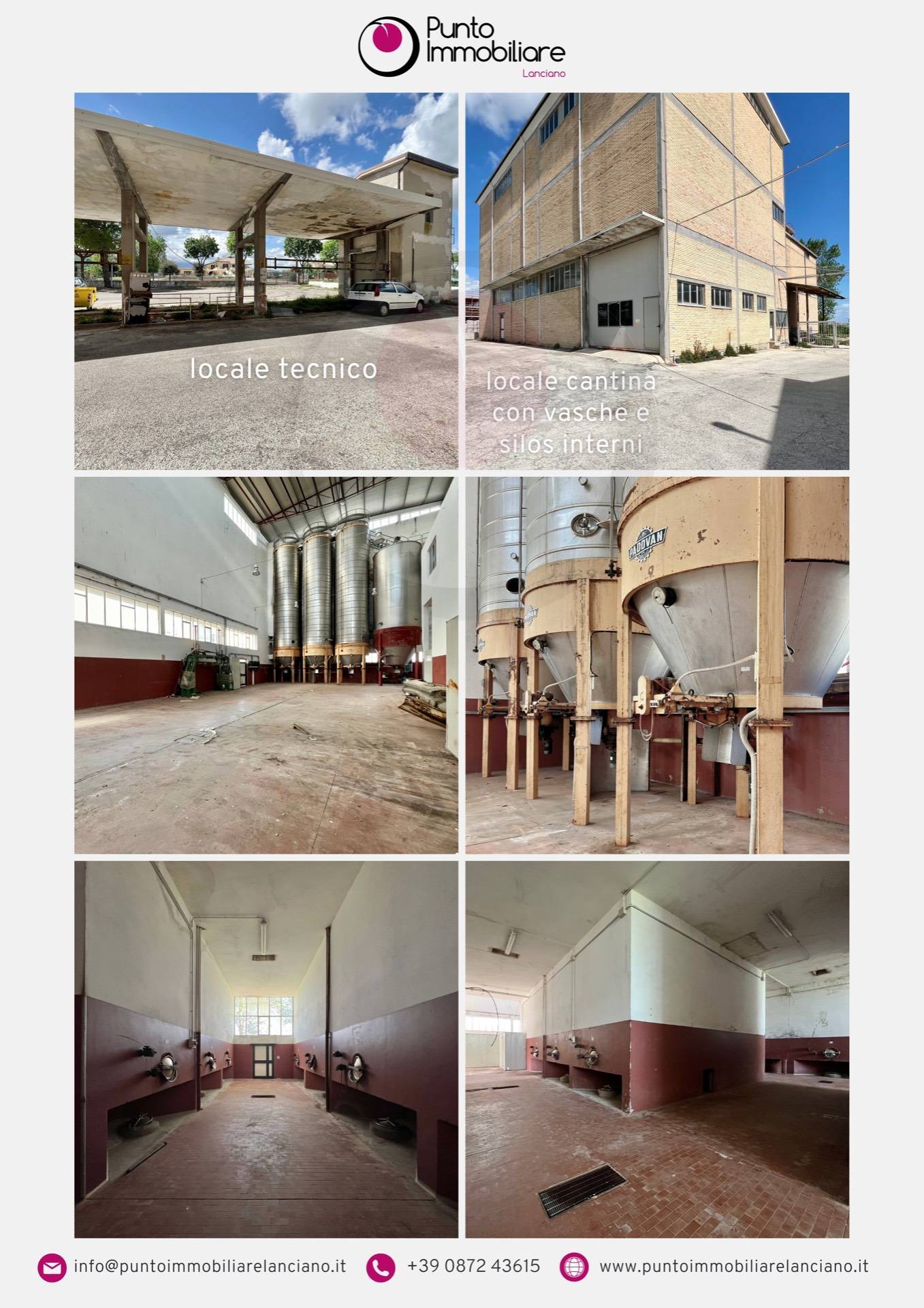 Nei pressi del centro abitato di Arielli, lungo la S.P. Chieti-Tollo, proponiamo in vendita un grande complesso produttivo che sorge su una superficie complessiva pari a 9470 mq. Lo stabilimento, attualmente predisposto ad uso enologico e ortofrutticolo (con annessi impianti), si compone di molteplici corpi indipendenti, quali: capannoni per lavorazioni, stoccaggio e deposito; palazzina per servizi, uffici e appartamenti; infrastrutture con n.4 silos in acciaio inox, cabina elettrica, n.3 stazioni di pigiatura, n.2 stazioni di pesa, impianto di depurazione, raccordo ferroviario provvisto di pesa; piazzale di 6500mq completamente asfaltato e recintato con n.3 accessi carrabili e cancelli scorrevoli, comune a tutte le unit. Grazie alle strade circostanti e alla tipologia delle strutture, i vari corpi sono perfettamente divisibili e frazionabili in pi corpi indipendenti tra di loro con accessi distinti.