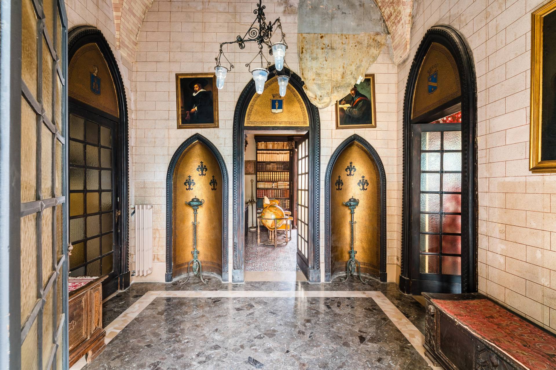 Salendo l'antica scala in pietra, si accede al piano nobile di 995mq, accolti da una scenografia neogotica dal fascino teatrale.