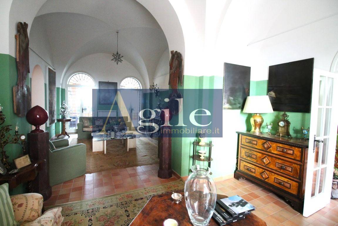 Un grande salone con camino in pietra, studio/biblioteca e sala da pranzo luminosa completano la zona giorno, mentre la cucina, con accesso alla corte antistante, dotata di dispensa e doppi servizi.