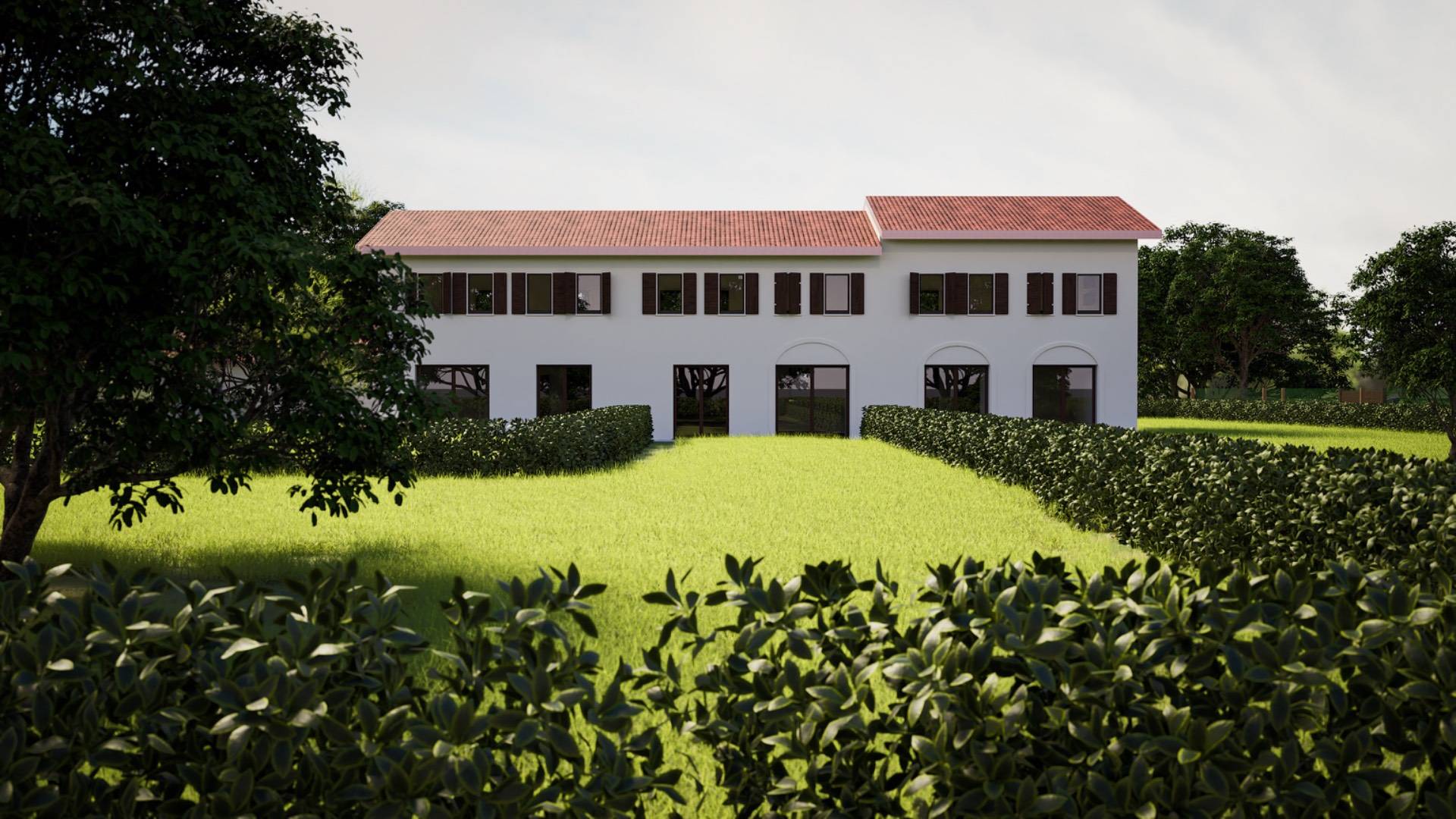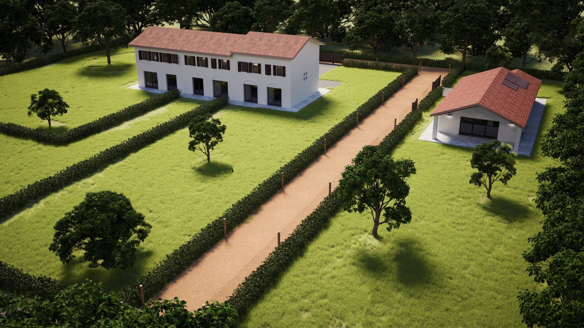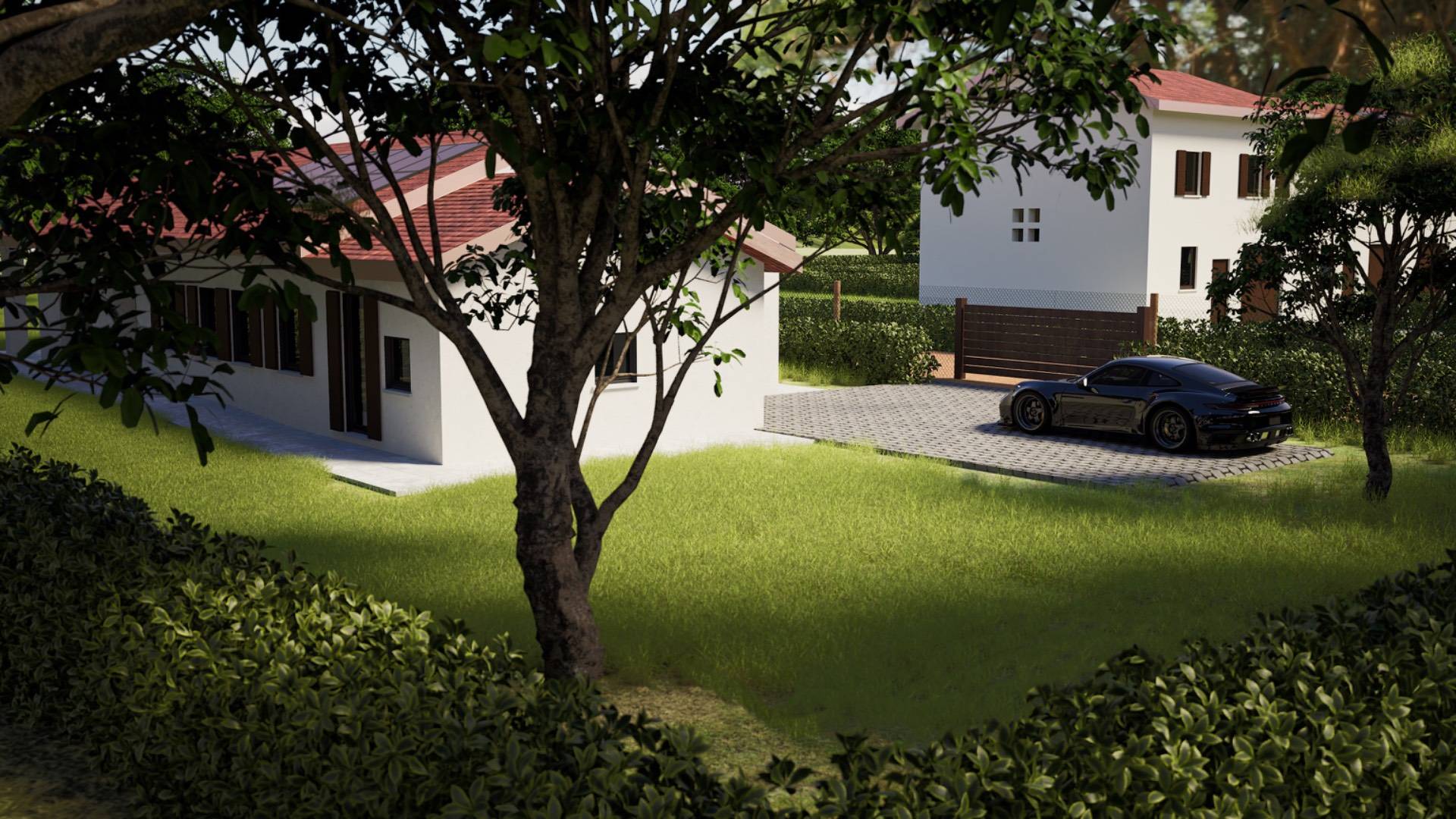 Allesterno si estende un grande giardino privato di circa 1.100 mq. inoltre possibile acquistare separatamente un ulteriore garage esterno con tetto in legno travato a vista.