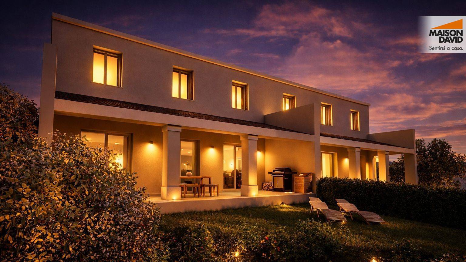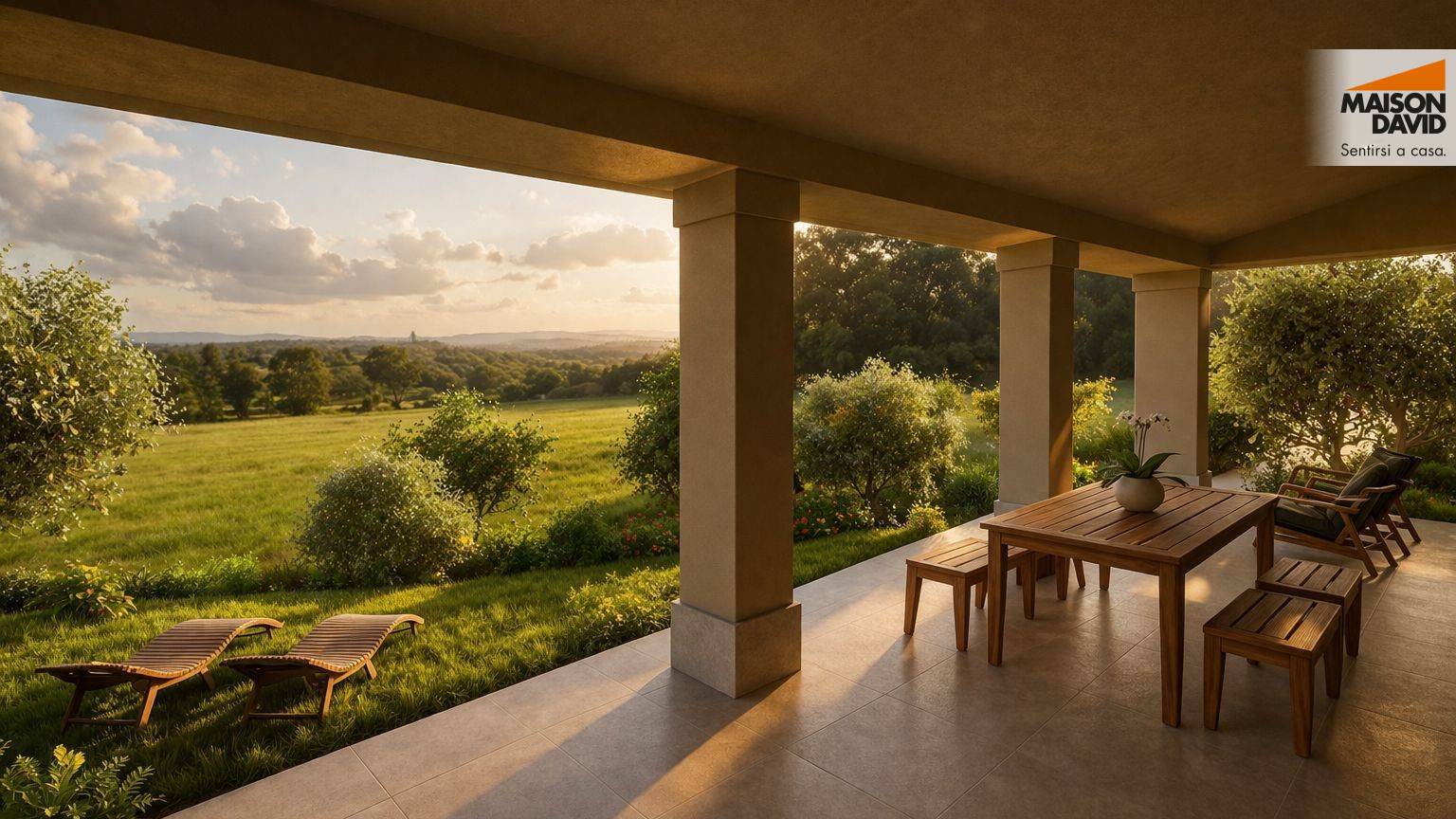 Il portico diventa il prolungamento ideale del soggiorno, un salotto all'aria aperta dove rallentare e lasciarsi conquistare da una vista panoramica aperta.