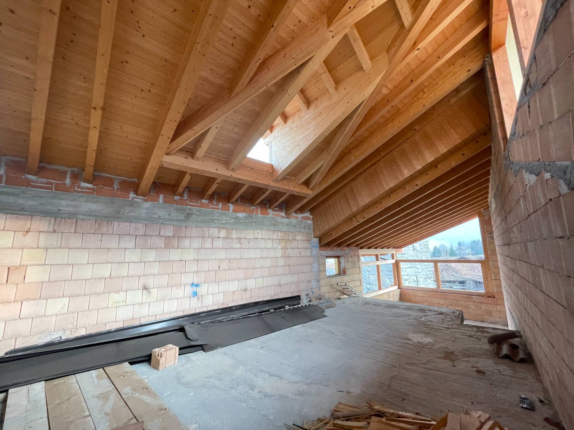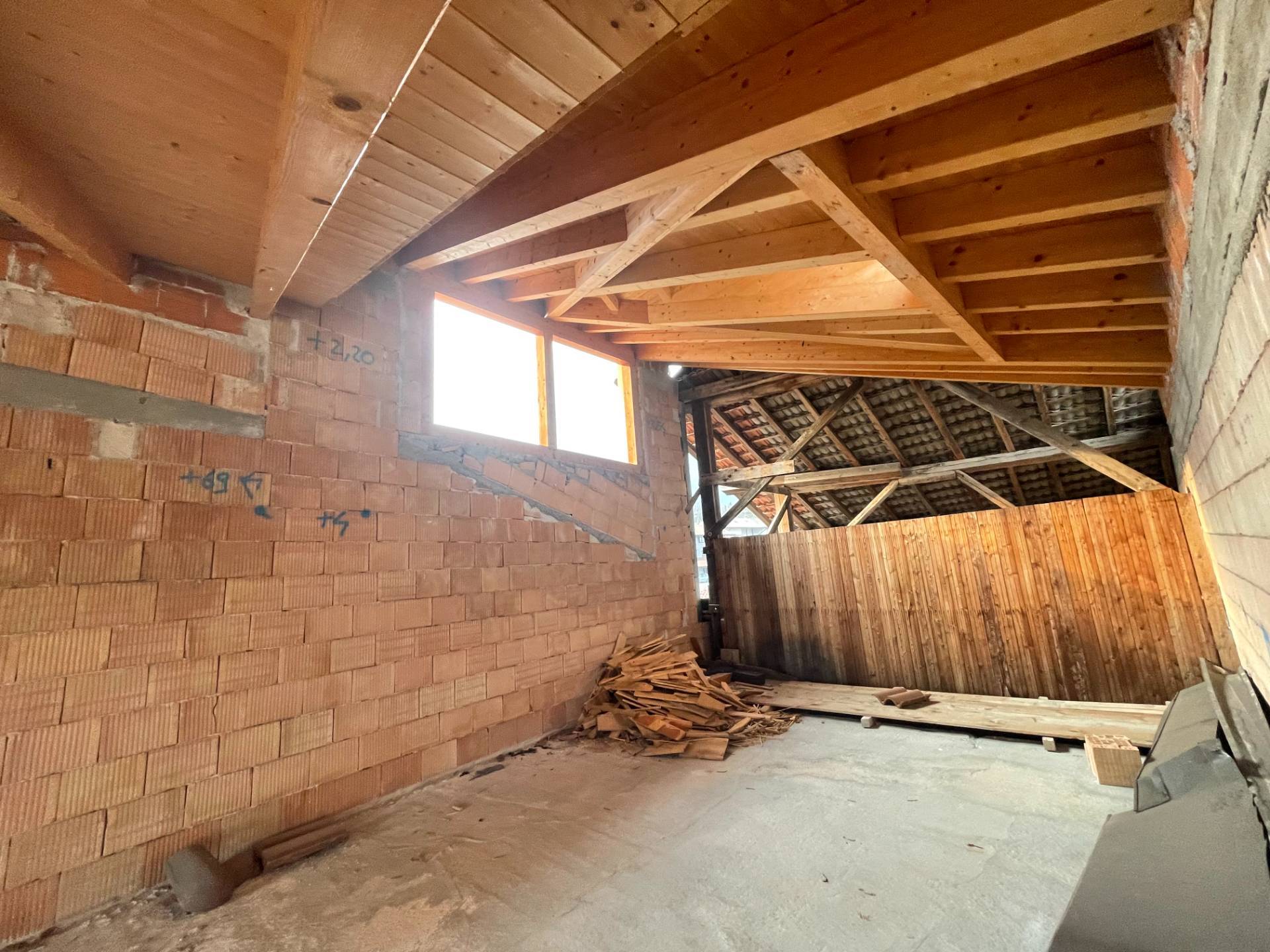 Parte interna al grezzo, murature perimetrali coibentate con cappotto termico e copertura a vista in legno di abete con sovrastante pacchetto di coibentazione.