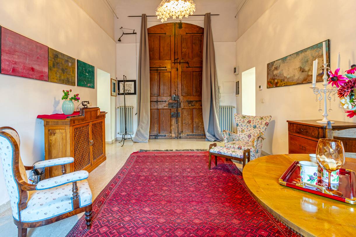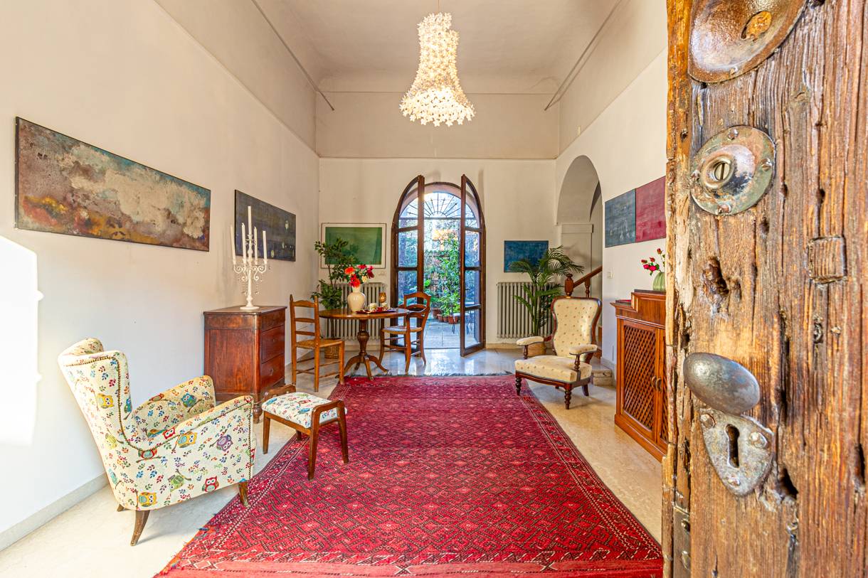 Superato il portone dingresso in legno massiccio si accede direttamente sulla zona living che si apre sul cortile attraverso una grande porta-finestra, creando un collegamento diretto con la corte esterna.