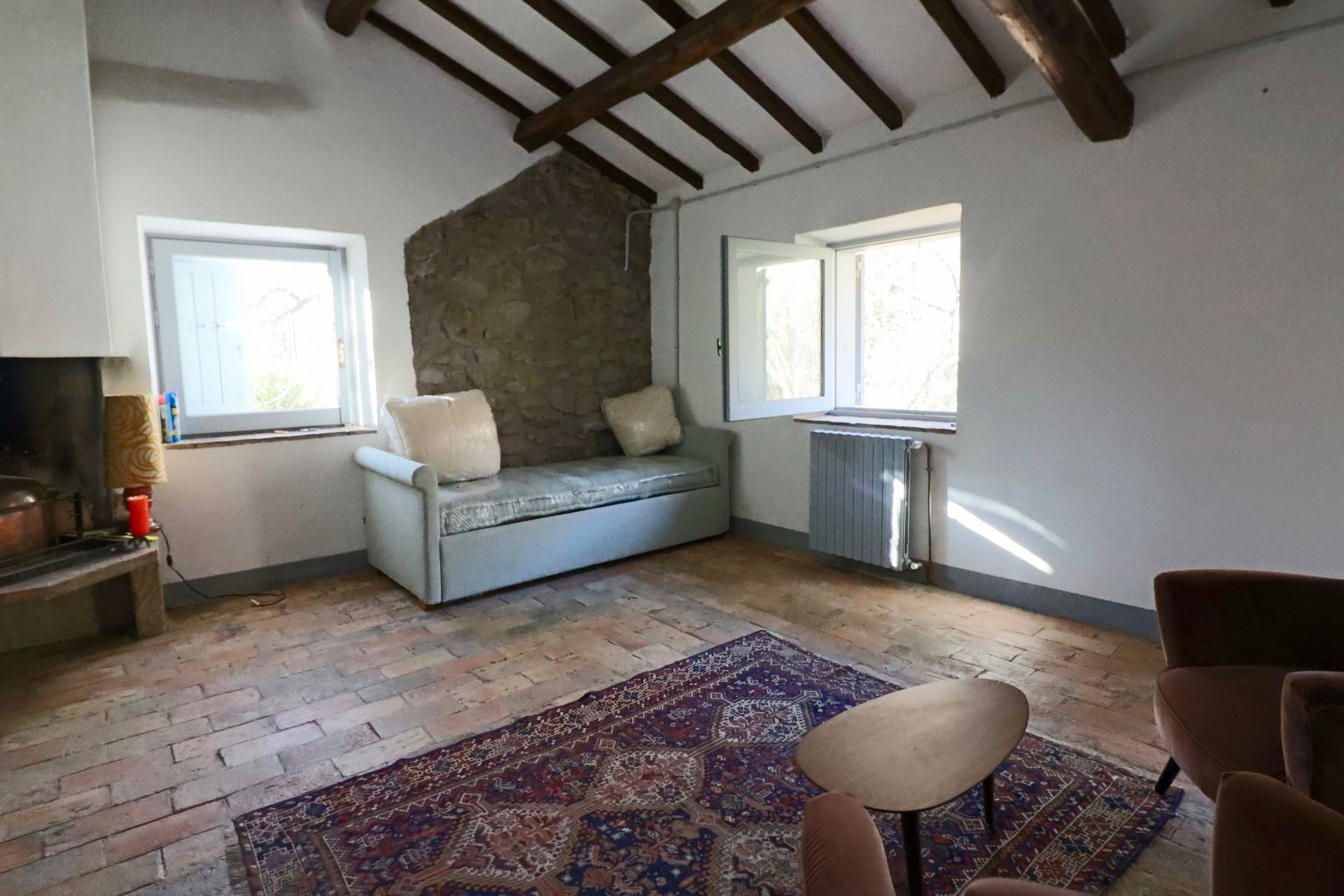 Piano Superiore: Un secondo salottino intimo con camino, due camere da letto luminose e un ulteriore bagno.