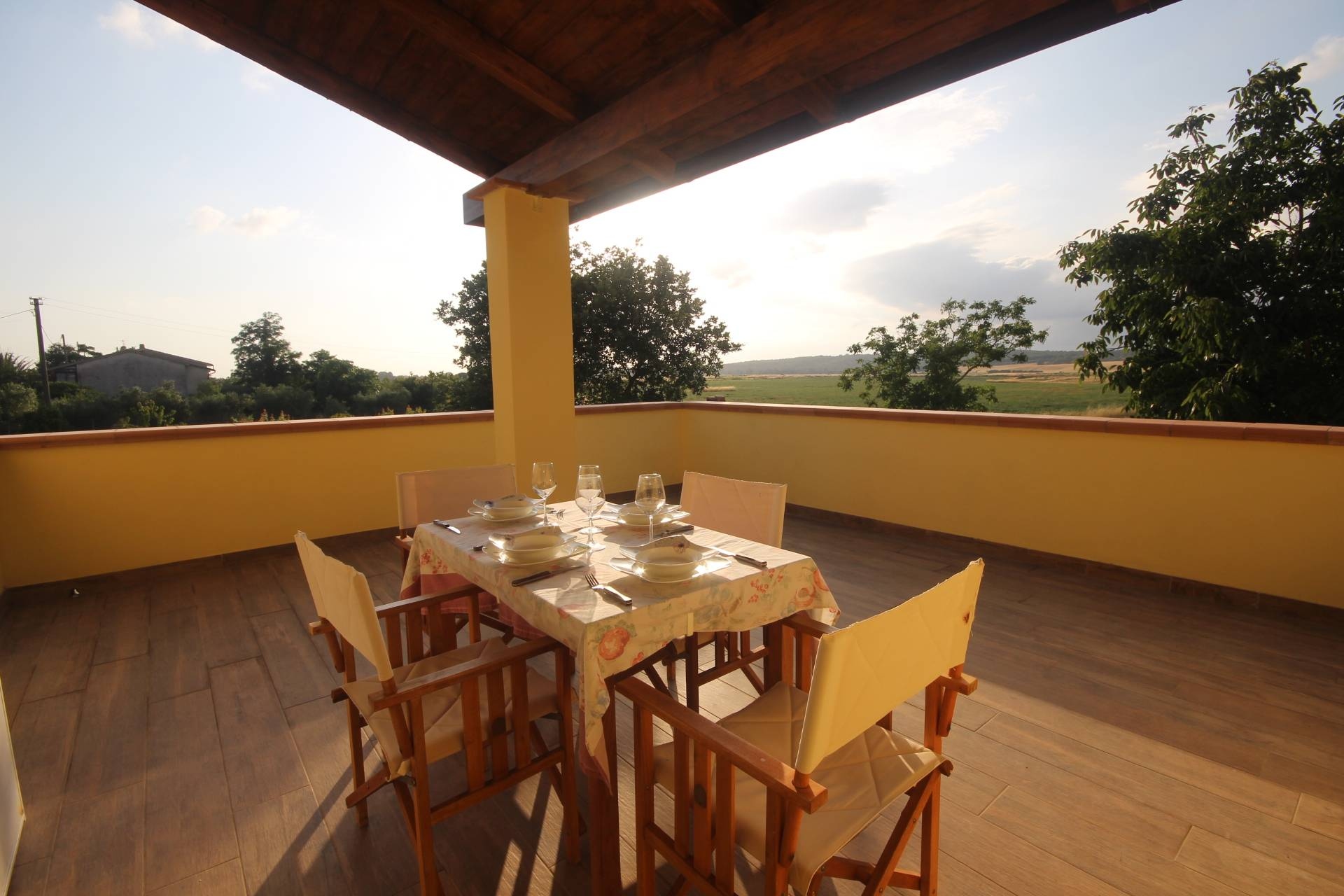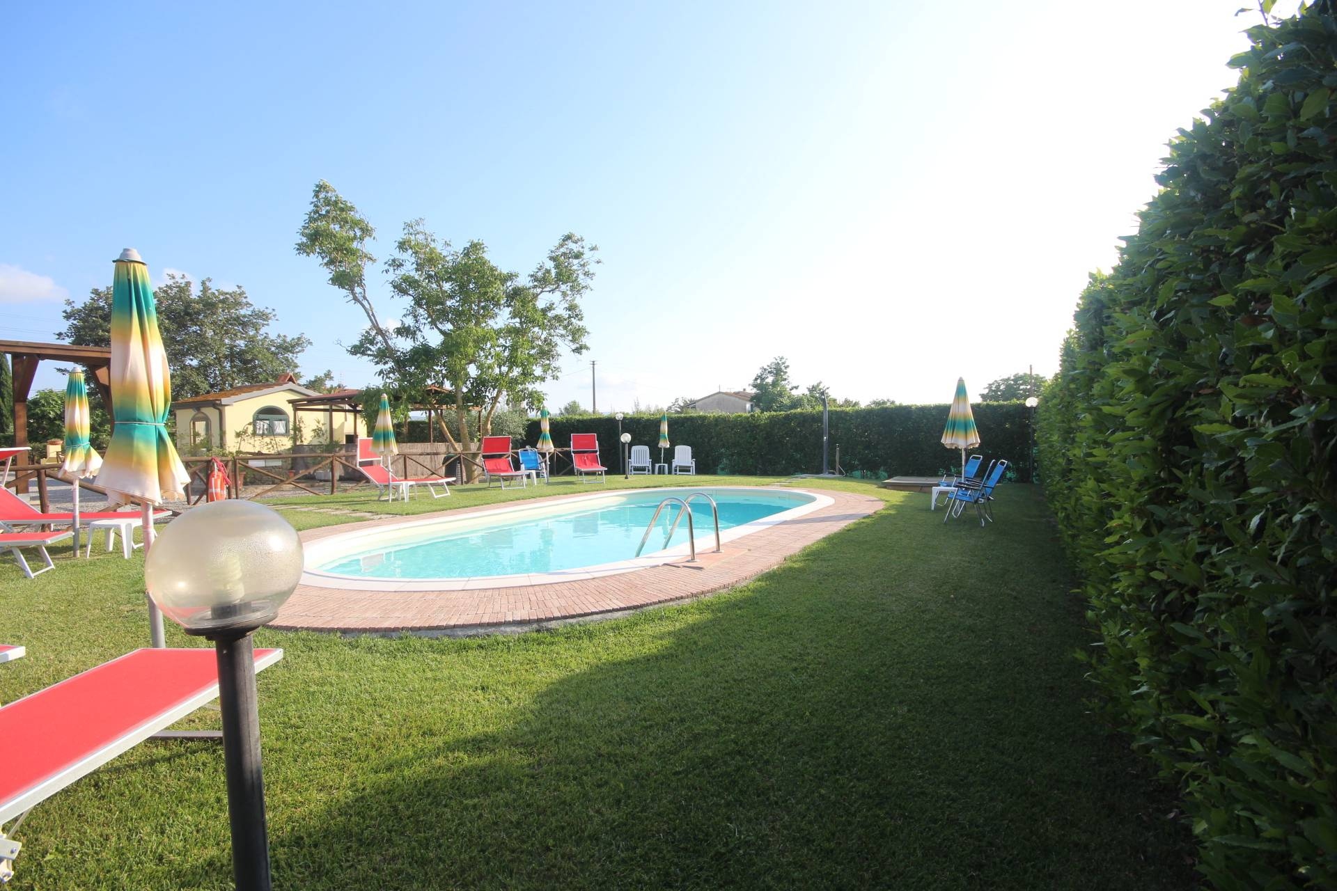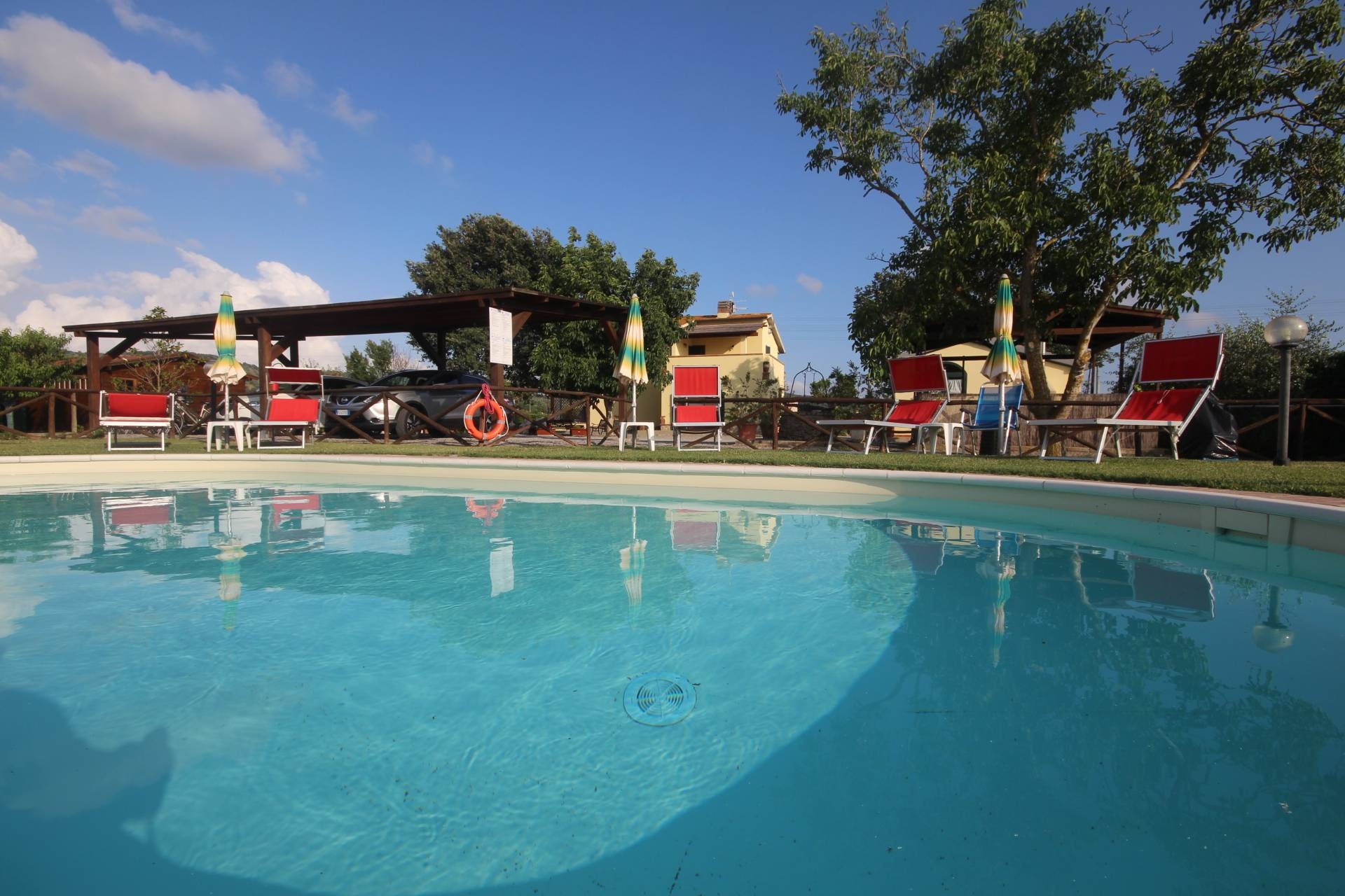 La propriet si compone come segue: Piano terra: Ampio soggiorno con accesso al portico, perfetto per momenti di relax all'aperto Cucina abitabile Due camere matrimoniali Doppi servizi Piano primo: Soggiorno con angolo cottura Accesso a una splendida terrazza panoramica di 30 mq, ideale per colazioni con vista o aperitivi al tramonto Due camere da letto Bagni ben rifiniti All'esterno, il casale immerso in un giardino curato di circa 8.000 mq, dove trovano spazio: Una piscina privata, perfetta per le giornate estive Forno in muratura per cucinare allaperto Quattro posti auto coperti Completano la propriet 6 ettari di terreno La posizione tranquilla, a meno di 10 minuti dal mare e facilmente raggiungibile, rende questa soluzione ideale sia come residenza privata di campagna.
