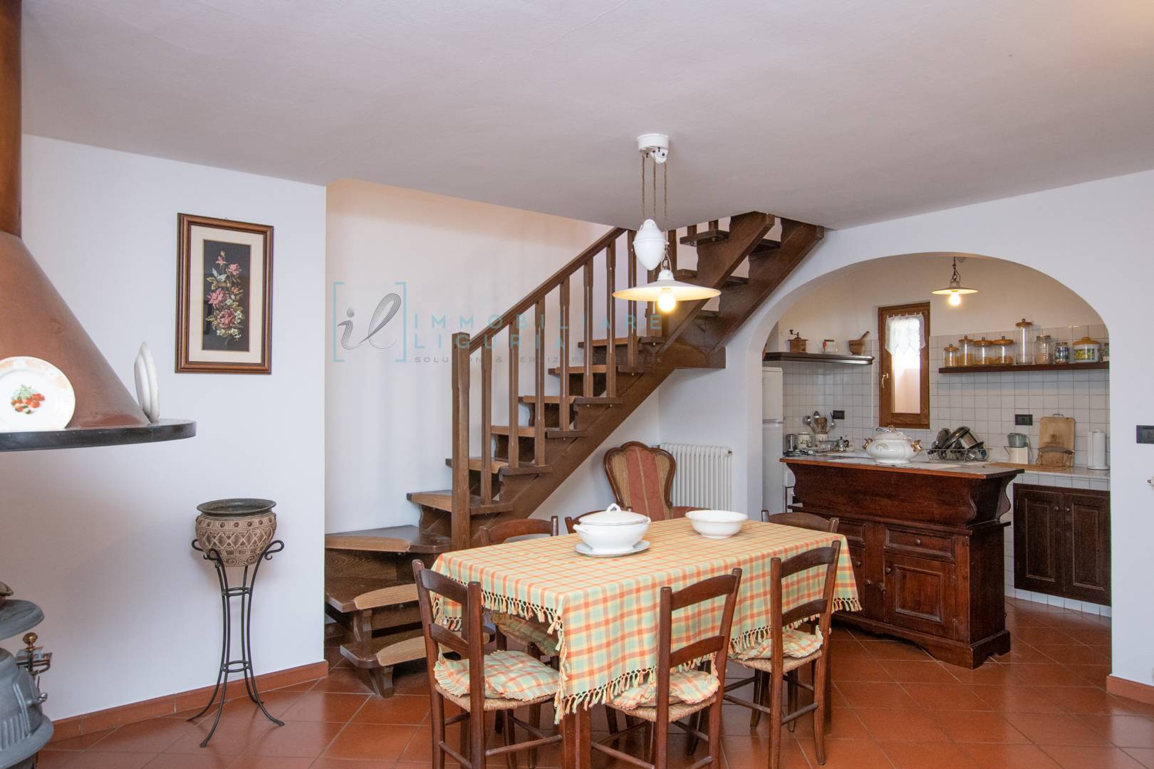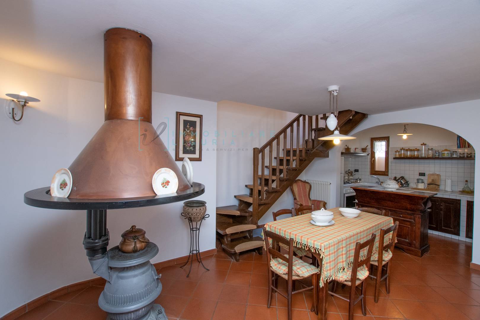 Qui troviamo anche l'ampia sala da pranzo, impreziosita dalla stufa a legna in ghisa, risalente al 1800, valorizzata dalla caratteristica parete ad arco che la circonda e dalla bellissima cappa in rame/legno.