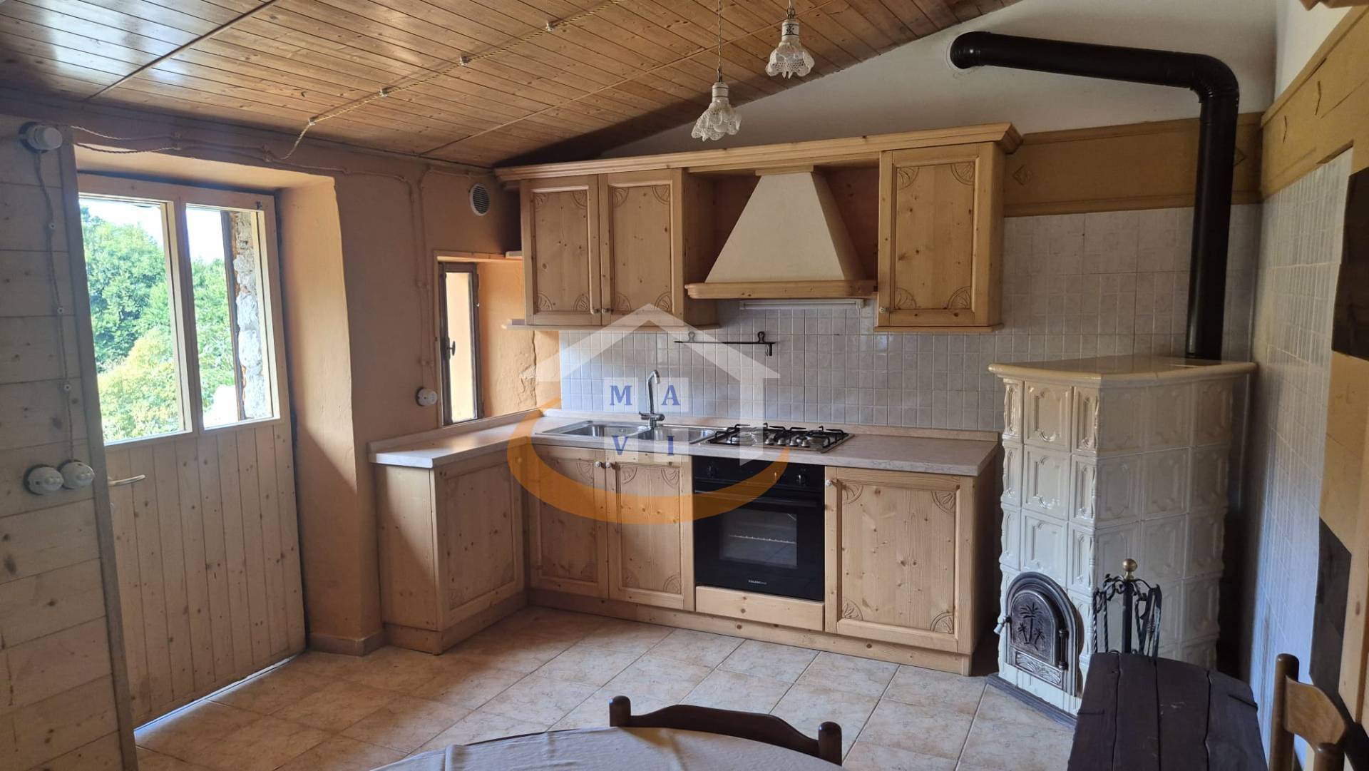 Disposta su due livelli, offre zona giorno luminosa con cucina e forno a gas, stufa a legna, bagno finestrato con doccia e camera matrimoniale con travi a vista.