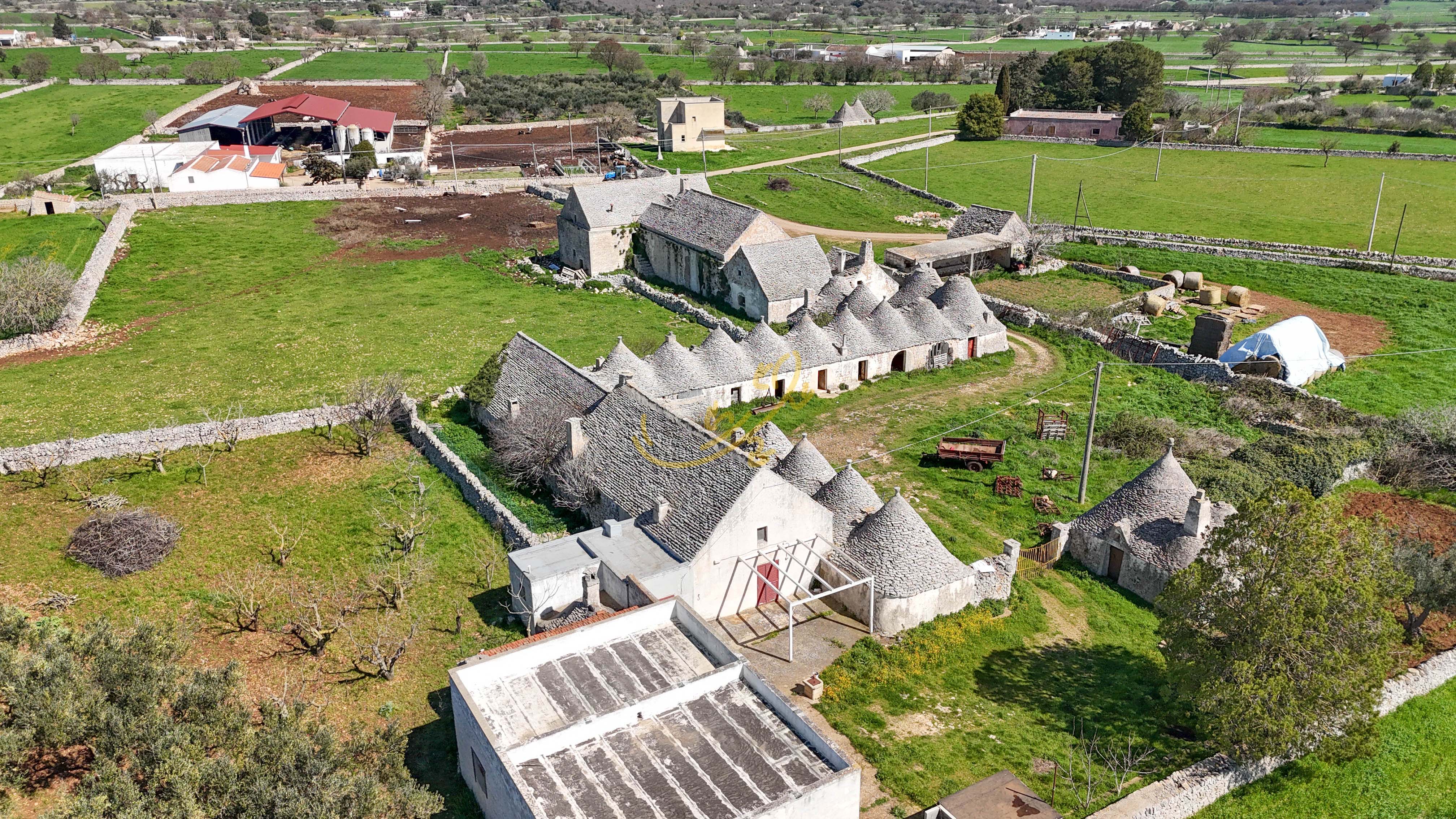 La struttura ha un grande casamento colonico composto da circa 20 trulli in linea che formano una corte, pi altri manufatti con tetto a "pignon", per un totate di circa 1200 mq interni ed un terreno di 3 ettari.