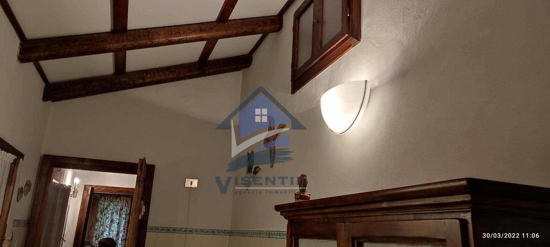 Il tetto presenta travi in legno con tavelle a vista.