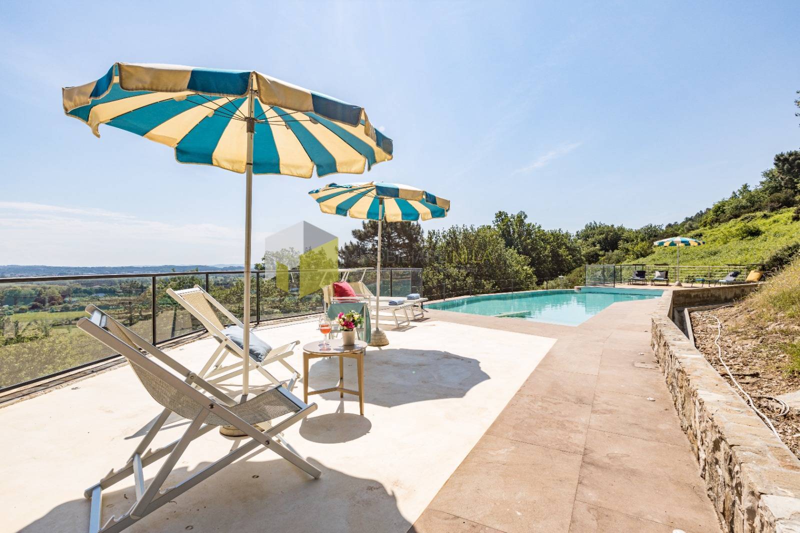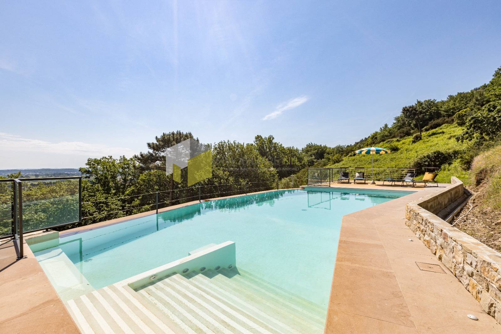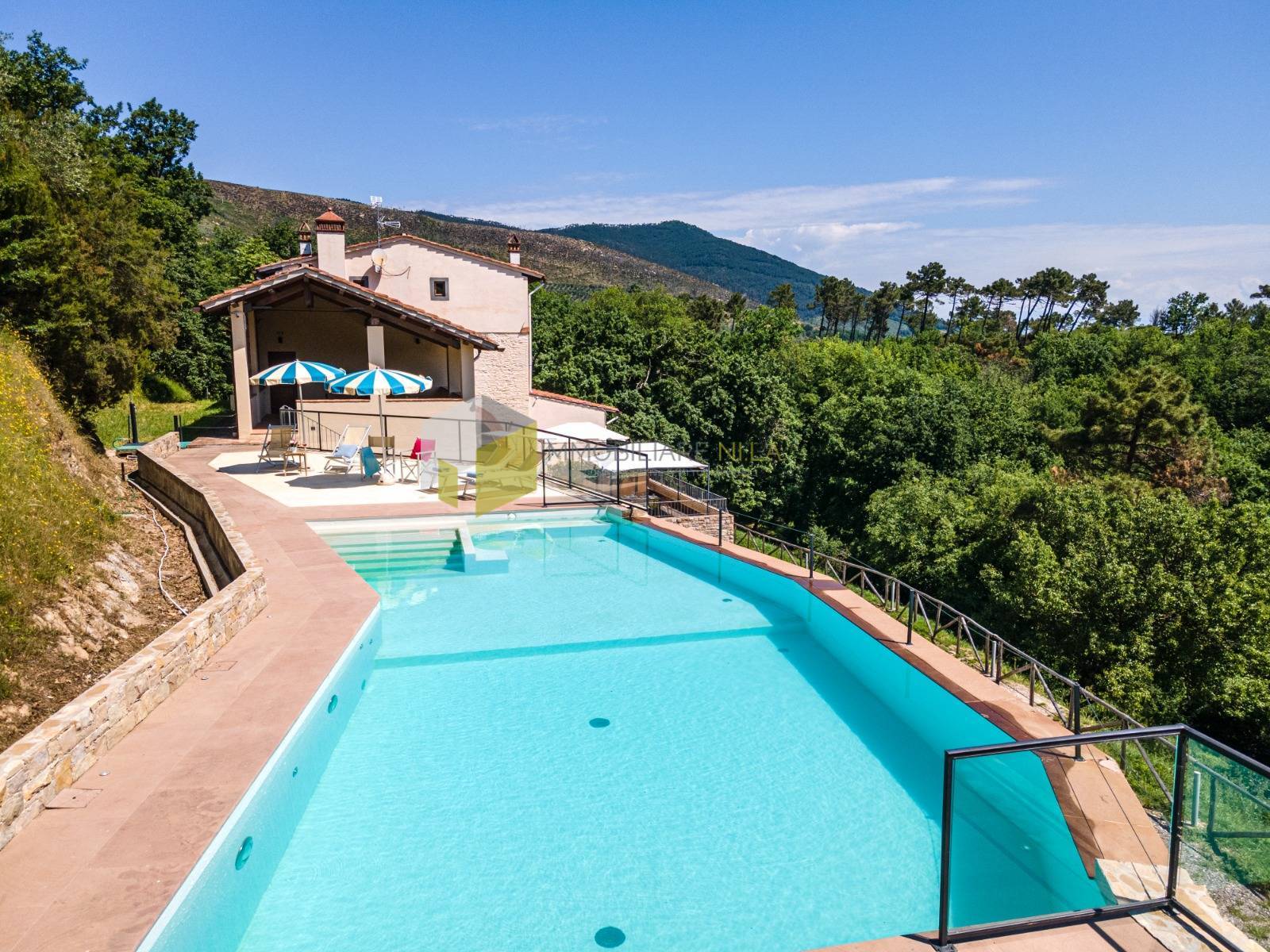 Percorrendo un breve tratto di strada agevole e asfaltata che attraversa un caratteristico boschetto, arriviamo all'ingresso di questa meravigliosa propriet, composta da due abitazioni indipendenti che condividono una terrazza panoramica di 160 mq, una moderna piscina interrata, un grande locale garage per il ricovero delle auto e un parco di 2000 mq. L'abitazione pi grande offre una zona giorno al piano rialzato di 165 mq suddivisi in ingresso, salone doppio con grandi affacci panoramici, sala da pranzo con sublime scala in vetro per i piani superiori, grande cucina con camino passante, bagno e ripostiglio; la zona notte offre 3 suggestive camere da letto, dislocate al primo e secondo piano, tutte caratterizzate da vista mozzafiato, travi a vista e bagni en suite.