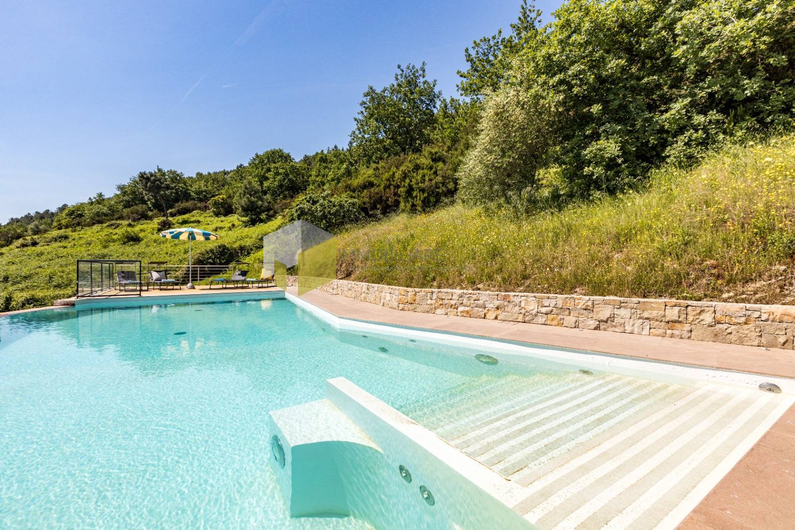 La bellissima piscina, incastonata nel verde, offre momenti di puro relax, cos come la grande terrazza attrezzata di gradevoli strutture ombreggianti per i pranzi allaperto.