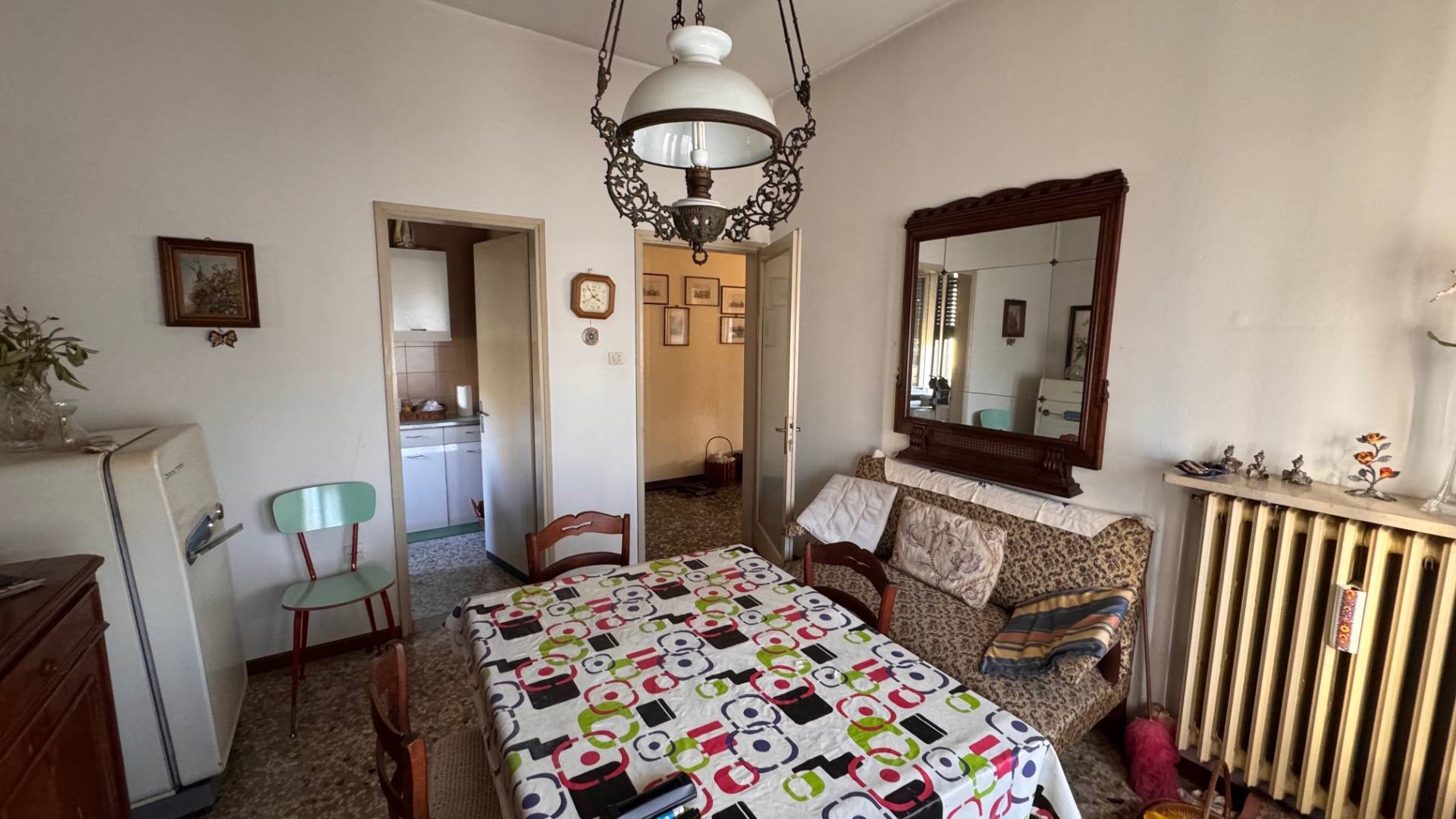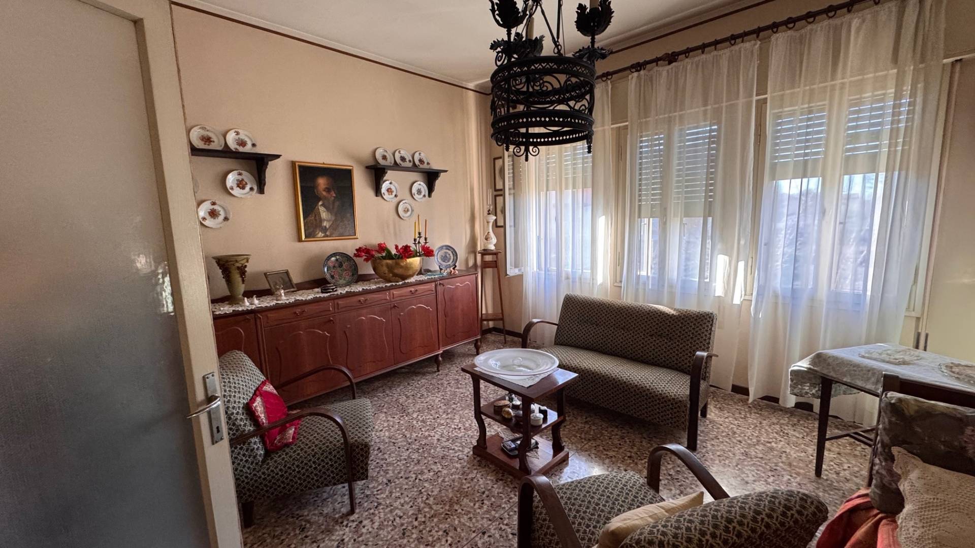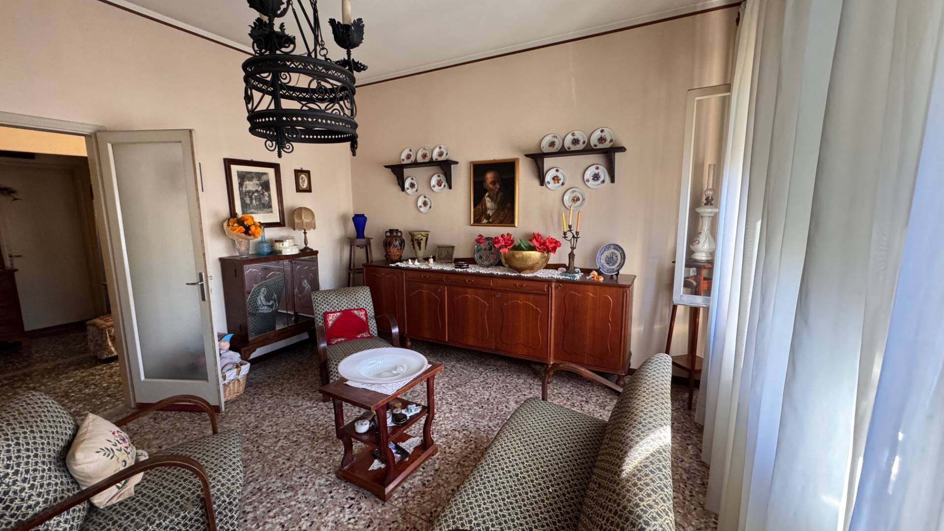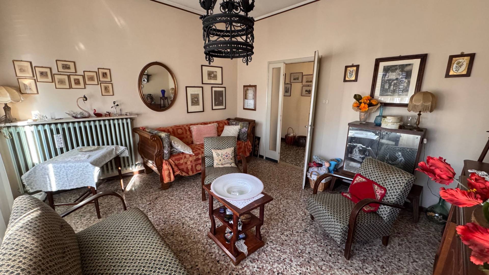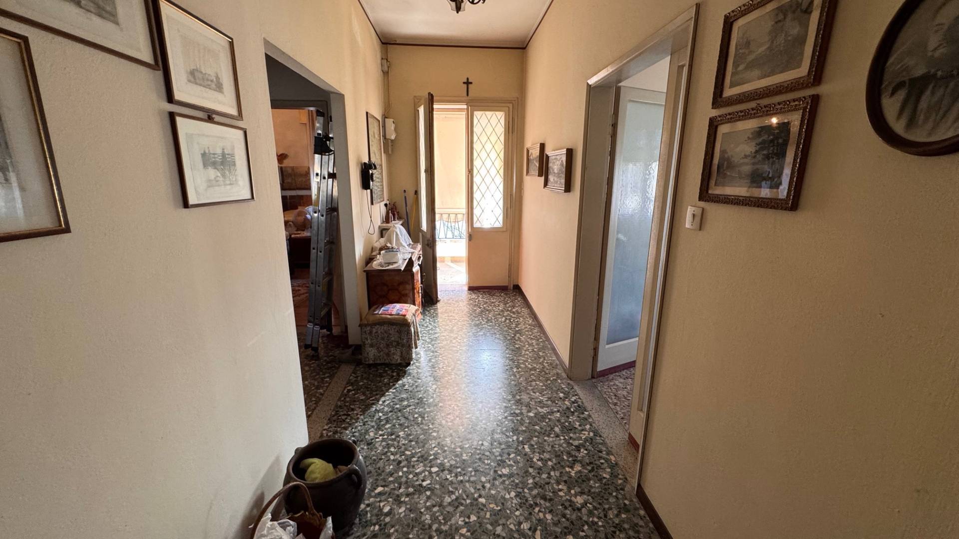 Al primo piano al quale si accede da una scala esterna in tipico stile anni 60, si entra nell'ingresso e disimpegno che porta ad un salotto, un soggiorno pranzo attiguo e adiacente ad uno spazza cucina, due camere matrimoniali ed un bagno.