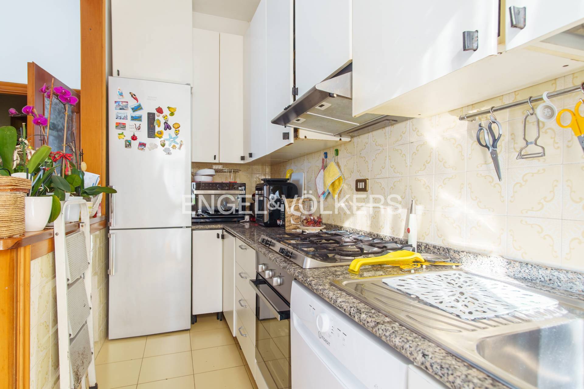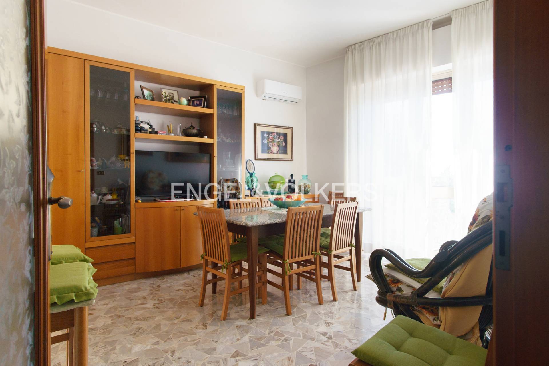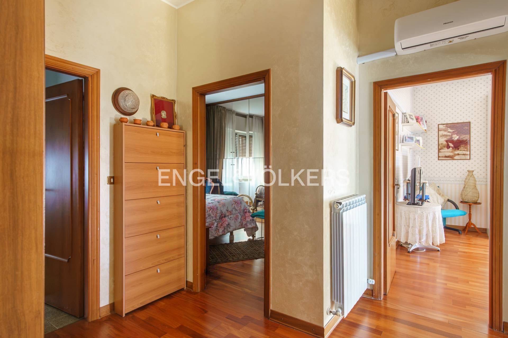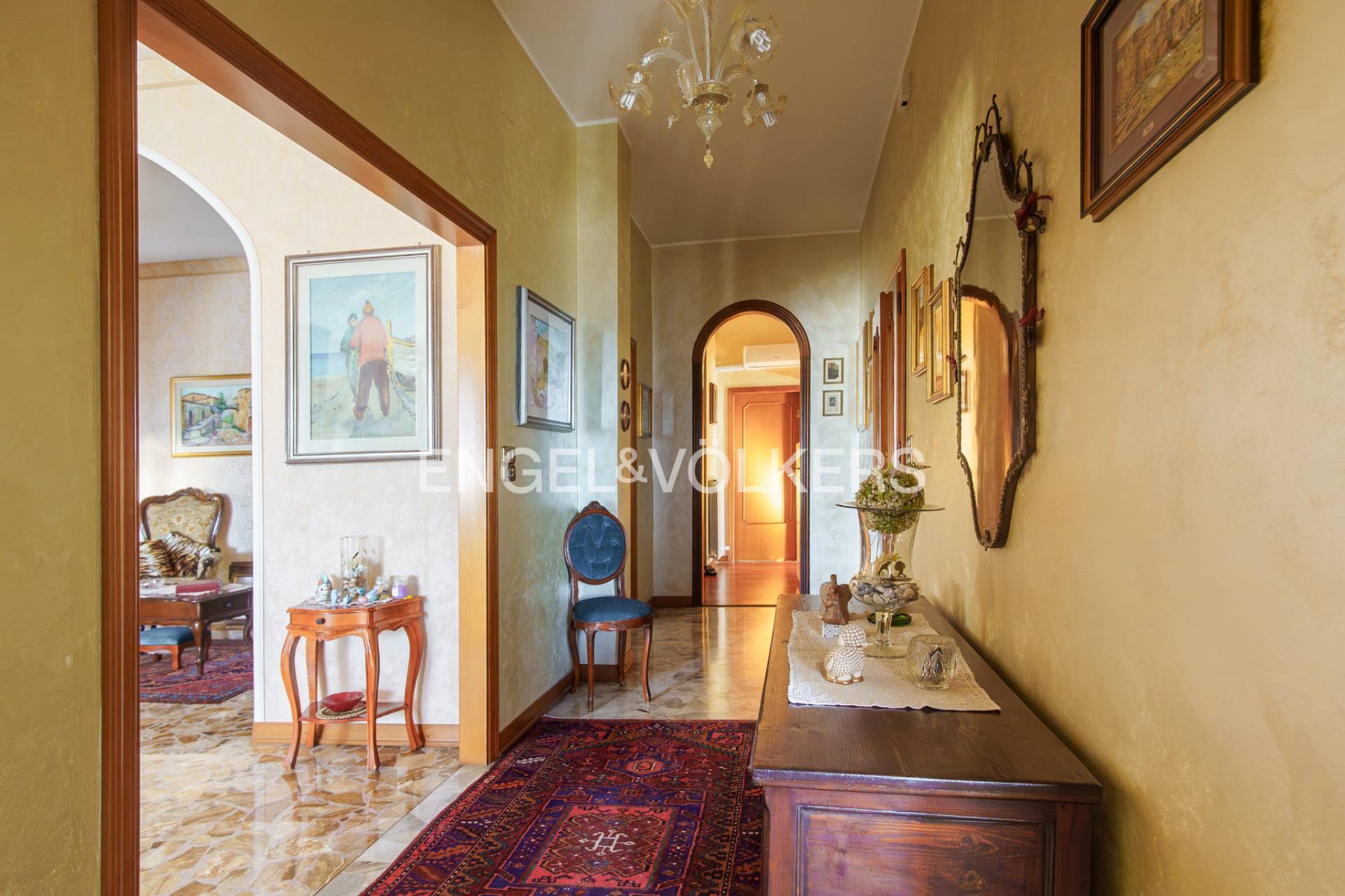 In alcuni ambienti presente parquet galleggiante, posato circa 13 anni fa, mentre cucina e soggiorno sono impreziositi da superfici in marmo con eleganti venature dorate, che conferiscono carattere e luminosit agli spazi.