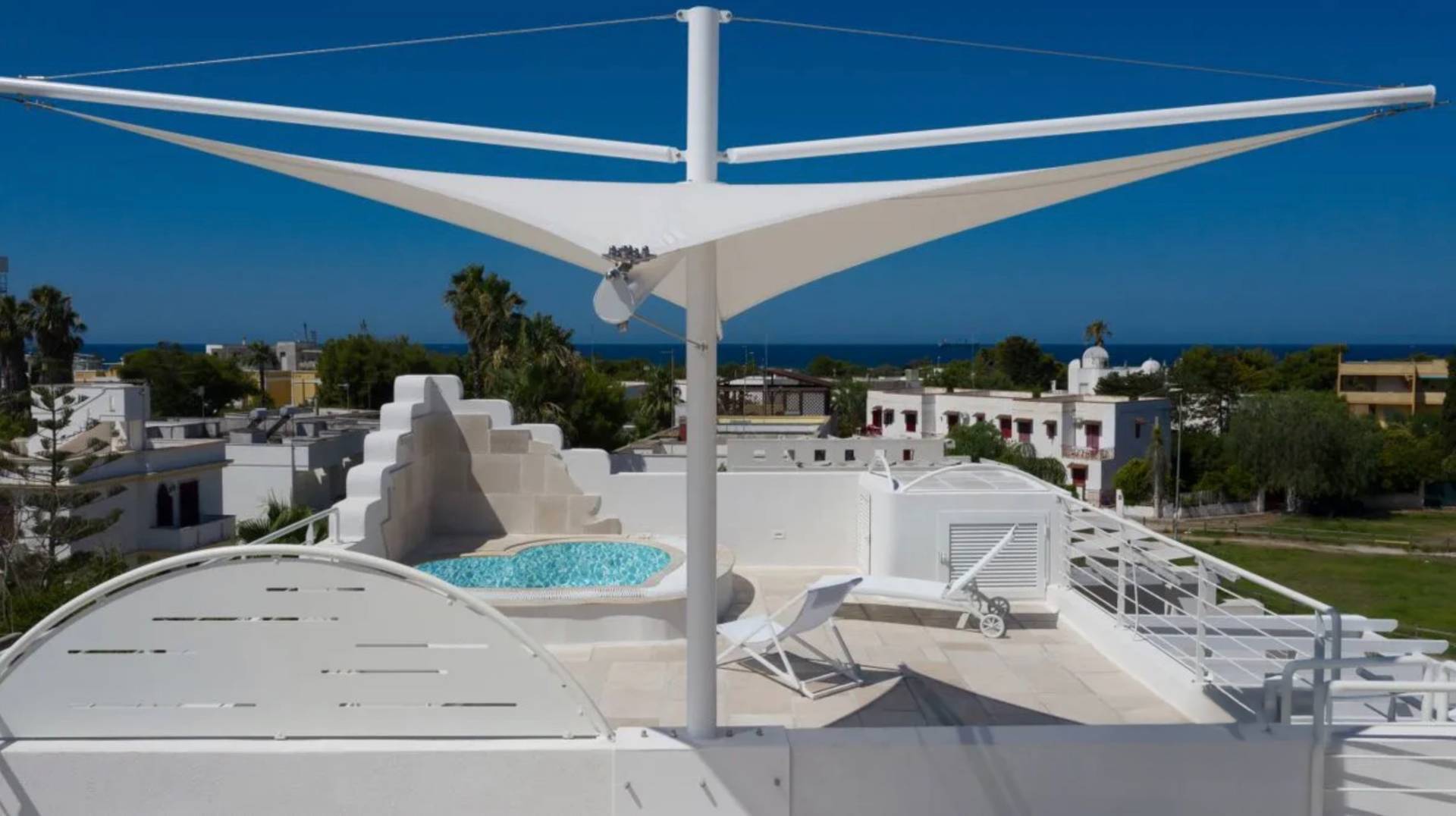 Entrambi gli alloggi hanno una scala interna con i gradini sospesi che porta ai terrazzi attrezzati e rivestiti con pietra di Trani - ciascuno di 40 mq circa - con zona relax e dotati di piscina a forma di cuore.