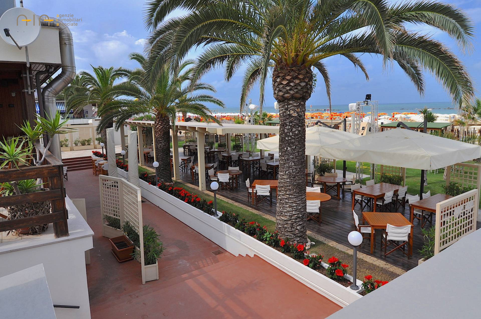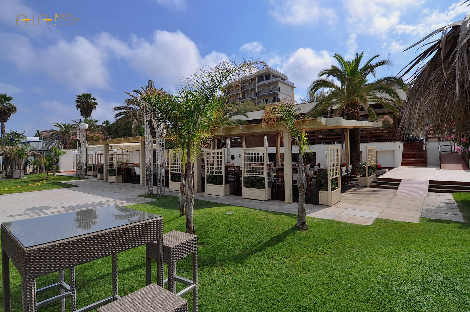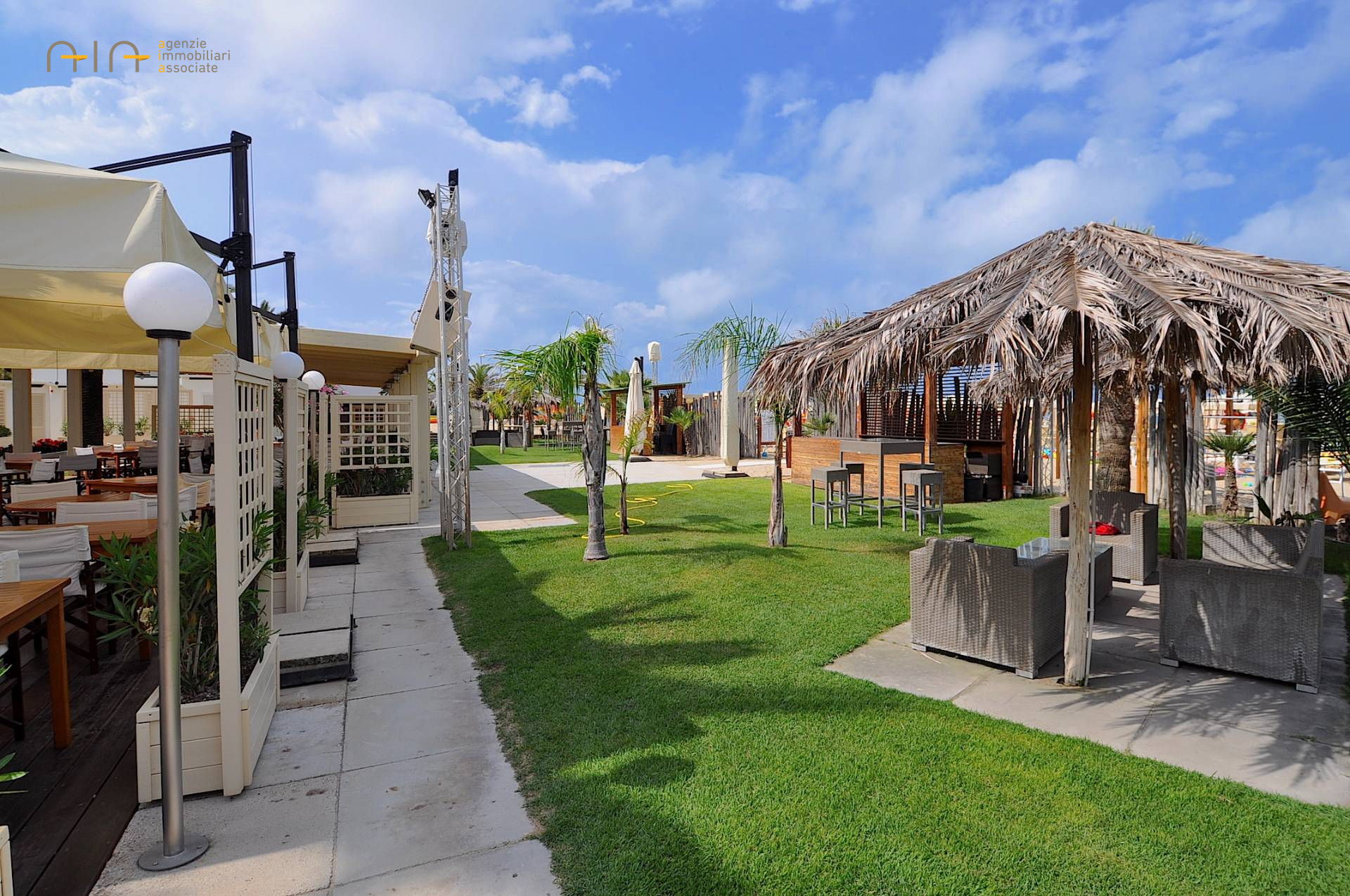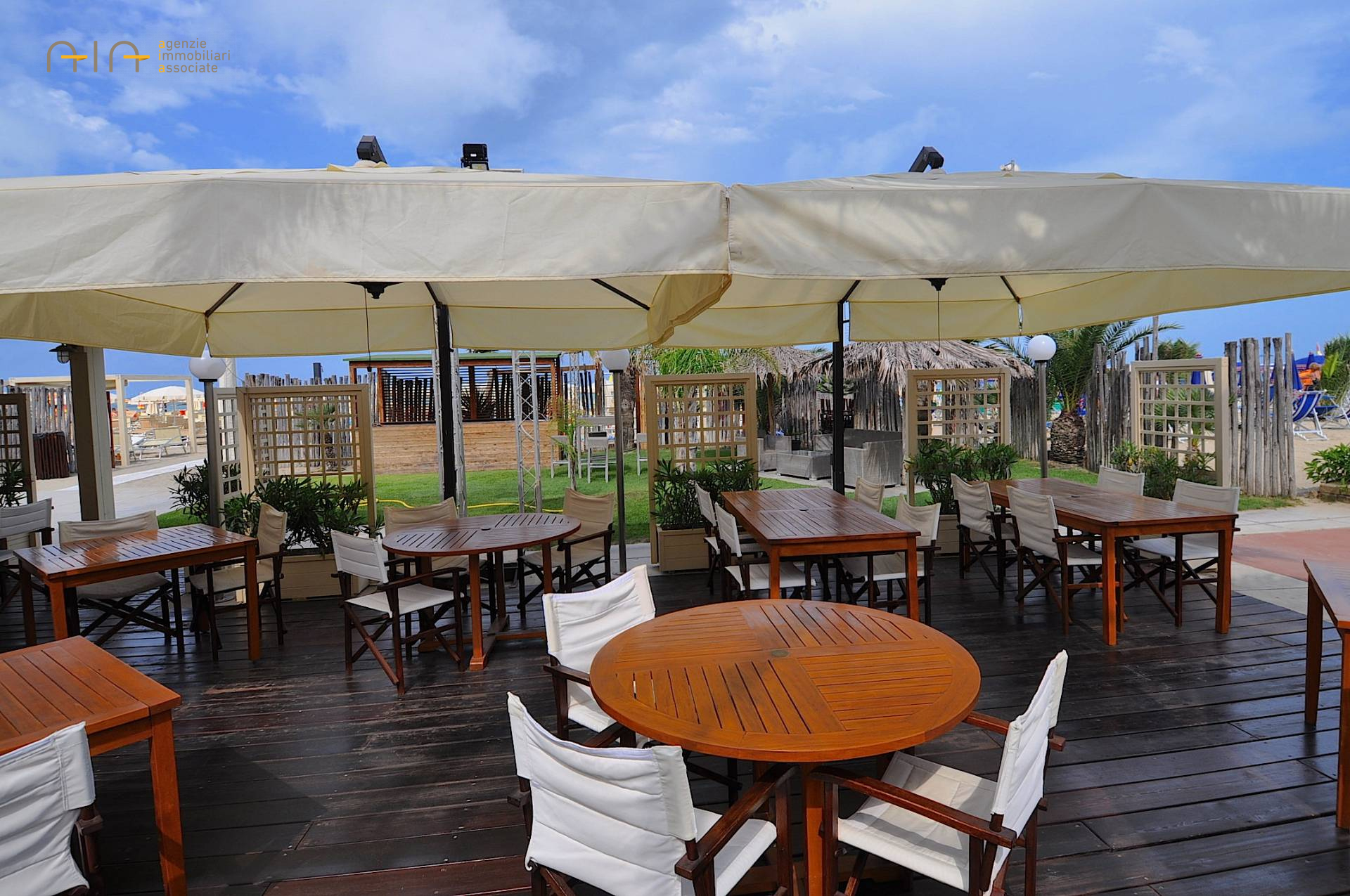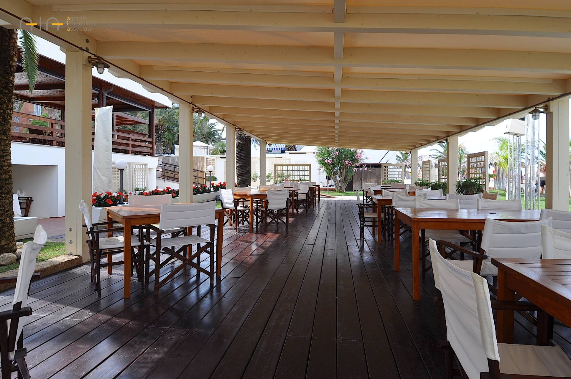 Il RISTORANTE - posizionato a livello spiaggia - fornito di ampia cucina attrezzata, vari depositi e ufficio ed dotato di licenza di ristorazione stagionale (dal 01.04 al 30.09). Esternamente presente un pergolato in legno con 19 tavoli per circa 80 coperti, il tutto circondato da ampio giardino fornito di impianto di irrigazione automatico, impianto stereo e vari gazebo in legno dove servire drink nei dopocena.