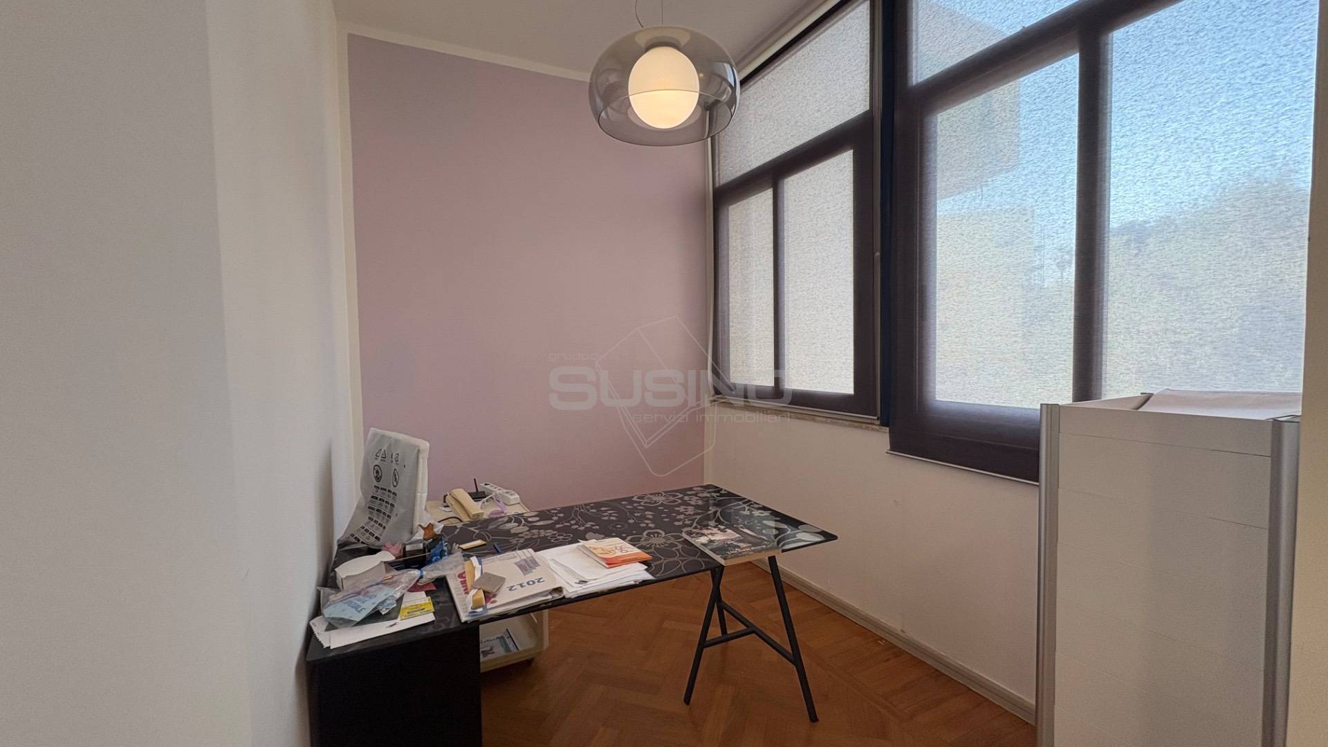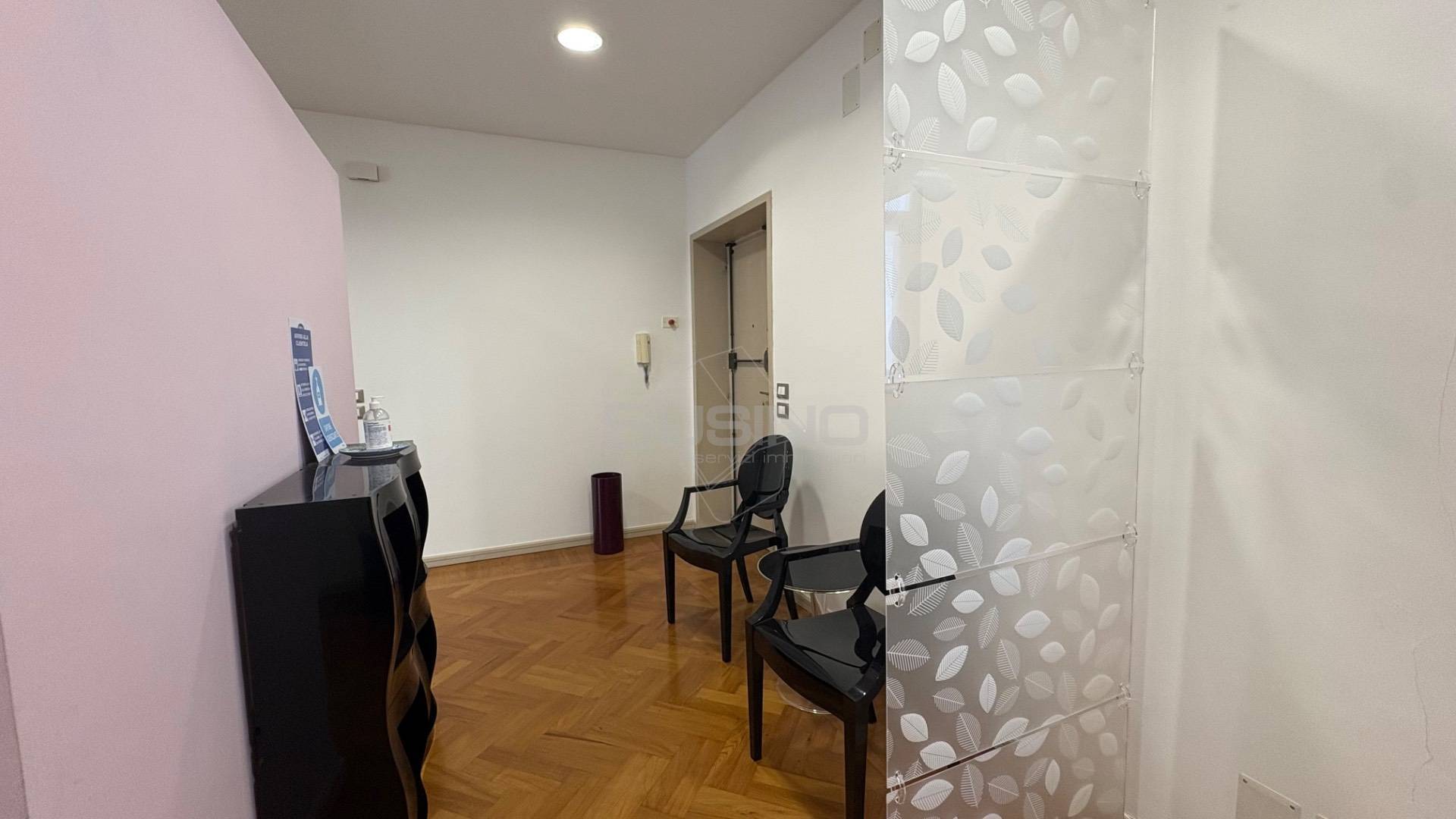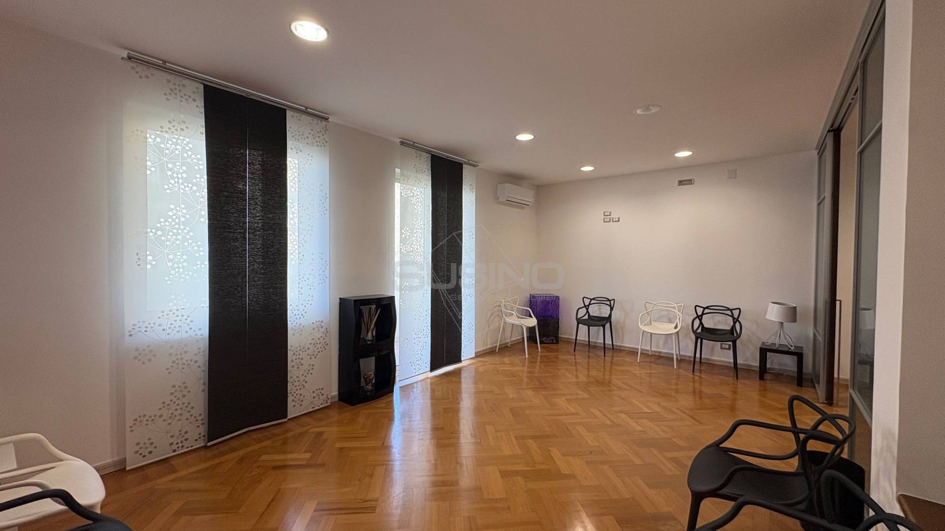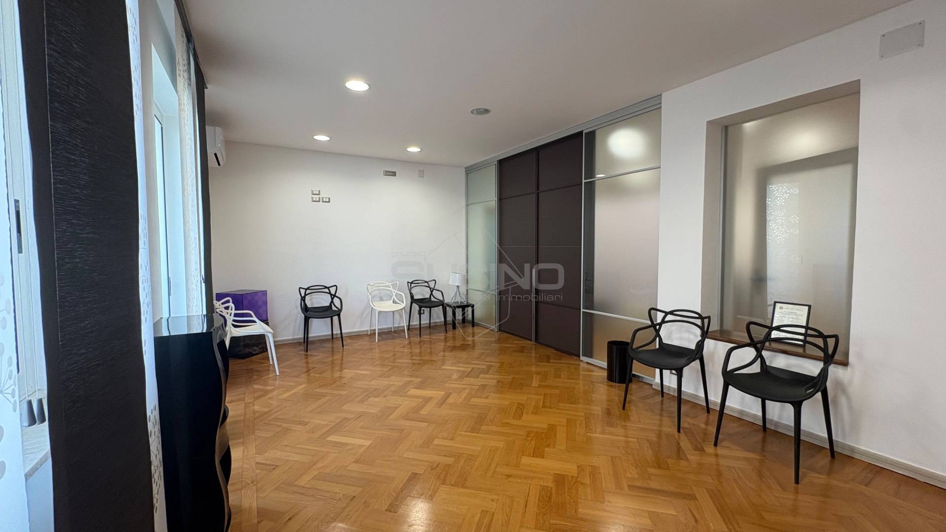 Internamente si presenta con ingresso su sala d'attesa e piccolo vano segreteria, mascherata da una quinta troviamo l'ampia sala meeting con affaccio sul balcone principale; a seguire un disimpegno ospita due camere e un vano utilizzabile come archivio/spogliatoio; completano la superficie due bagni, ed un ampio vano utilizzabile anche come sala relax o piccola sala riunioni.