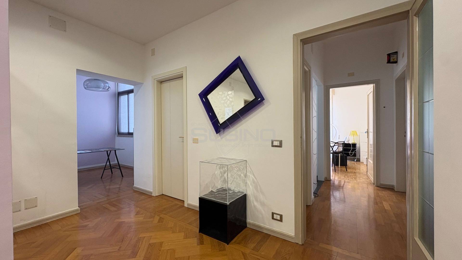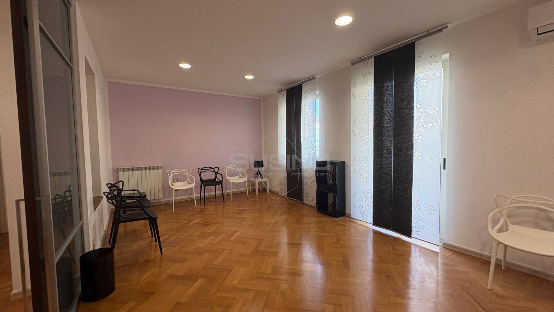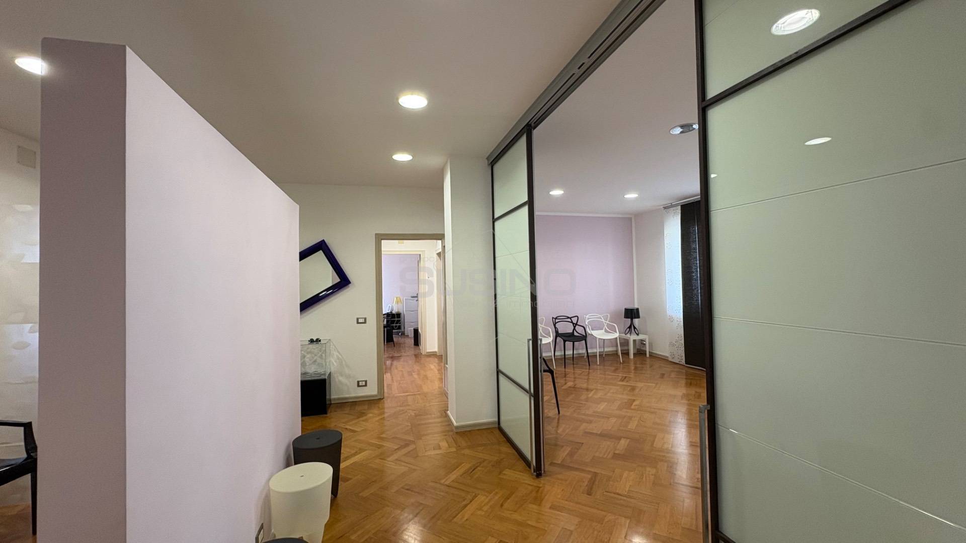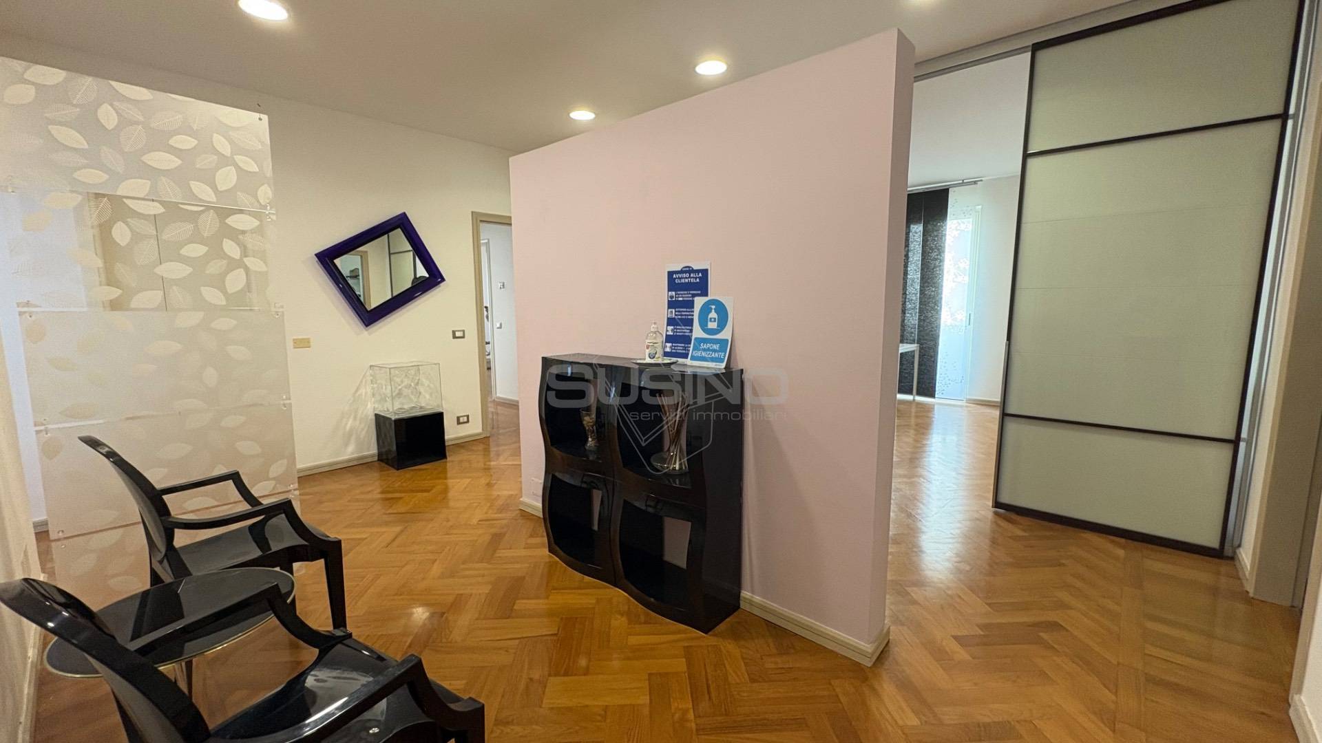 Internamente si presenta con ingresso su sala d'attesa e piccolo vano segreteria, mascherata da una quinta troviamo l'ampia sala meeting con affaccio sul balcone principale; a seguire un disimpegno ospita due camere e un vano utilizzabile come archivio/spogliatoio; completano la superficie due bagni, ed un ampio vano utilizzabile anche come sala relax o piccola sala riunioni.
