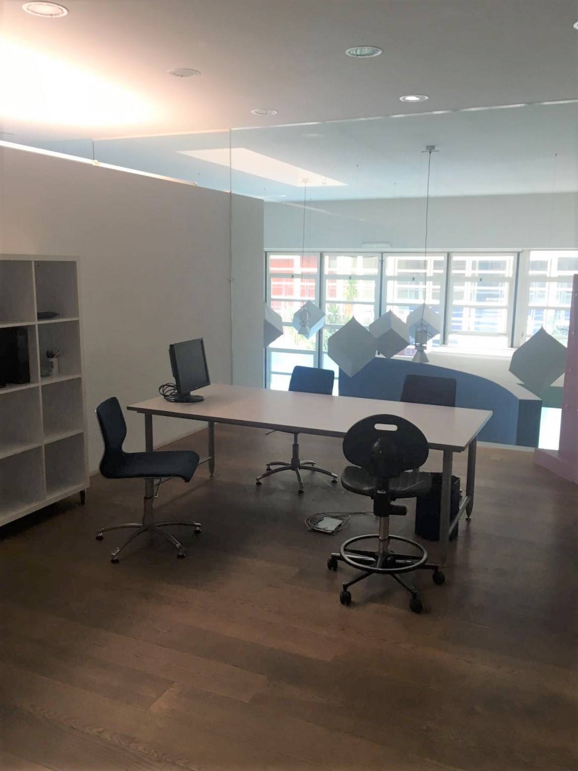 Posizionato al piano terra, Il locale si divide in un ampio open space frazionato elegantemente da vetrate scorrevoli in piu' zone di lavoro, due ampi uffici su soppalco con pareti di cristallo, locale archivio e Bagni.