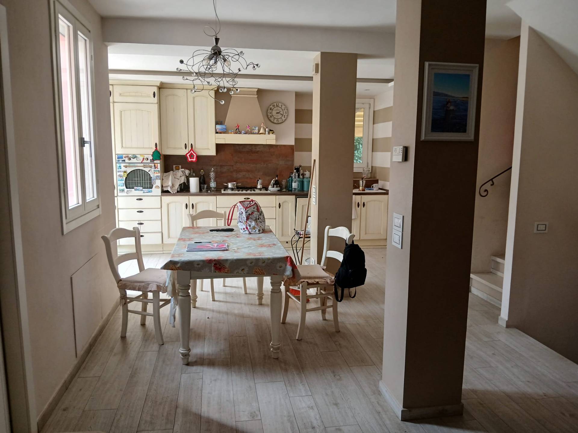 Al piano terra, un luminoso soggiorno con cucina a vista si apre sulla zona giorno, creando un ambiente accogliente e funzionale.