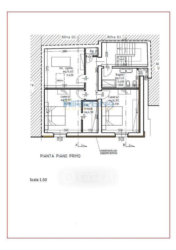 Tramite le scale interne si accede al primo piano dove troviamo due ampie camere matrimoniali, di cui una con cabina armadi, oltre a grande vano utilizzabile come terza camera, bagno con doccia e vasca e un comodo ripostiglio.