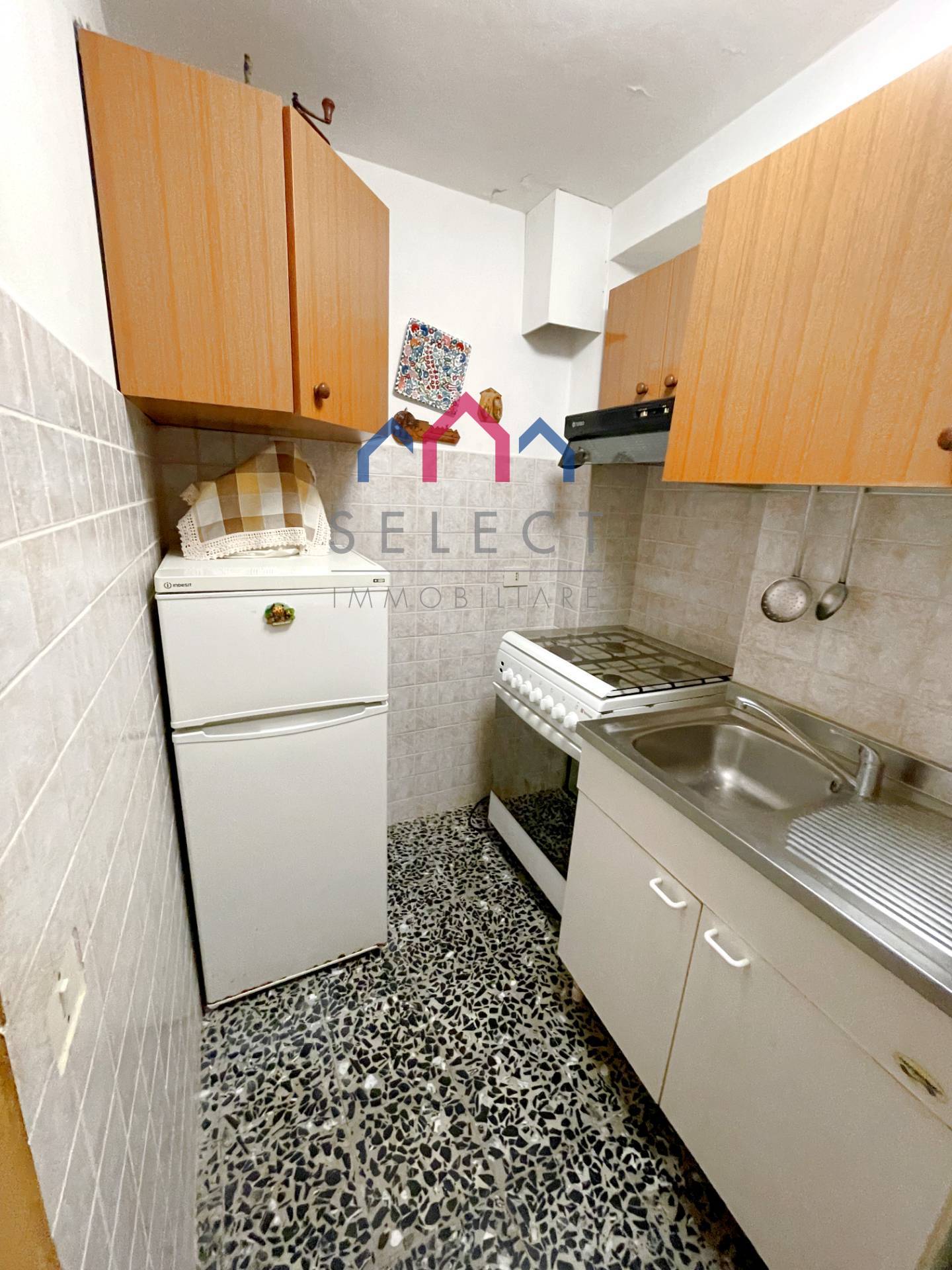 Al piano terra entriamo direttamente nella zona giorno con cucinotto e scala a chiocciola per l'accesso ai piani superiori.