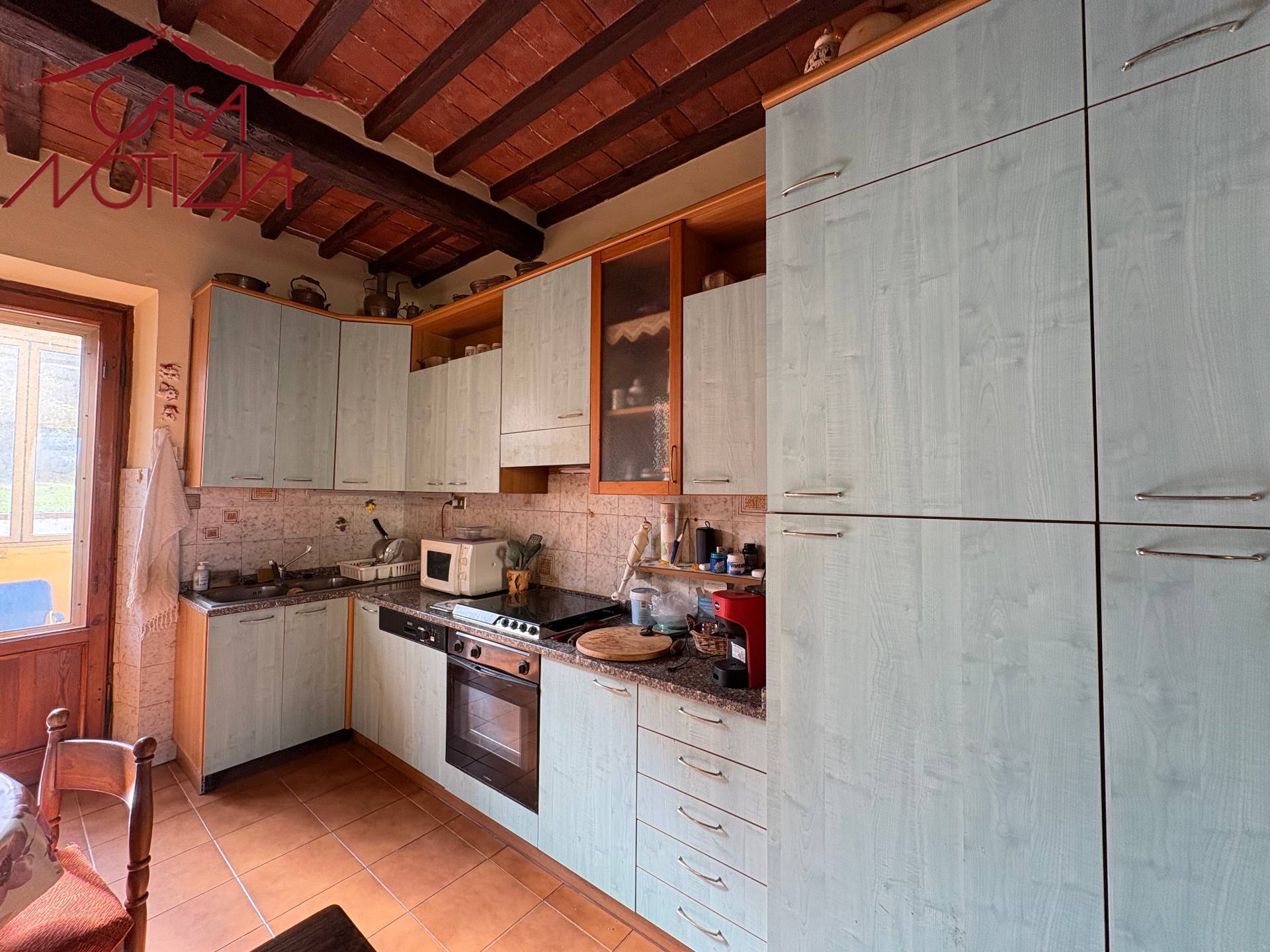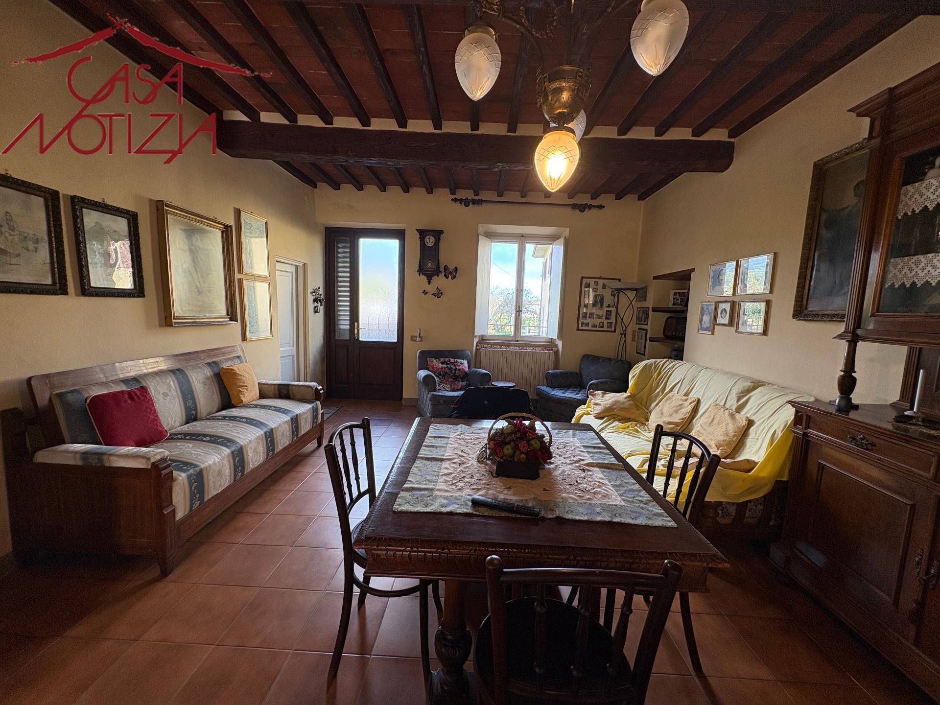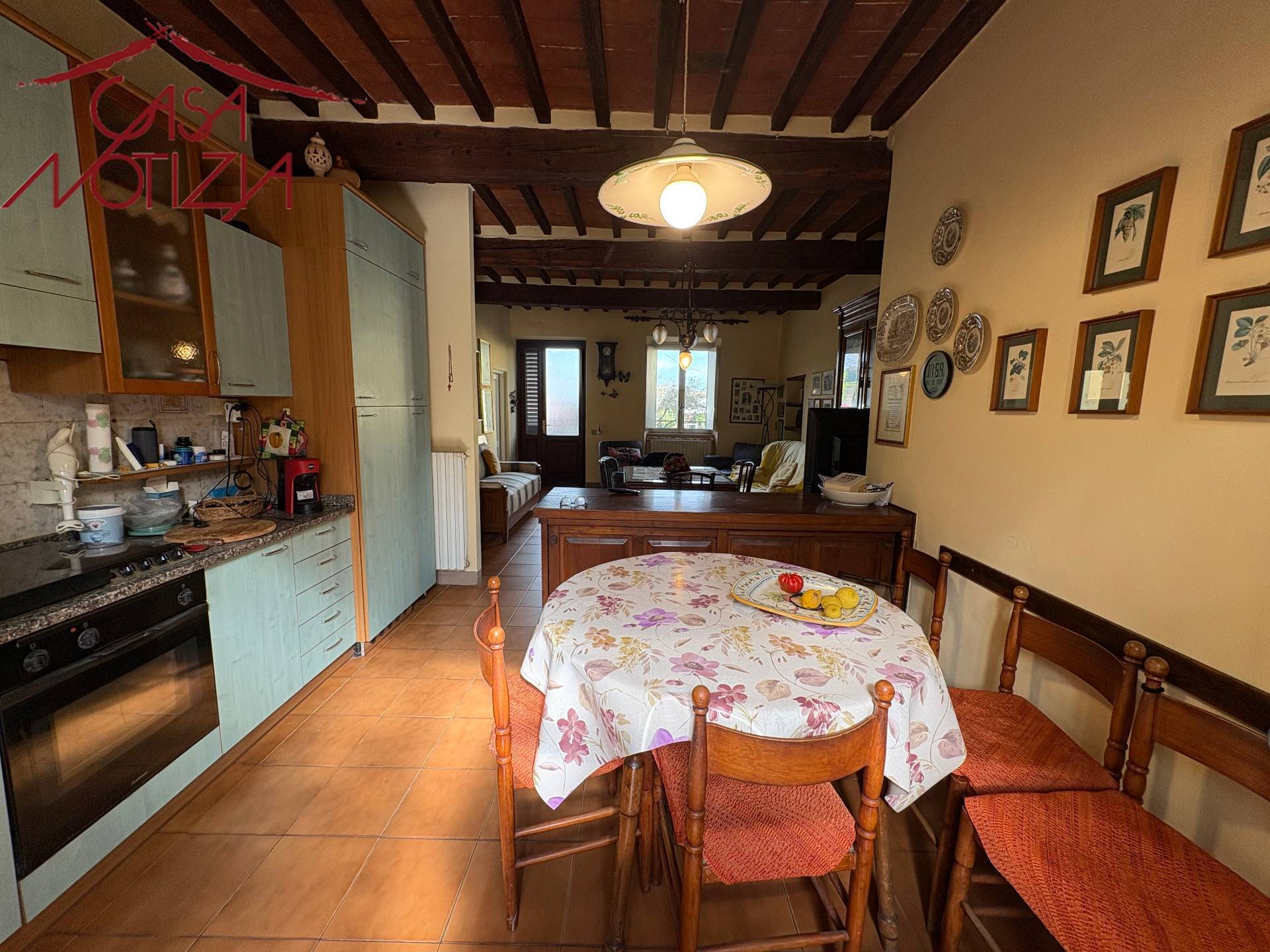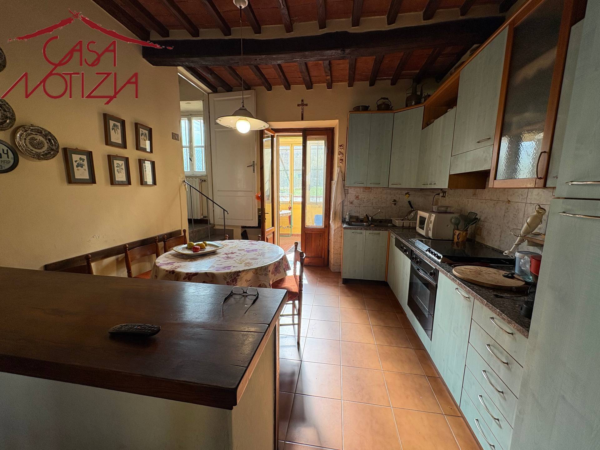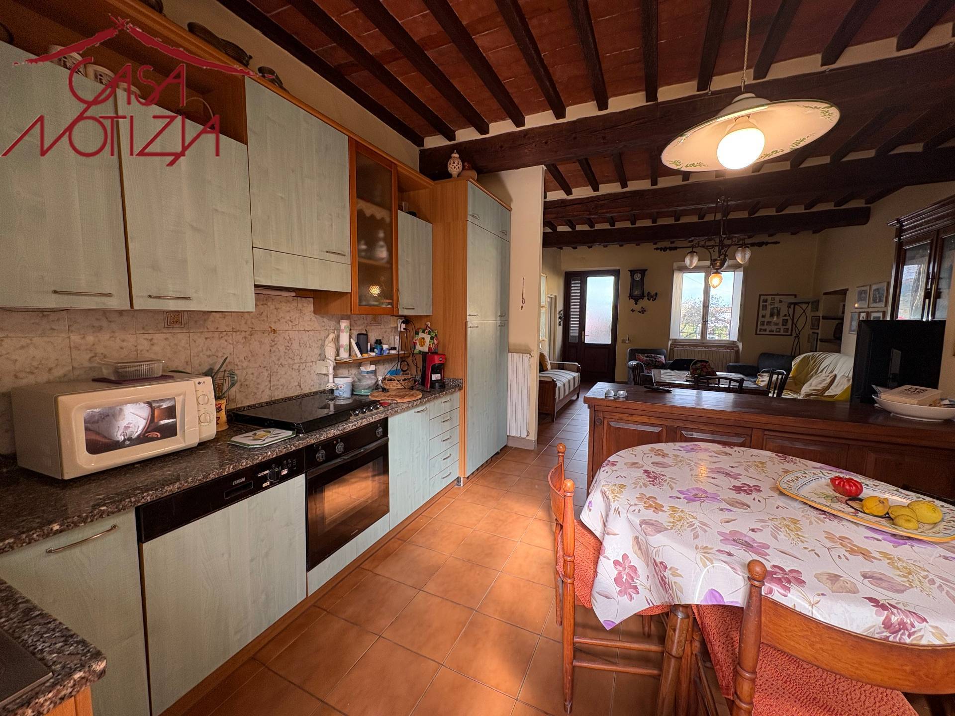 Labitazione conserva tutto il fascino del rustico toscano, con travi a vista e pavimenti in cotto antico ai piani superiori.