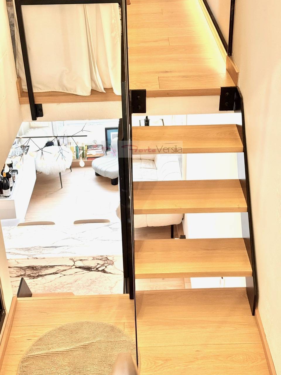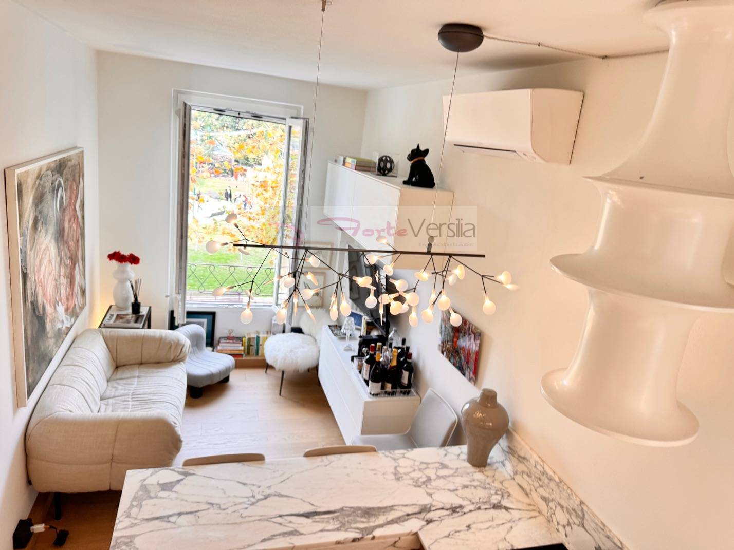 Splendida zona giorno open space che si affaccia sul centro di Forte con vista mare con cucina in Rovere e piano in marmo di Carrara, completamente attrezzata (lavastoviglie, induzione, forno, frigo bar) e bagno di servizio Elegante camera matrimoniale con bagno privato in suite.
