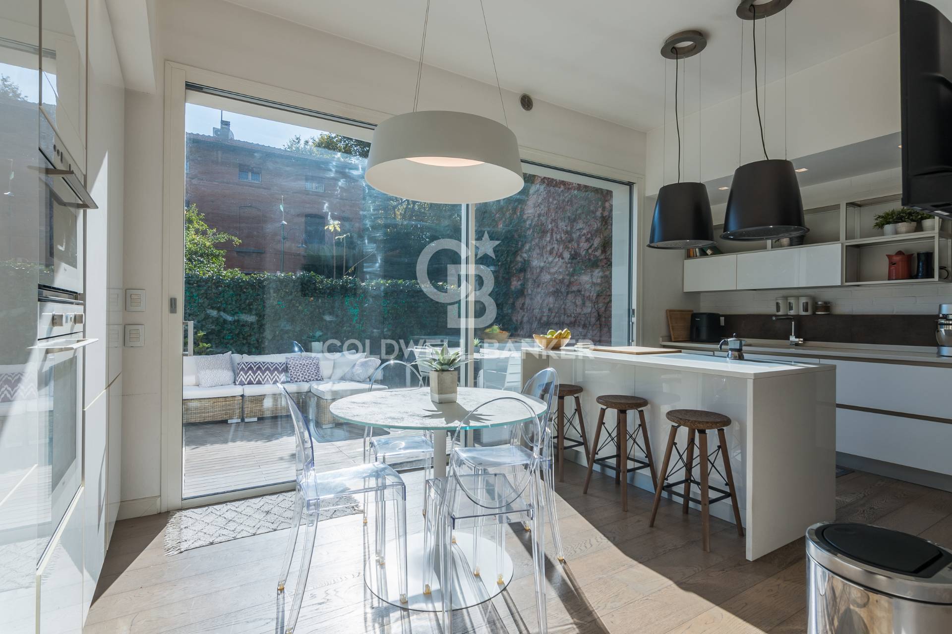 Al piano terra troviamo unelegante cucina abitabile con accesso diretto alla corte esterna e vista sulla piscina, unampia zona living con camino, uno studio, due bagni e una camera.