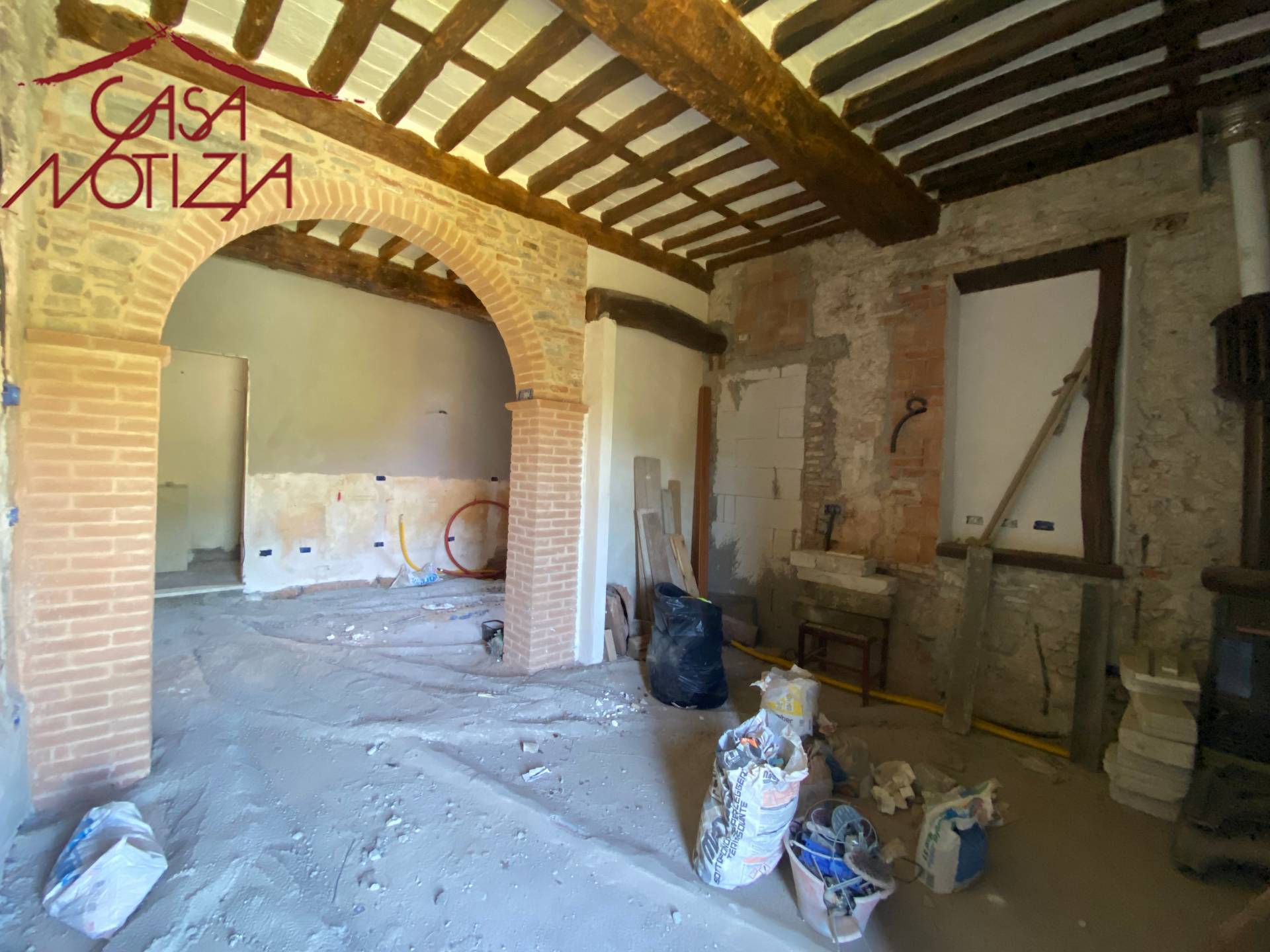 Al piano terra troviamo un ampio soggiorno e una cucina divisi da bell'arco in mezzane.