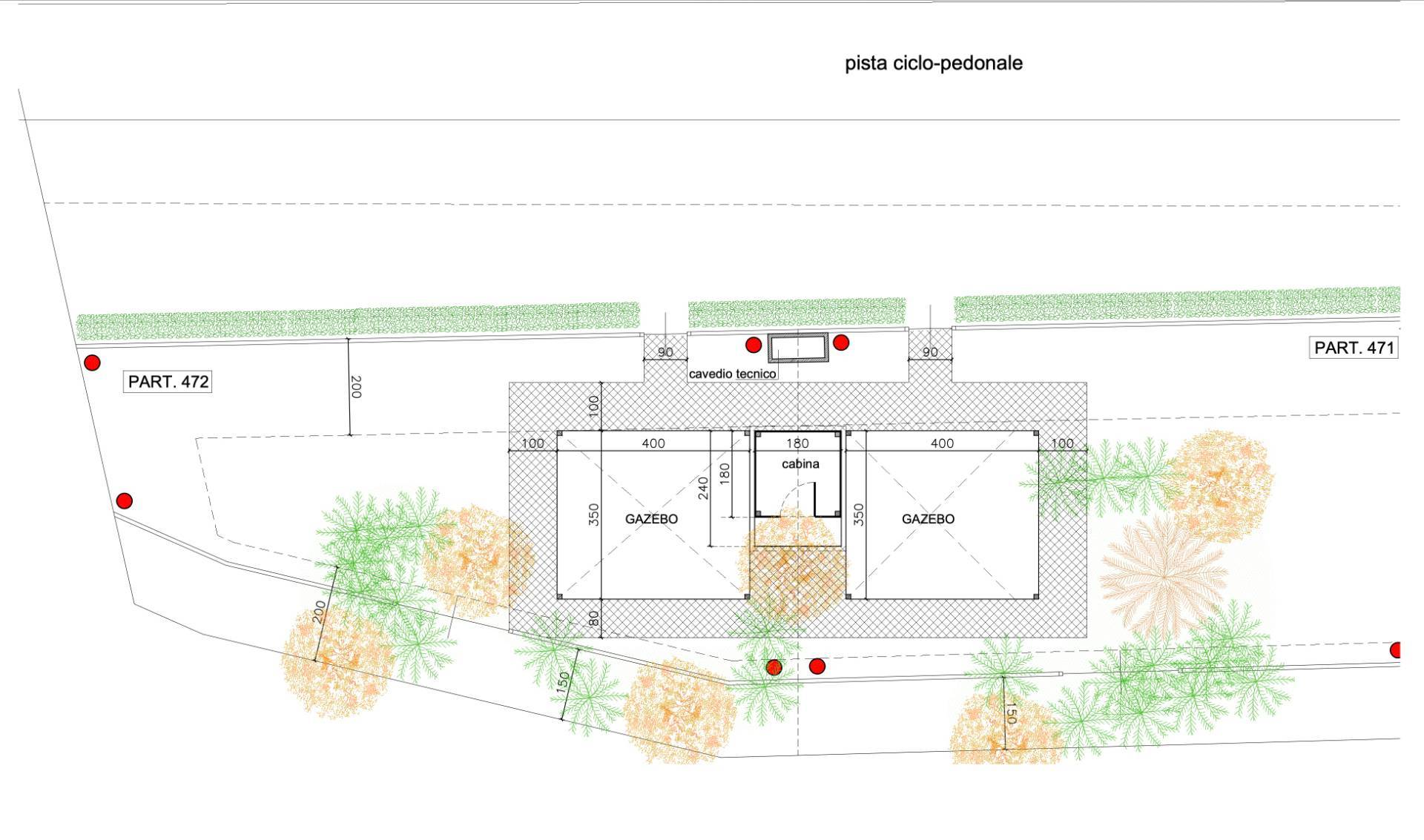 Sull'appezzamento di terreno in oggetto possibile realizzare una cabina delle dimensioni di 1,80 x 1,80 metri oltre due gazebo ciascuno di 14 mq: totale superficie coperta sul lotto: 31,24 metri.