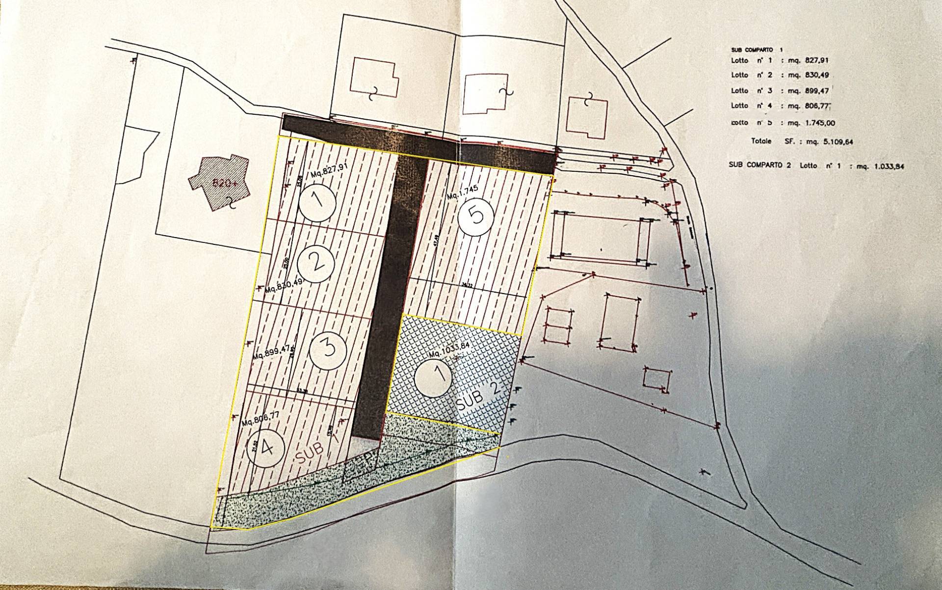 Complessivamente si possono realizzare 6 lotti da 800 mq circa cadauno, su ogni lotto si possono sviluppare 400 mq di costruzione, le utenze sono tutte su strada, il comune richiede la realizzazione di una strada centrale a servizio dei lotti ed una piccola area verde verso la strada, il tutto meglio rappresentato dal piano di lottizzazione allegato.