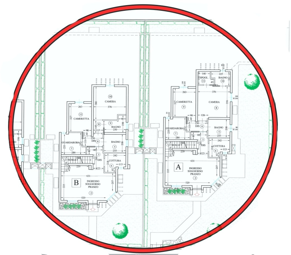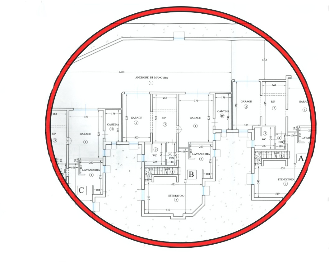 primo, 700 mq di interrato destinato a garage e rustici oltre circa 1270 mq rimanenti destinati a portici, corti pavimentate e giardini.