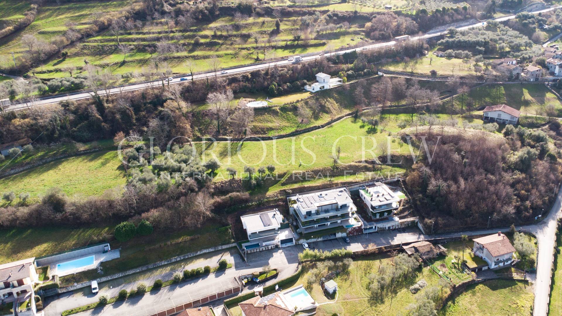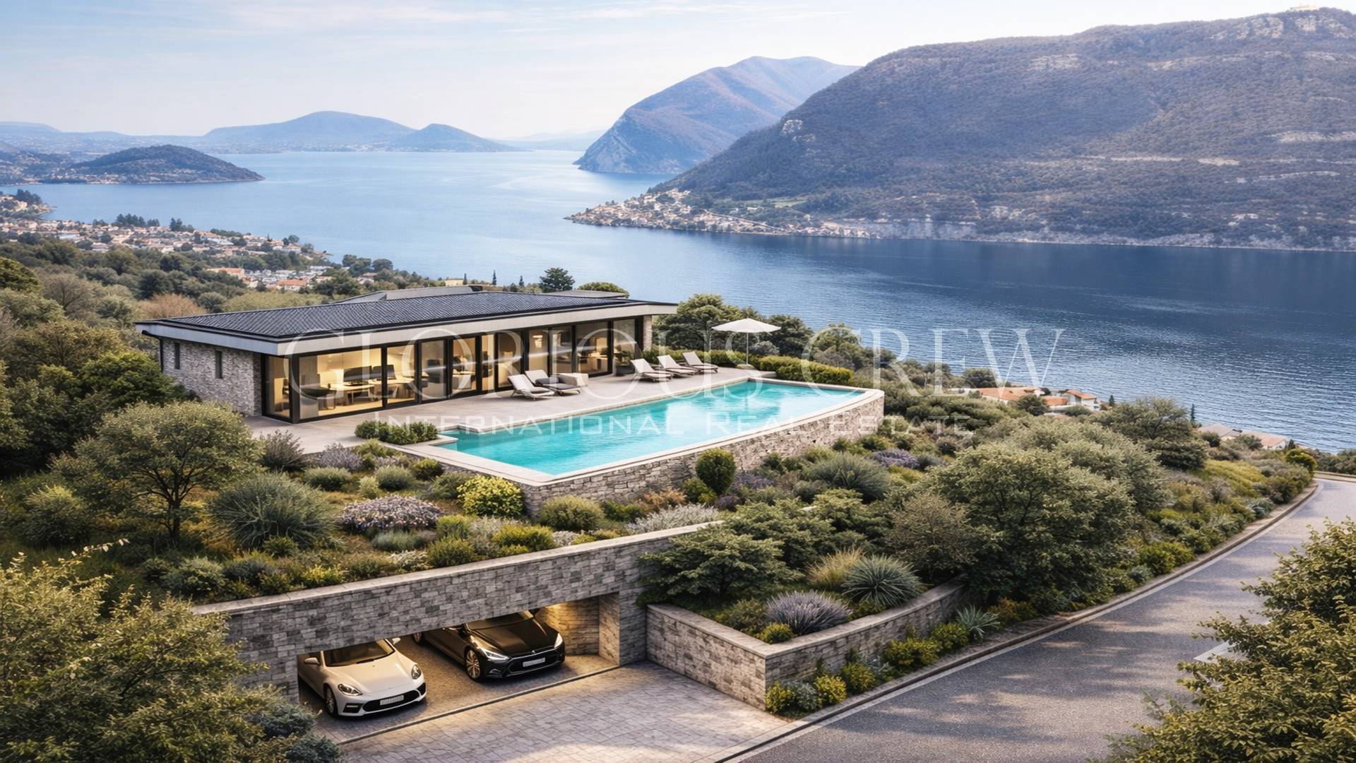 La conformazione del terreno, e la posizione sopraelevata rispetto alla strada, consentono soluzioni architettoniche di alto livello, con accesso carrabile e autorimesse a piano strada, mantenendo la totale apertura verso il lago e le montagne circostanti.