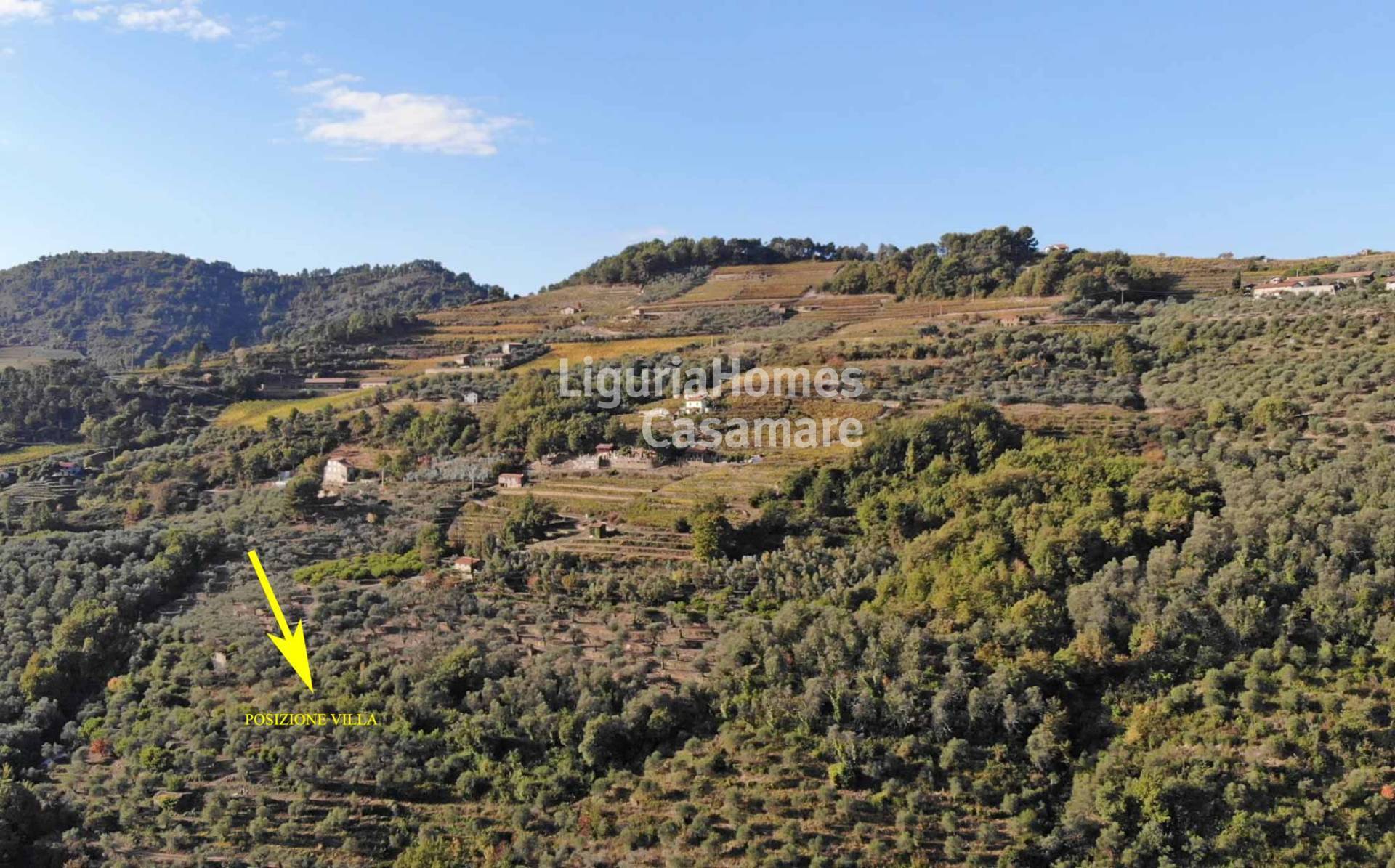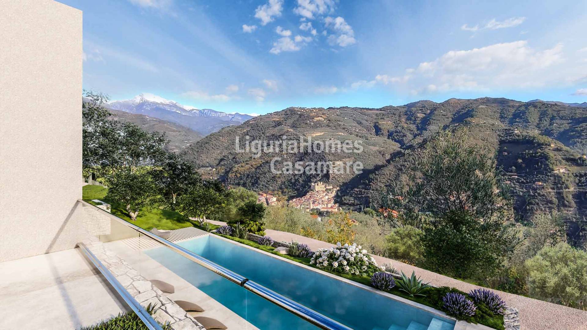 Sulla prima collina di fronte al caratteristico centro storico di Dolceacqua, vendita splendido terreno a fasce larghe comprensivo di un progetto approvato per la costruzione di una villa di 165 m2 in stile contemporaneo di rara bellezza, completa di piscina e con una vista incantevole, aperta sulla vallata e sul paese con il suo iconico Castello dei Doria.