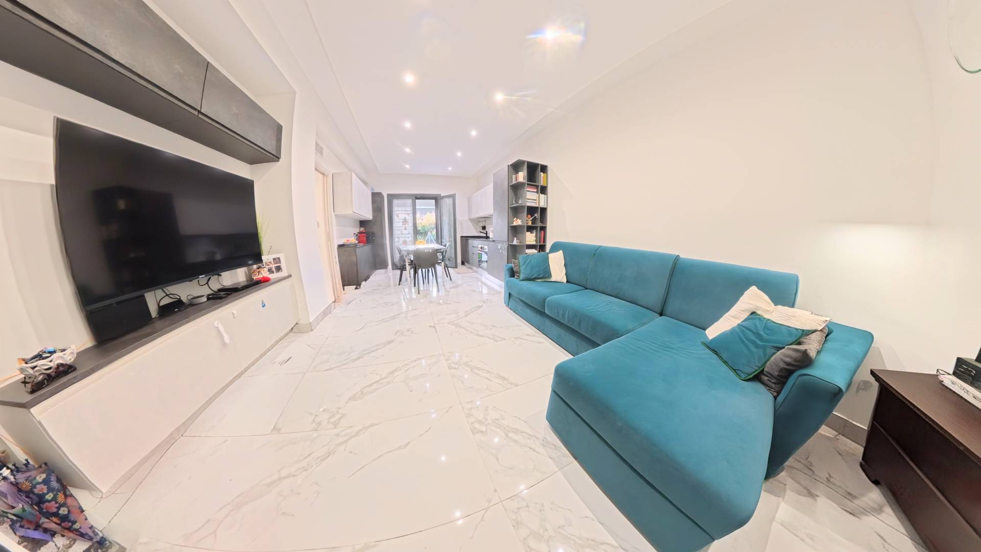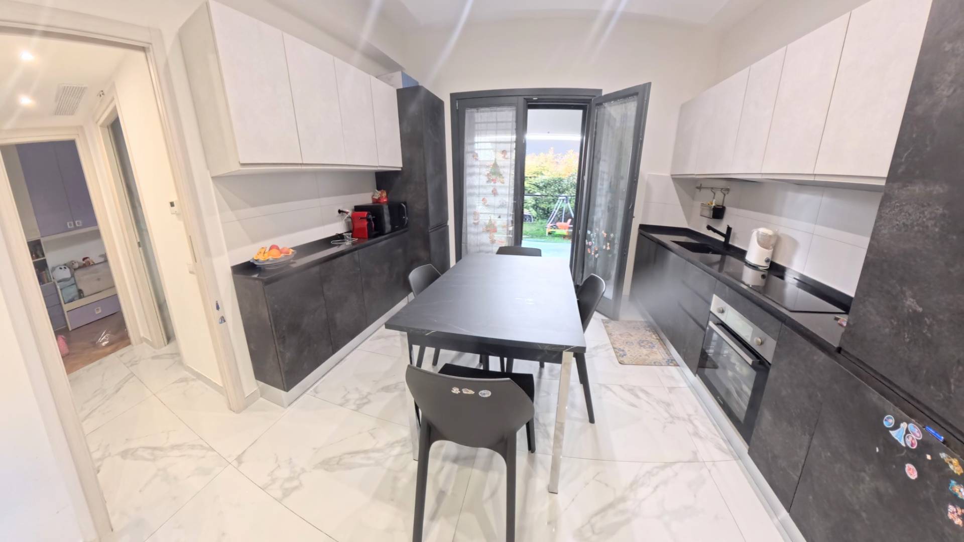 Si compone di: Ingresso che conduce ad un ampia zona giorno impreziosita da un angolo cottura moderno e funzionale, completamente nuovo.