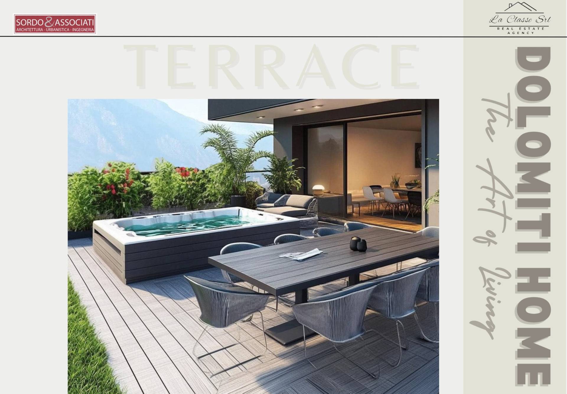 Dalla zona living si accede all'ampia terrazza verde esposta completamente a sud di mq 75, completa la propriet un giardino di 109 mq, una cantina e un posto auto interno.